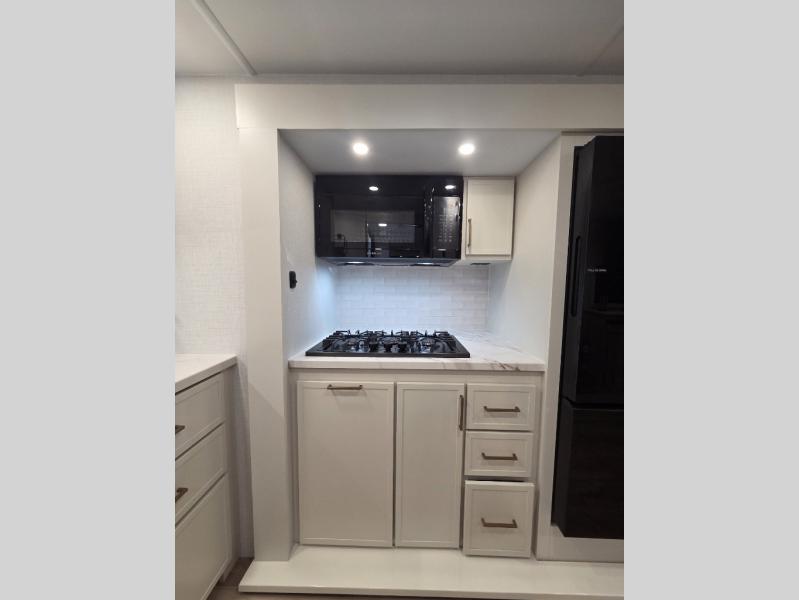 This is the perfect travel trailer for the couple looking for comfort at the campground! Once you've unloaded the pass-thru storage, you can put out the 17' patio awning and relax in your camp chairs. Head inside to make lunch in the fully-equipped kitchen that incudes a range, 30" convection microwave, and dishwasher prep. There is a pantry with outlets within the large slide out, along with a 10 cu. ft. refrigerator that you can access with the slide in, plus theater seating across from the TV. And if you need sleeping space for guests, just choose the optional tri-fold sofa in place of the theater seating! A pull-out table with a drawer provides a place to dine together, and the entryway closet will be perfect to keep jackets and shoes tidy. You'll get a great night's rest on the front queen bed with four drawers, nightstand cubbies, and a room divider for a little more privacy.