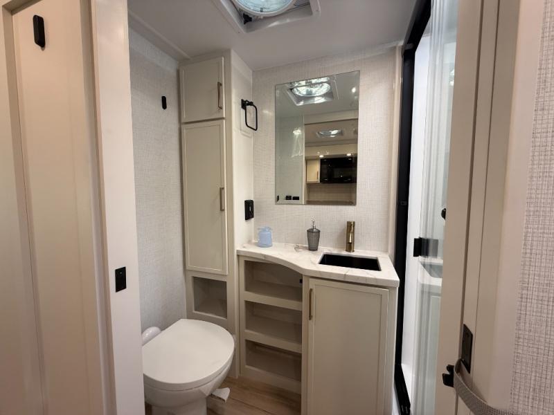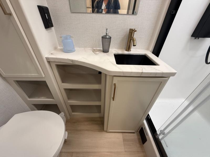 This is the perfect travel trailer for the couple looking for comfort at the campground! Once you've unloaded the pass-thru storage, you can put out the 17' patio awning and relax in your camp chairs. Head inside to make lunch in the fully equipped kitchen that includes a three-burner range, 30" convection microwave, and dishwasher prep. There is a pantry with outlets within the large slide out, along with a 10-cu. ft. refrigerator that you can access with the slide in, plus theater seating across from the TV. And if you need sleeping space for guests, just choose the optional tri-fold sofa in place of the theater seating! A pull-out table with a drawer provides a place to dine together, and the entryway closet will be perfect to keep jackets and shoes tidy. You'll get a great night's rest on the front queen bed with four drawers, nightstand cubbies, and a room divider for a little more privacy.
