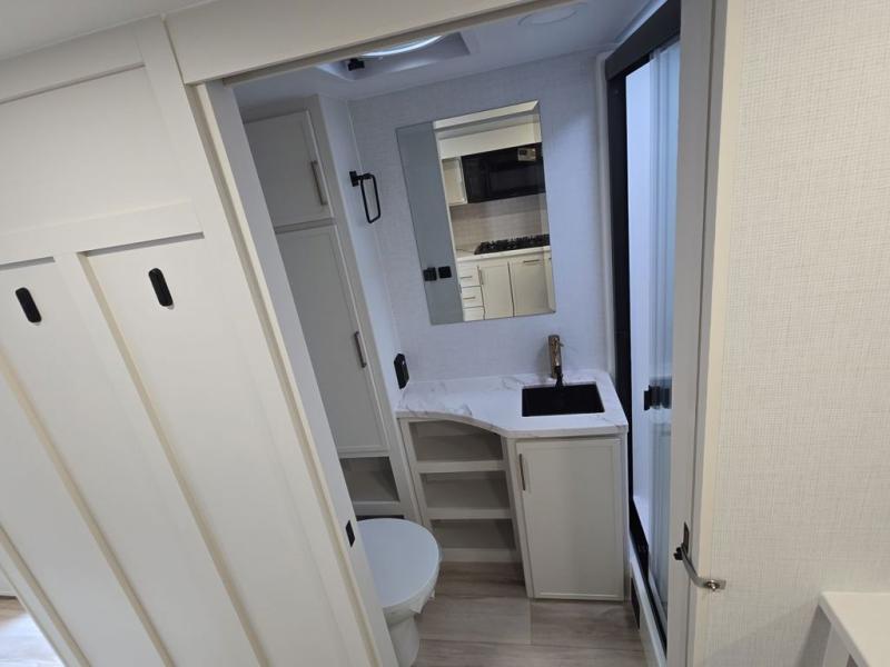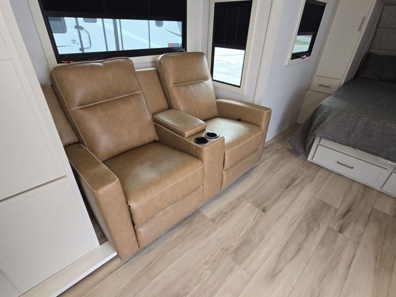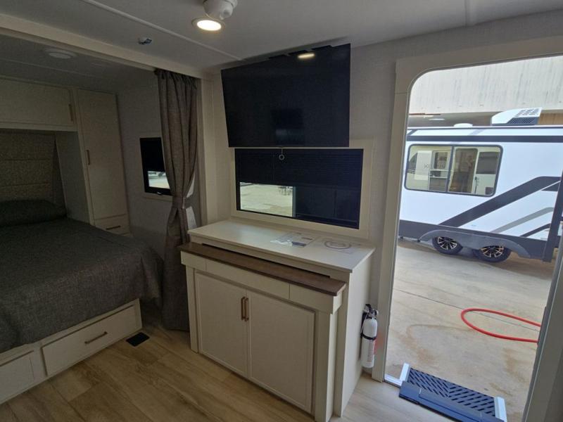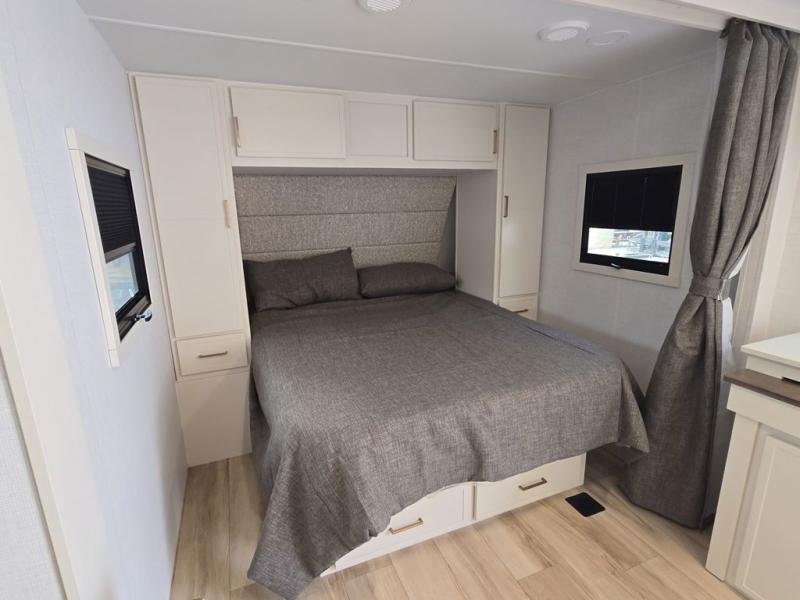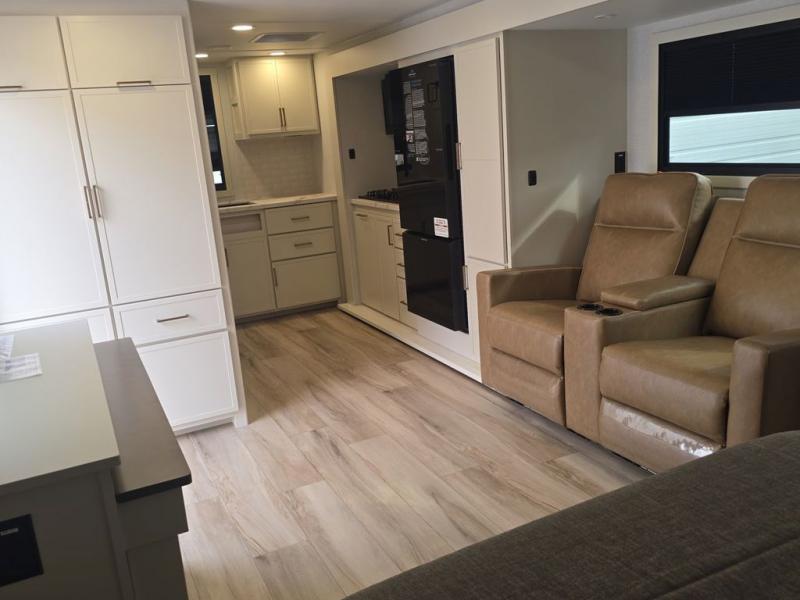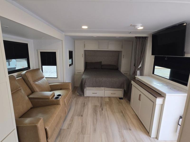 This is the perfect travel trailer for the couple looking for comfort at the campground! Once you've unloaded the pass-thru storage, you can put out the 17' patio awning and relax in your camp chairs. Head inside to make lunch in the fully equipped kitchen that includes a three-burner range, 30" convection microwave, and dishwasher prep. There is a pantry with outlets within the large slide out, along with a 10-cu. ft. refrigerator that you can access with the slide in, plus theater seating across from the TV. And if you need sleeping space for guests, just choose the optional tri-fold sofa in place of the theater seating! A pull-out table with a drawer provides a place to dine together, and the entryway closet will be perfect to keep jackets and shoes tidy. You'll get a great night's rest on the front queen bed with four drawers, nightstand cubbies, and a room divider for a little more privacy.