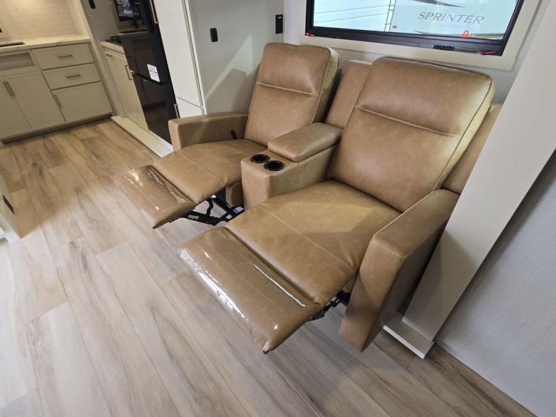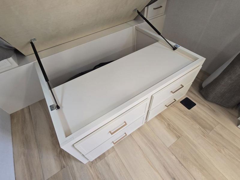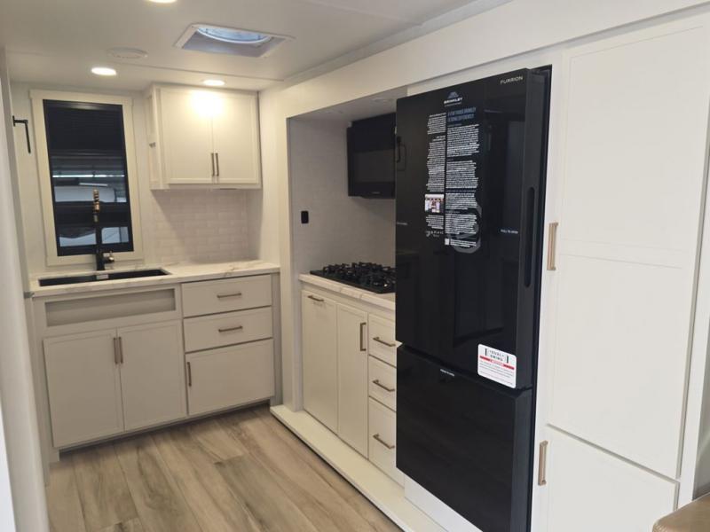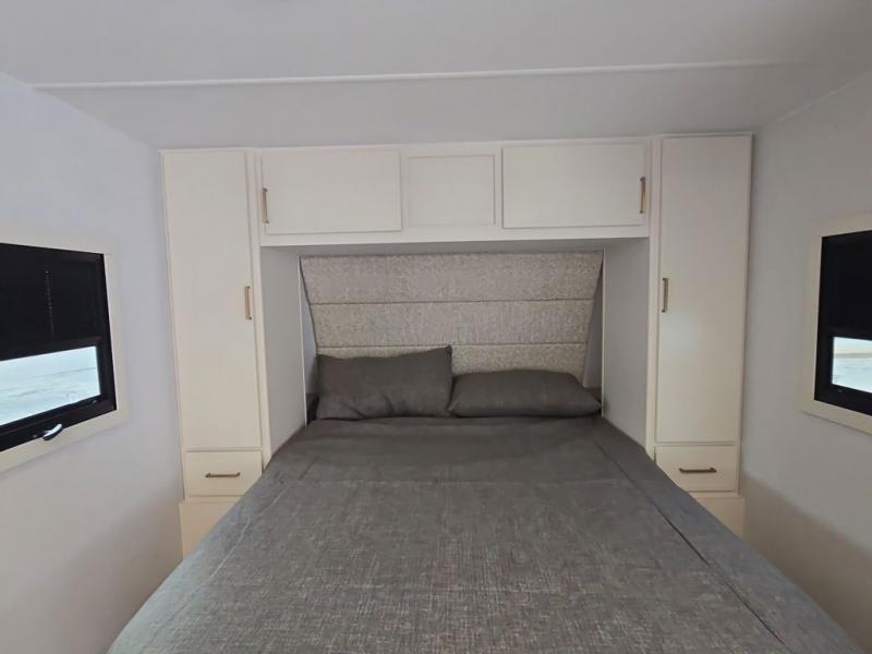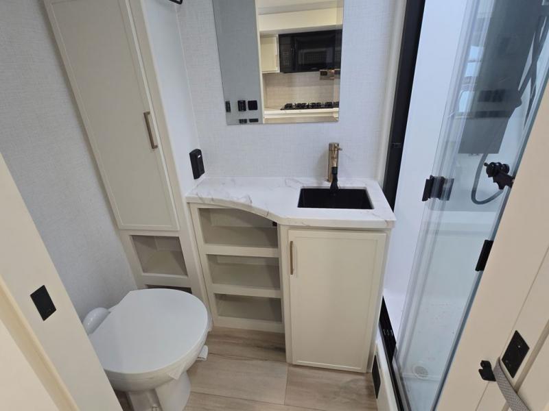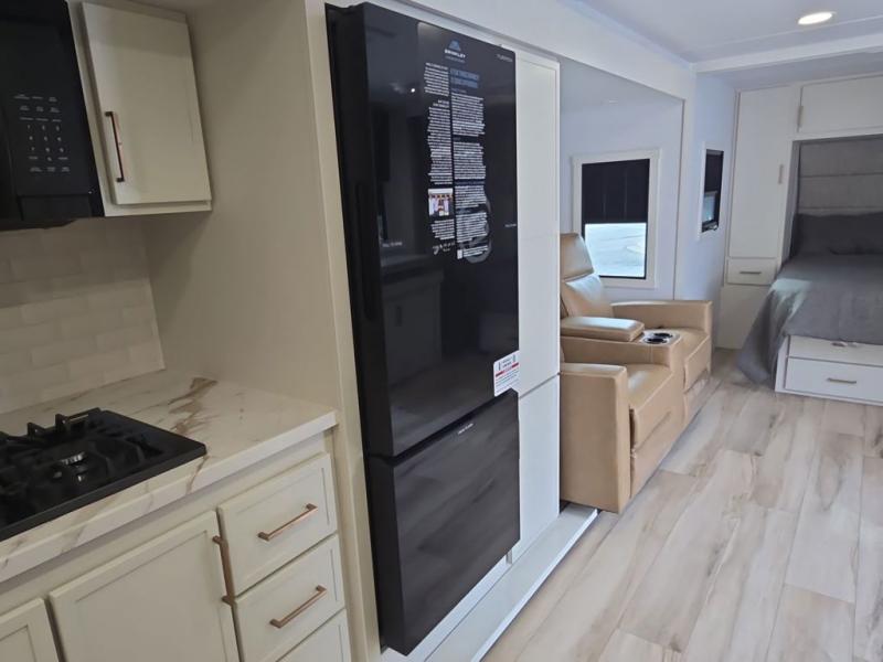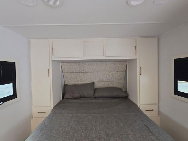 This is the perfect travel trailer for the couple looking for comfort at the campground! Once you've unloaded the pass-thru storage, you can put out the 17' patio awning and relax in your camp chairs. Head inside to make lunch in the fully equipped kitchen that includes a three-burner range, 30" convection microwave, and dishwasher prep. There is a pantry with outlets within the large slide out, along with a 10-cu. ft. refrigerator that you can access with the slide in, plus theater seating across from the TV. And if you need sleeping space for guests, just choose the optional tri-fold sofa in place of the theater seating! A pull-out table with a drawer provides a place to dine together, and the entryway closet will be perfect to keep jackets and shoes tidy. You'll get a great night's rest on the front queen bed with four drawers, nightstand cubbies, and a room divider for a little more privacy.
