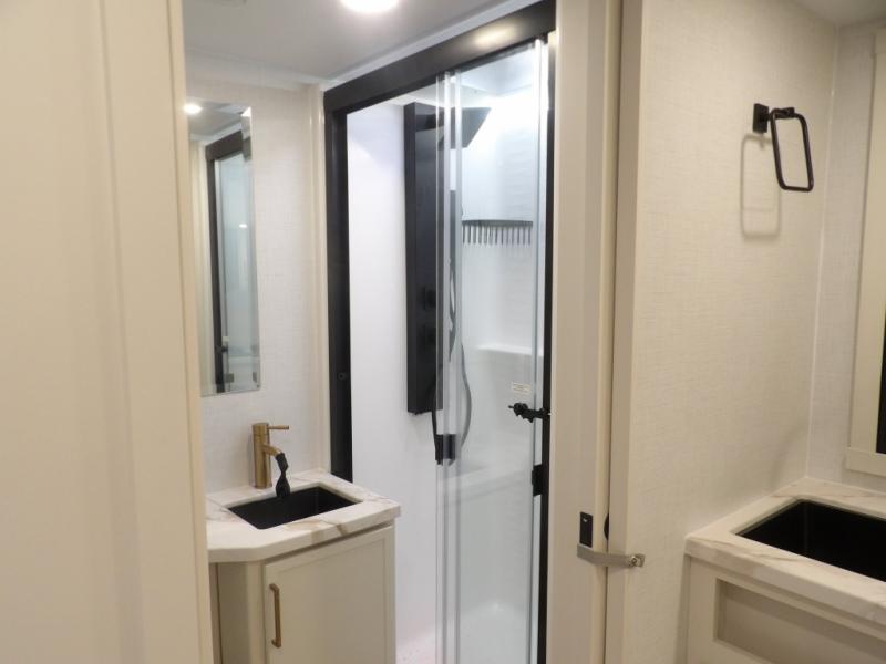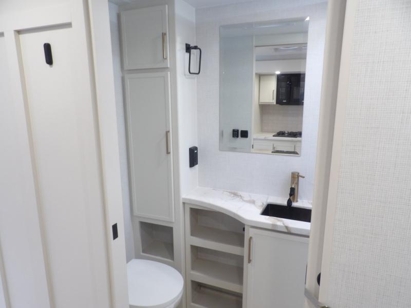 This is the perfect travel trailer for the couple looking for comfort at the campground! Once you've unloaded the pass-thru storage, you can put out the 17' patio awning and relax in your camp chairs. Head inside to make lunch in the fully equipped kitchen that includes a three-burner range, 30" convection microwave, and dishwasher prep. There is a pantry with outlets within the large slide out, along with a 10-cu. ft. refrigerator that you can access with the slide in, plus theater seating across from the TV. And if you need sleeping space for guests, just choose the optional tri-fold sofa in place of the theater seating! A pull-out table with a drawer provides a place to dine together, and the entryway closet will be perfect to keep jackets and shoes tidy. You'll get a great night's rest on the front queen bed with four drawers, nightstand cubbies, and a room divider for a little more privacy.