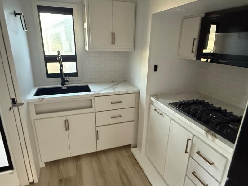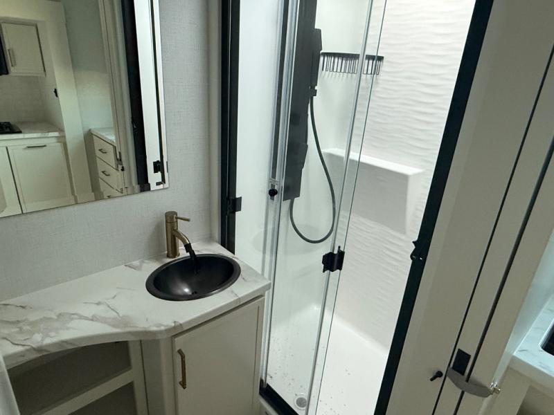 This is the perfect travel trailer for the couple looking for comfort at the campground! Once you've unloaded the pass-thru storage, you can put out the 17' patio awning and relax in your camp chairs. Head inside to make lunch in the fully-equipped kitchen that incudes a range, 30" convection microwave, and dishwasher prep. There is a pantry with outlets within the large slide out, along with a 10 cu. ft. refrigerator that you can access with the slide in, plus theater seating across from the TV. And if you need sleeping space for guests, just choose the optional tri-fold sofa in place of the theater seating! A pull-out table with a drawer provides a place to dine together, and the entryway closet will be perfect to keep jackets and shoes tidy. You'll get a great night's rest on the front queen bed with four drawers, nightstand cubbies, and a room divider for a little more privacy.