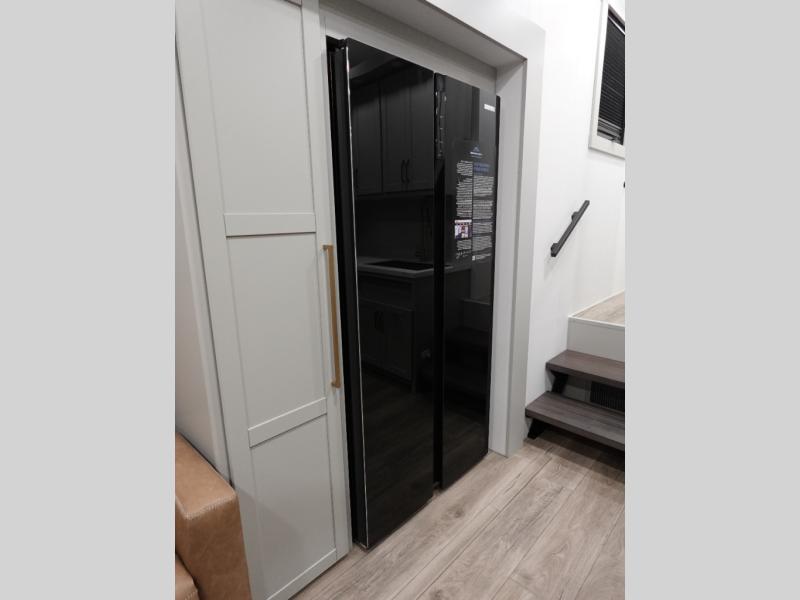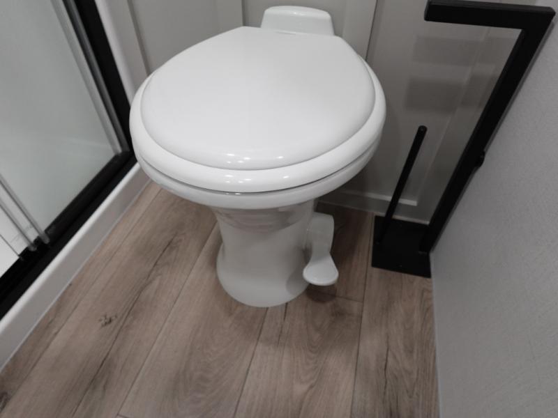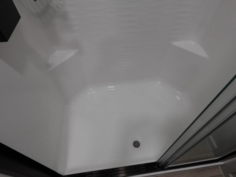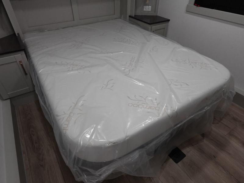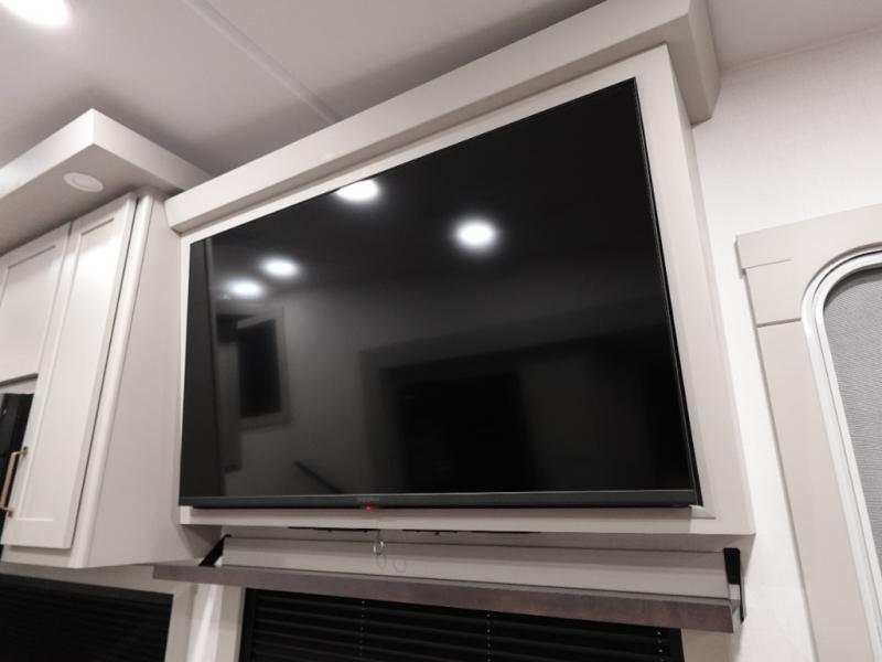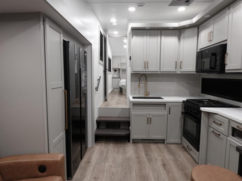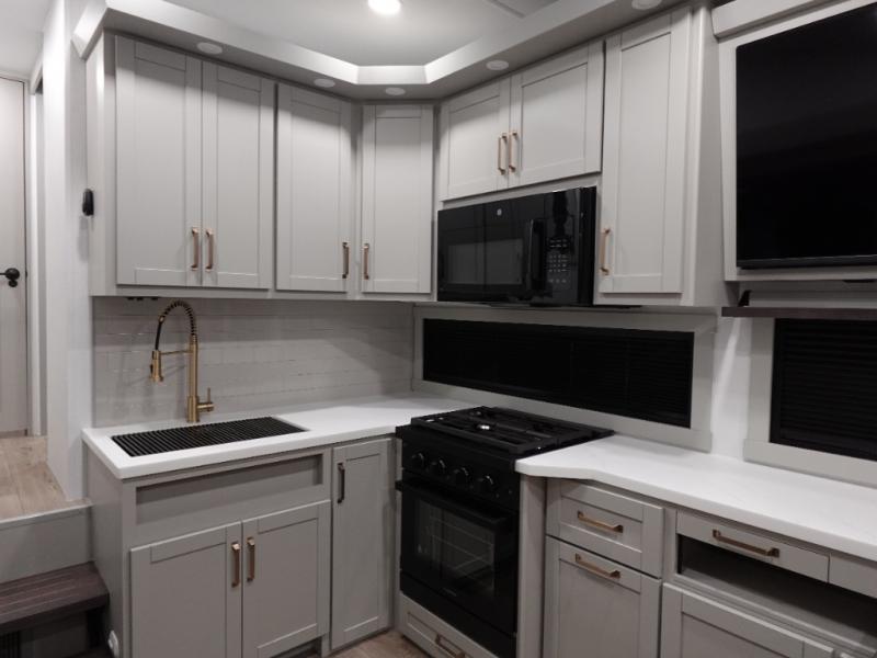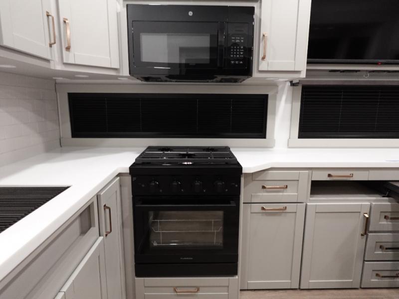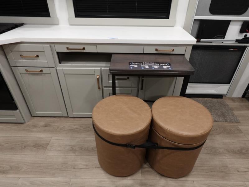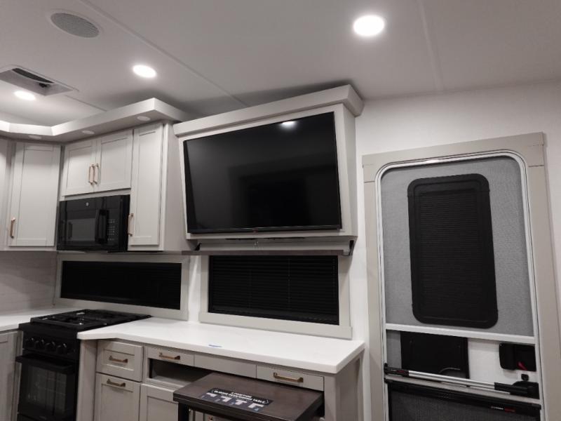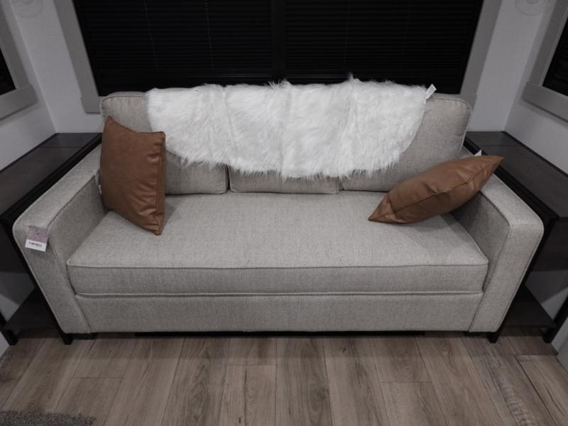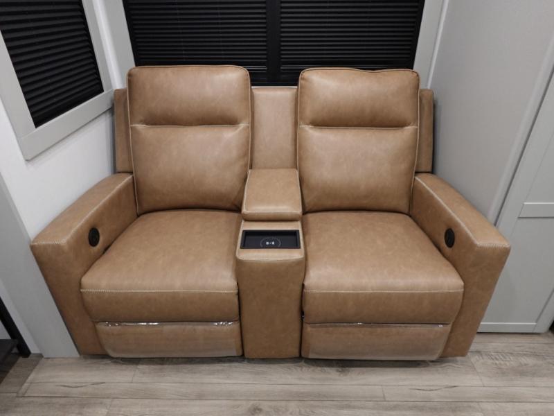 You'll love every minute spent in this luxury fifth wheel! Your crew can get comfortable in the rear living room on the 72" tri-fold sofa that converts to a 62" x 70" bed, or on the theater seating within the slide out. There is also a sliding dining table and a TV with swivel so everyone can have a good view of the movie. A full kitchen, complete with a cooktop, 30" residential microwave, and 16 cu. ft. refrigerator will let you cook and store food, and there is a handy trash bin with a Stow N' Go paper towel holder for easy clean up. The full bath will let you freshen up before heading to bed in the front private bedroom!