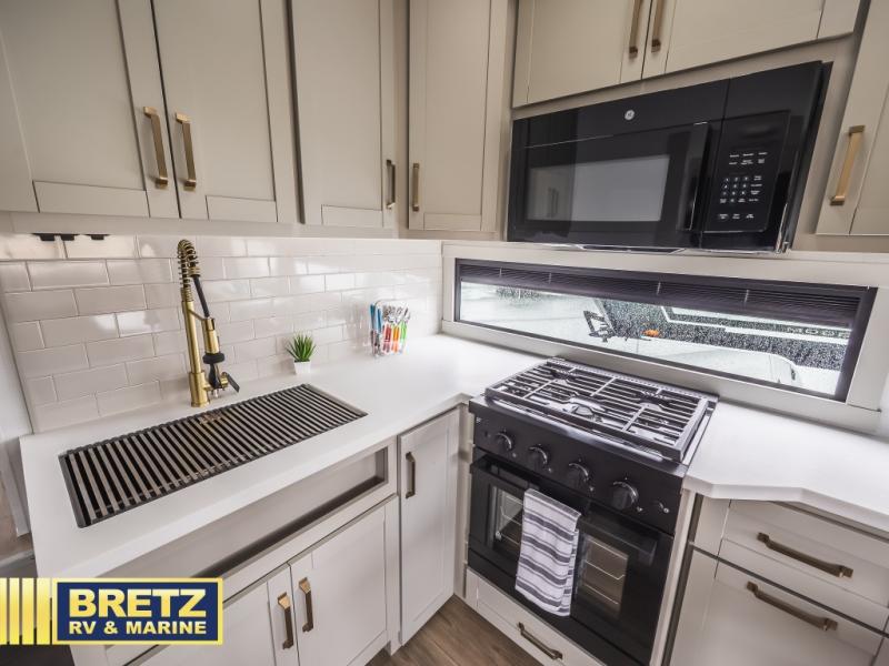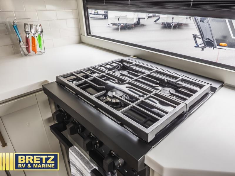 You'll love every minute spent in this luxury fifth wheel! Your crew can get comfortable in the rear living room on the 72" tri-fold sofa that converts to a 62" x 70" bed, or on the theater seating within the slide out. There is also a sliding dining table and a TV with swivel so everyone can have a good view of the movie. A full kitchen, complete with a cooktop, 30" residential microwave, and 16 cu. ft. refrigerator will let you cook and store food, and there is a handy trash bin with a Stow N' Go paper towel holder for easy clean up. The full bath will let you freshen up before heading to bed in the front private bedroom!