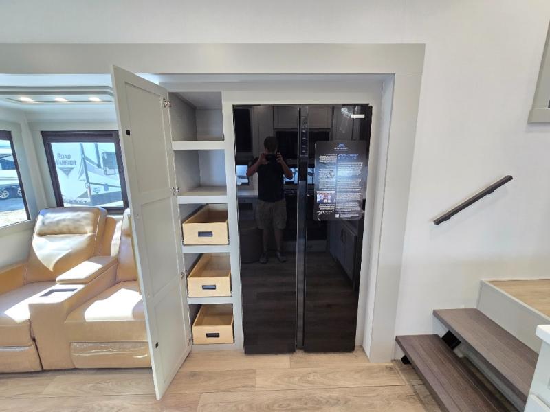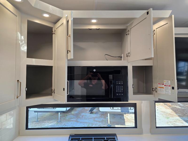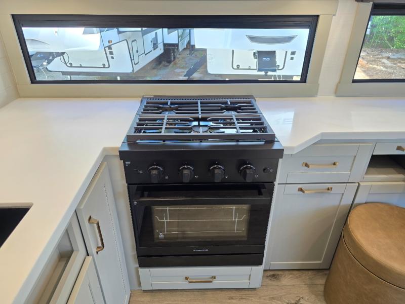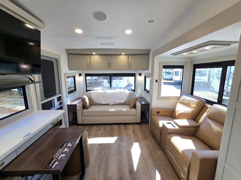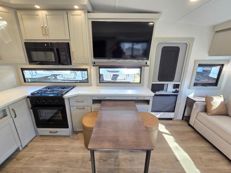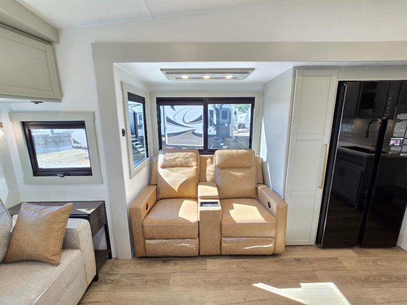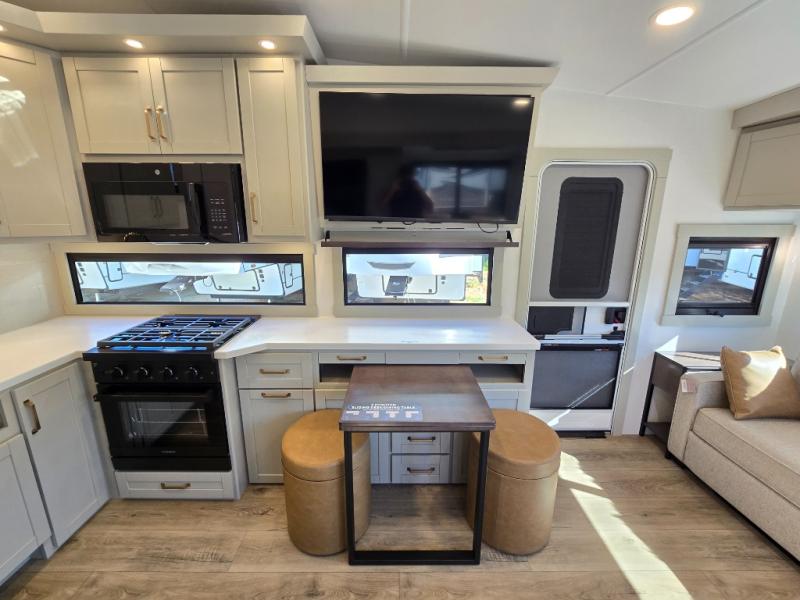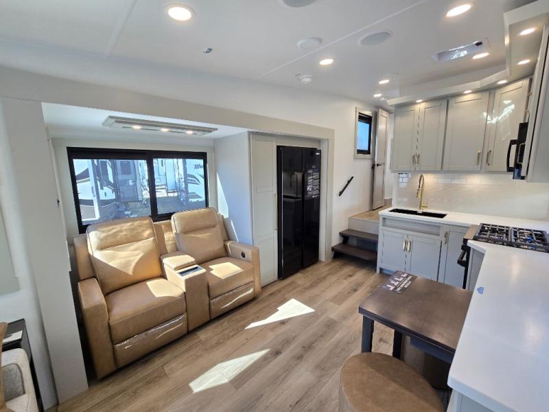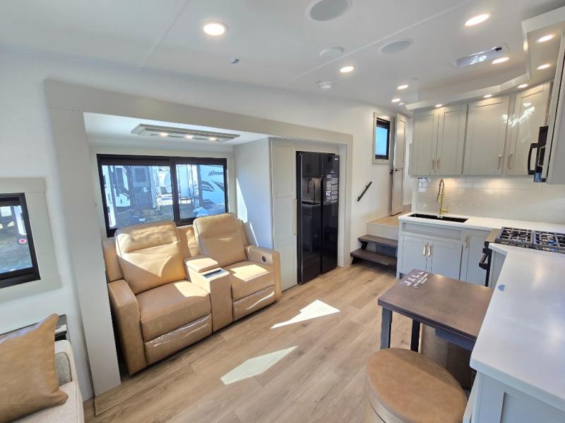 You'll love every minute spent in this luxury fifth wheel! Your crew can get comfortable in the rear living room on the 72" tri-fold sofa that converts to a 62" x 70" bed, or on the theater seating within the slide out. There is also a sliding dining table and a TV with swivel so everyone can have a good view of the movie. A full kitchen, complete with a cooktop, 30" residential microwave, and 16 cu. ft. refrigerator will let you cook and store food, and there is a handy trash bin with a Stow N' Go paper towel holder for easy clean up. The full bath will let you freshen up before heading to bed in the front private bedroom!