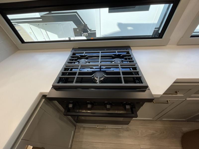 You'll love every minute spent in this luxury fifth wheel! Your crew can get comfortable in the rear living room on the 72" tri-fold sofa that converts to a 62" x 70" bed, or on the theater seating within the slide out. There is also a sliding dining table and a TV with swivel so everyone can have a good view of the movie. A full kitchen, complete with a cooktop, 30" residential microwave, and 16 cu. ft. refrigerator will let you cook and store food, and there is a handy trash bin with a Stow N' Go paper towel holder for easy clean up. The full bath will let you freshen up before heading to bed in the front private bedroom!