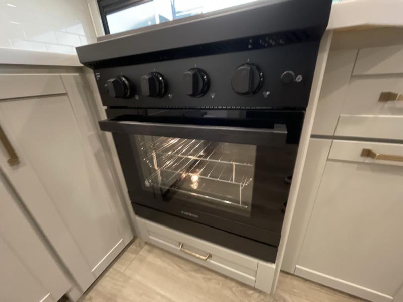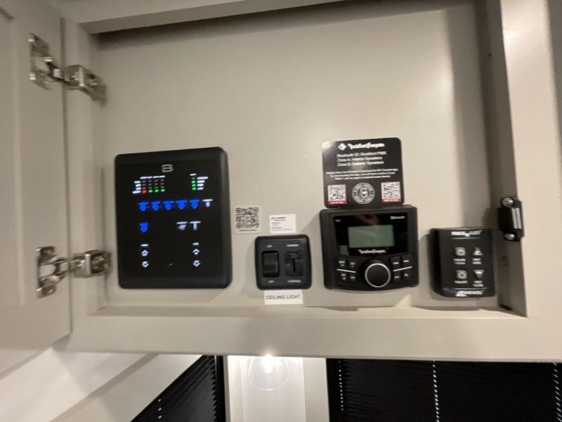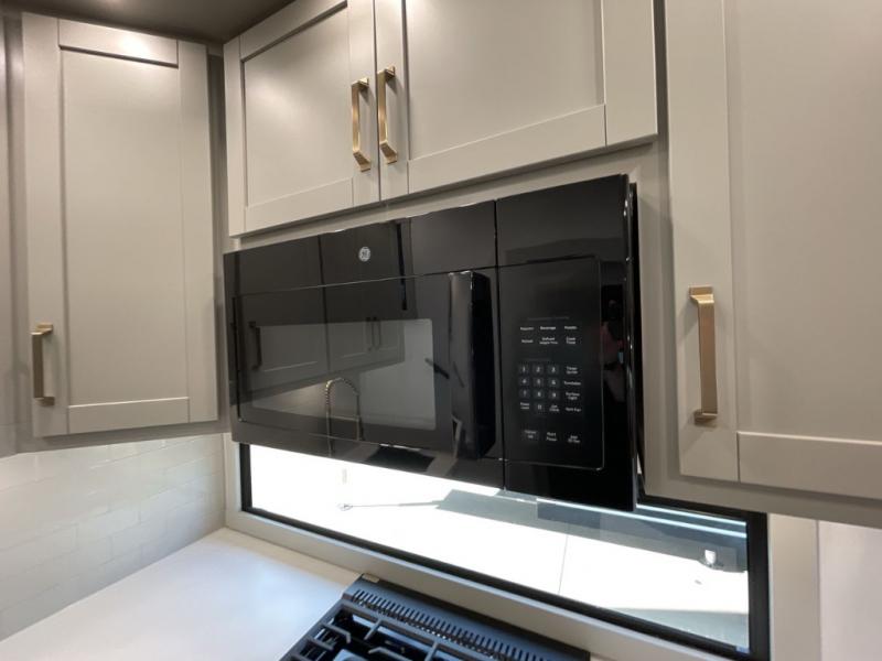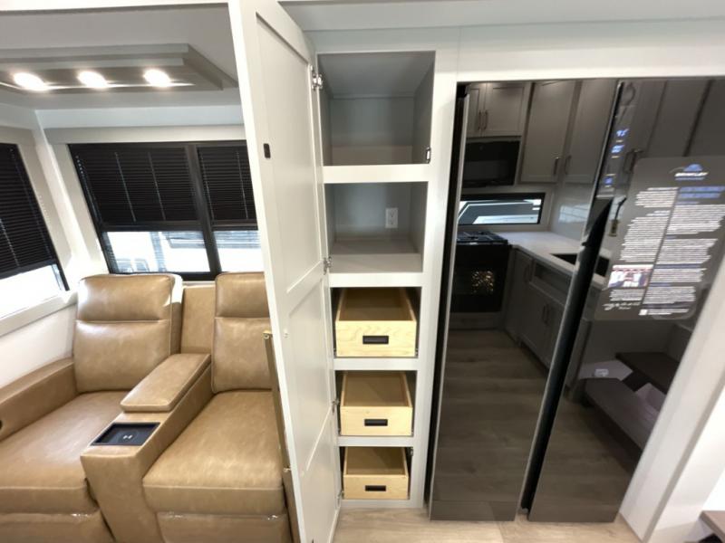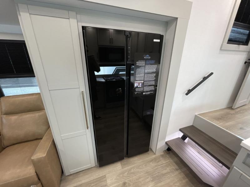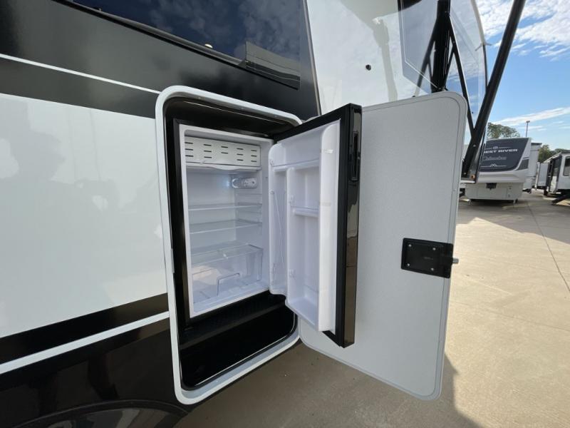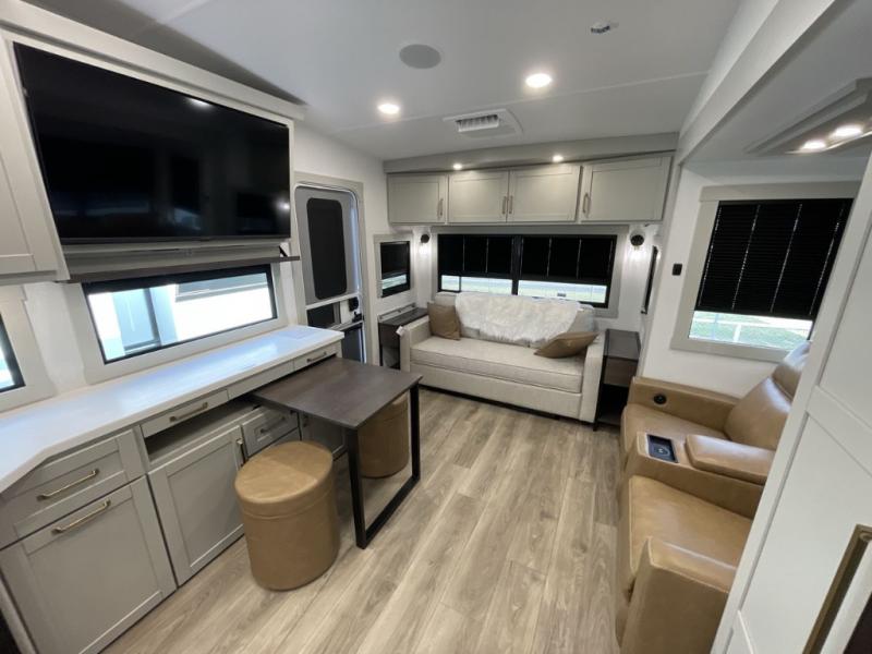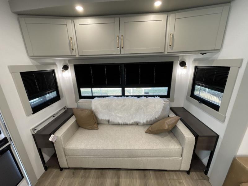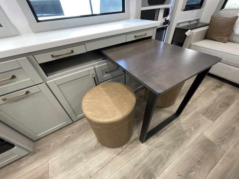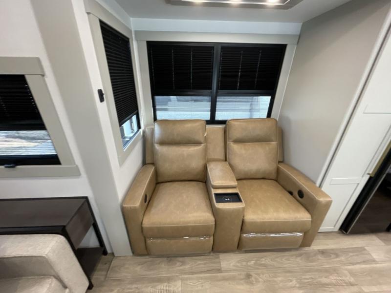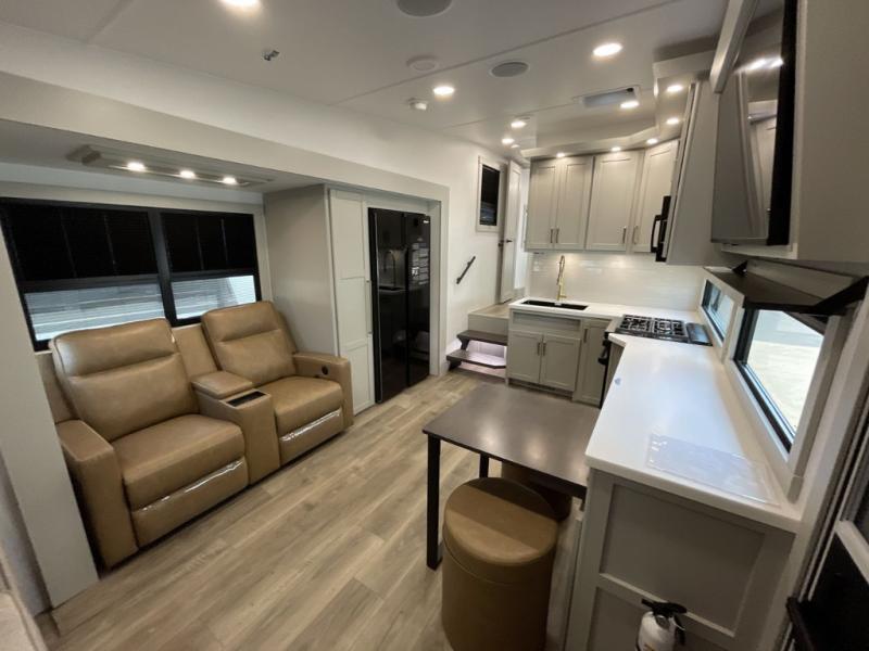 You'll love every minute spent in this luxury fifth wheel! Your crew can get comfortable in the rear living room on the 72" tri-fold sofa that converts to a 62" x 70" bed, or on the theater seating within the slide out. There is also a sliding dining table and a TV with swivel so everyone can have a good view of the movie. A full kitchen, complete with a cooktop, 30" residential microwave, and 16 cu. ft. refrigerator will let you cook and store food, and there is a handy trash bin with a Stow N' Go paper towel holder for easy clean up. The full bath will let you freshen up before heading to bed in the front private bedroom!