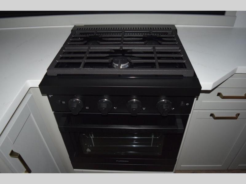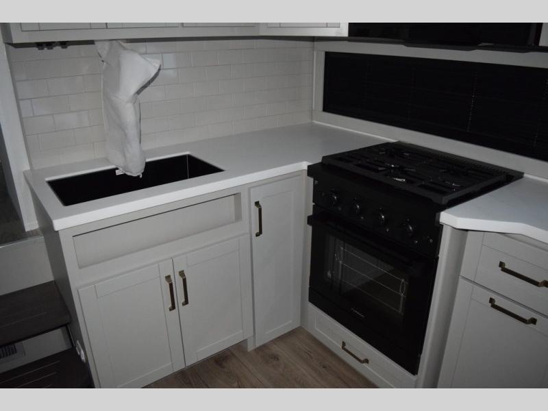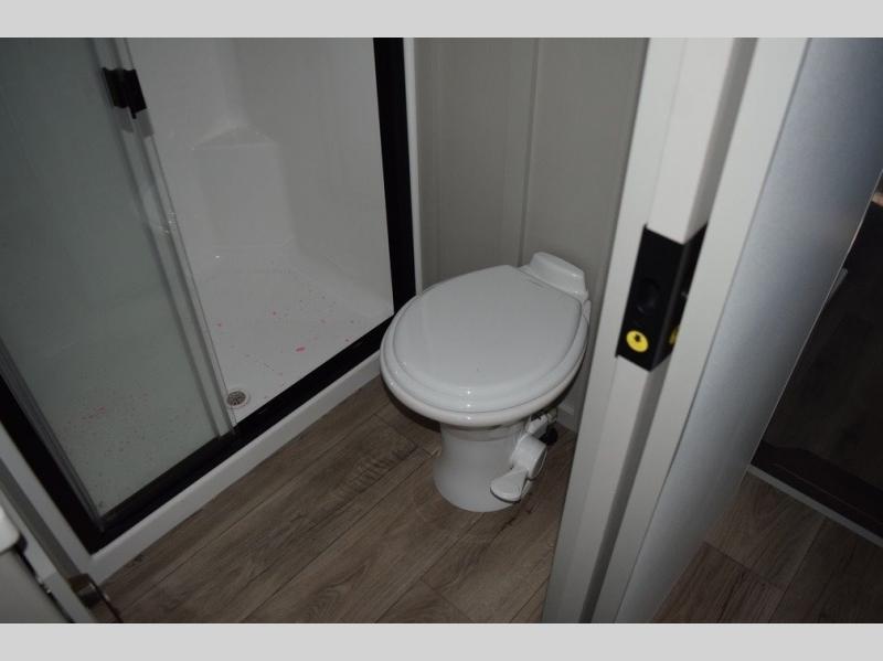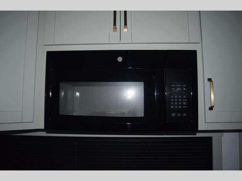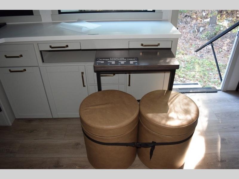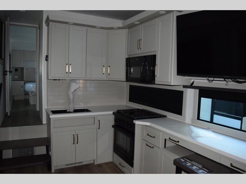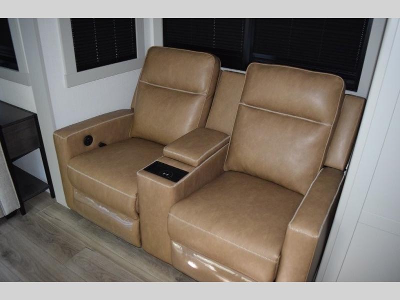 You'll love every minute spent in this luxury fifth wheel! Your crew can get comfortable in the rear living room on the 72" tri-fold sofa that converts to a 62" x 70" bed, or on the theater seating within the slide out. There is also a sliding dining table and a TV with swivel so everyone can have a good view of the movie. A full kitchen, complete with a cooktop, 30" residential microwave, and 16 cu. ft. refrigerator will let you cook and store food, and there is a handy trash bin with a Stow N' Go paper towel holder for easy clean up. The full bath will let you freshen up before heading to bed in the front private bedroom!