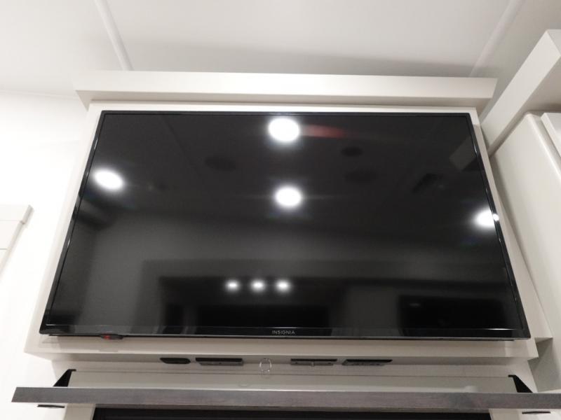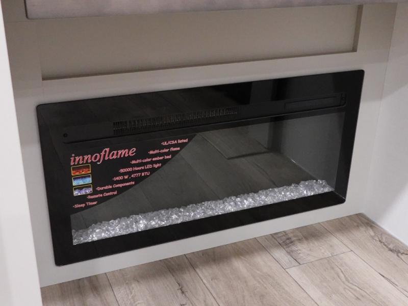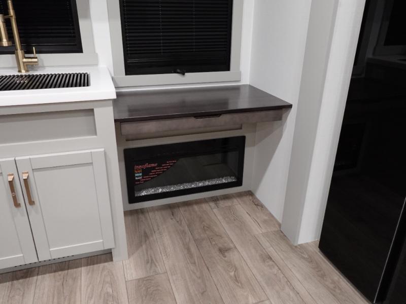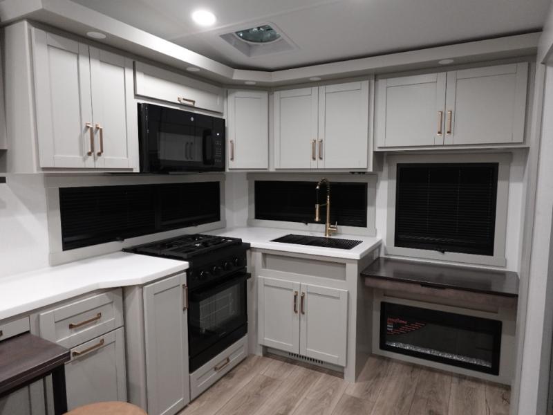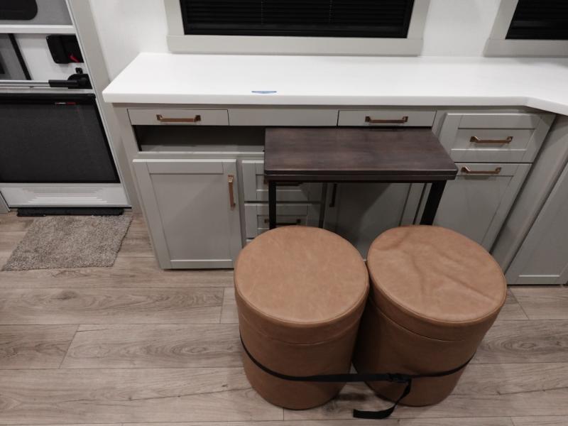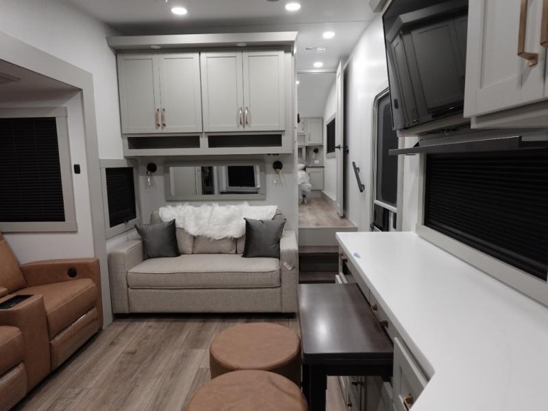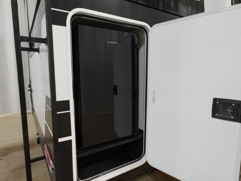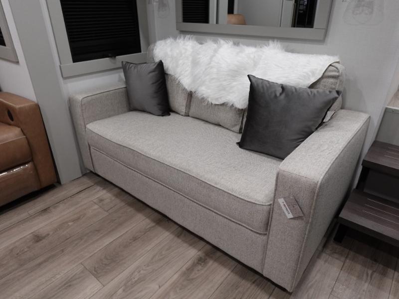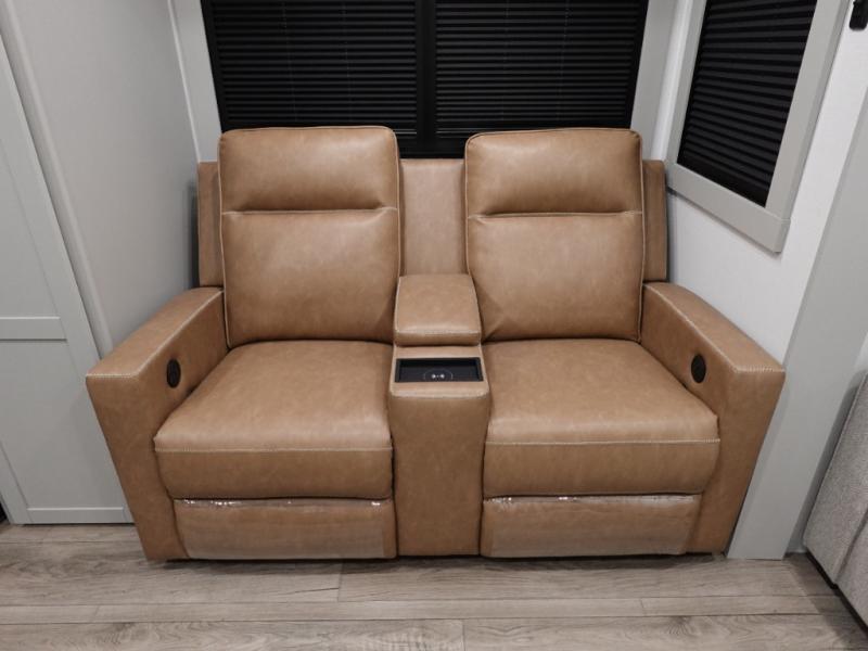 You'll love every minute spent in this spacious fifth wheel that can sleep four each night. There is a front private bedroom with a queen bed and 4x under-bed drawers to keep your space tidy. Your guests can sleep on the tri-fold sofa that extends to a 54" x 70" bed at night. The theater seating sits directly across from the 50" articulating TV for movie nights, and the pantry with drawers is right next to the theater seating for quick access to snacks! The chef of your group is sure to love the kitchen with its ample counter space, 30" residential microwave, and a sliding dining table with a drawer for even more storage. The desk in the back will allow you to get some work done if needed, or you can just spend your days outdoors under the two power awnings. There is also an exterior 12V refrigerator and storage, exterior speakers and controls, and a pass-thru storage for camp gear!