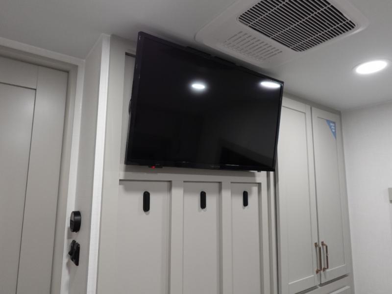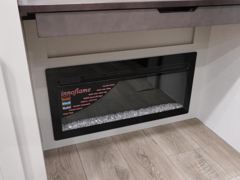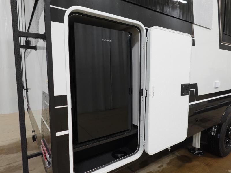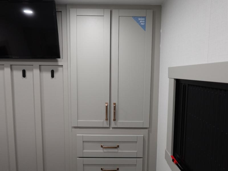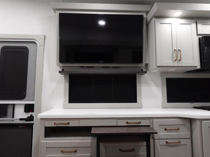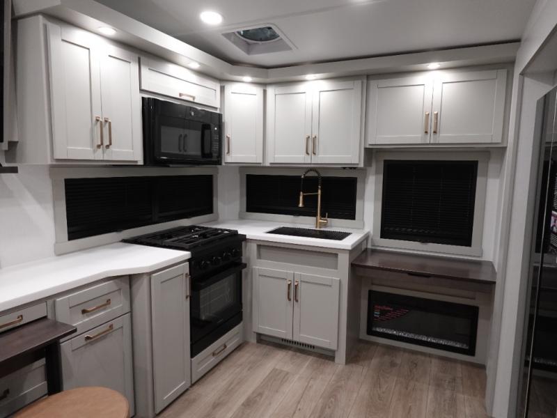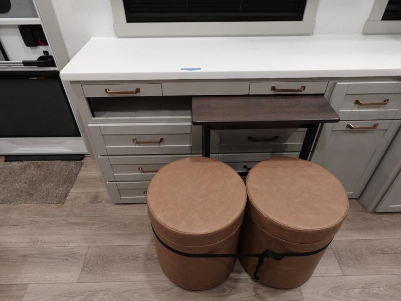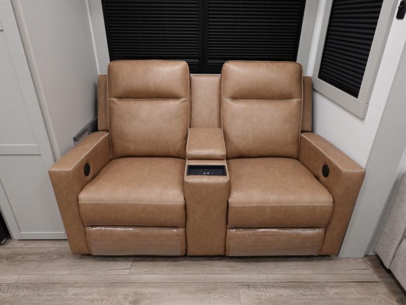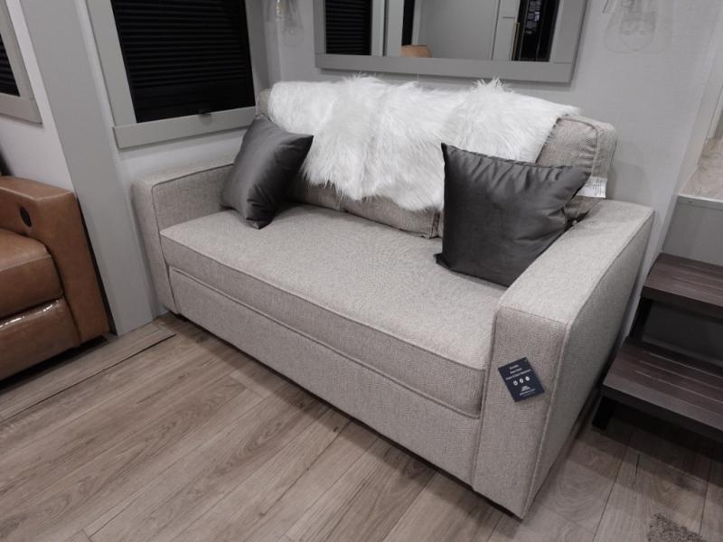 You'll love every minute spent in this spacious fifth wheel that can sleep four each night. There is a front private bedroom with a queen bed and 4x under-bed drawers to keep your space tidy. Your guests can sleep on the tri-fold sofa that extends to a 54" x 70" bed at night. The theater seating sits directly across from the 50" articulating TV for movie nights, and the pantry with drawers is right next to the theater seating for quick access to snacks! The chef of your group is sure to love the kitchen with its ample counter space, 30" residential microwave, and a sliding dining table with a drawer for even more storage. The desk in the back will allow you to get some work done if needed, or you can just spend your days outdoors under the two power awnings. There is also an exterior 12V refrigerator and storage, exterior speakers and controls, and a pass-thru storage for camp gear!