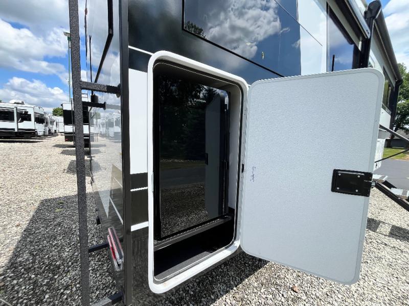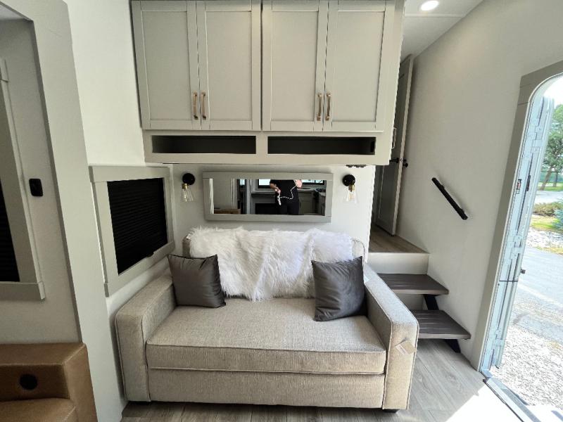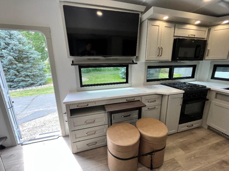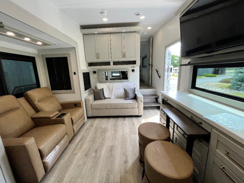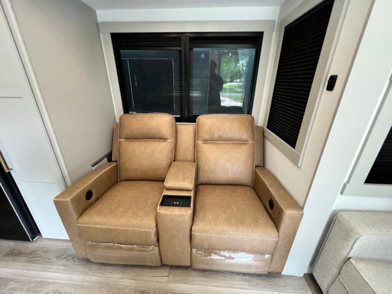 You'll love every minute spent in this spacious fifth wheel that can sleep four each night. There is a front private bedroom with a queen bed and 4x under-bed drawers to keep your space tidy. Your guests can sleep on the tri-fold sofa that extends to a 54" x 70" bed at night. The theater seating sits directly across from the 50" articulating TV for movie nights, and the pantry with drawers is right next to the theater seating for quick access to snacks! The chef of your group is sure to love the kitchen with its ample counter space, 30" residential microwave, and a sliding dining table with a drawer for even more storage. The desk in the back will allow you to get some work done if needed, or you can just spend your days outdoors under the two power awnings. There is also an exterior 12V refrigerator and storage, exterior speakers and controls, and a pass-thru storage for camp gear!