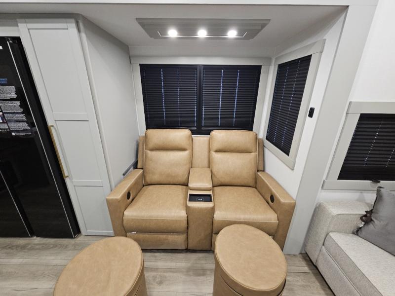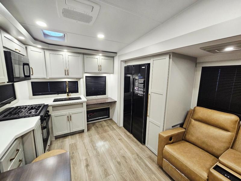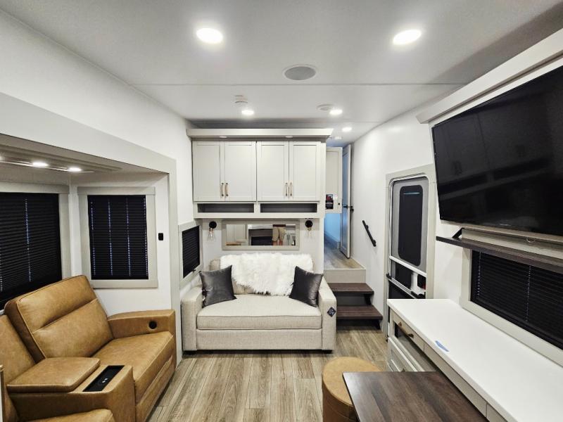 You'll love every minute spent in this spacious fifth wheel that can sleep four each night. There is a front private bedroom with a queen bed and 4x under-bed drawers to keep your space tidy. Your guests can sleep on the tri-fold sofa that extends to a 54" x 70" bed at night. The theater seating sits directly across from the 50" articulating TV for movie nights, and the pantry with drawers is right next to the theater seating for quick access to snacks! The chef of your group is sure to love the kitchen with its ample counter space, 30" residential microwave, and a sliding dining table with a drawer for even more storage. The desk in the back will allow you to get some work done if needed, or you can just spend your days outdoors under the two power awnings. There is also an exterior 12V refrigerator and storage, exterior speakers and controls, and a pass-thru storage for camp gear!