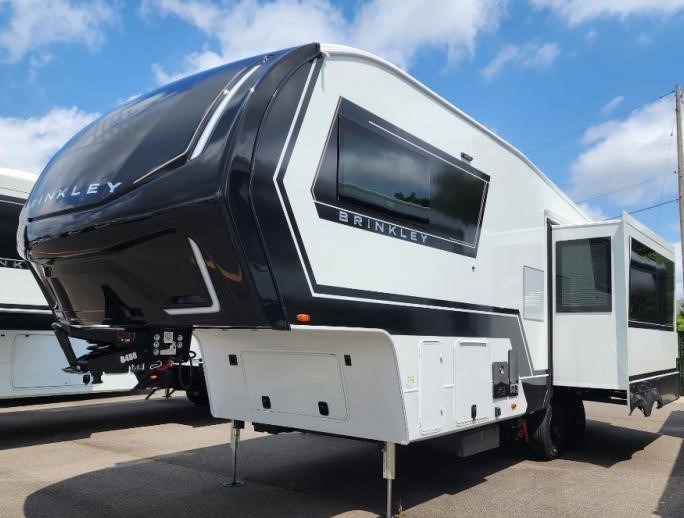 The Brinkley mid-profile Model Z fifth wheels bring you clean lines and an upscale look with plenty of style and exciting new features like the industry first brass plumbing connections. These units also feature an automotive grade front cap, plenty of exterior storage, dual exterior hot and cold showers, and wide stance leveling jacks for easy set up. Residential frameless windows provide a clean look and beautiful views, and ample electrical outlets and USB/USB-C outlets allow all of your electronics and appliances to easily be used and charged.