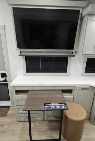 You'll love every minute spent in this spacious fifth wheel that can sleep four each night. There is a front private bedroom with a queen bed and 4x under-bed drawers to keep your space tidy. Your guests can sleep on the tri-fold sofa that extends to a 54" x 70" bed at night. The theater seating sits directly across from the 50" articulating TV for movie nights, and the pantry with drawers is right next to the theater seating for quick access to snacks! The chef of your group is sure to love the kitchen with its ample counter space, 30" residential microwave, and a sliding dining table with a drawer for even more storage. The desk in the back will allow you to get some work done if needed, or you can just spend your days outdoors under the two power awnings. There is also an exterior 12V refrigerator and storage, exterior speakers and controls, and a pass-thru storage for camp gear!
