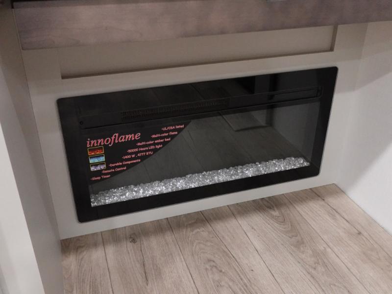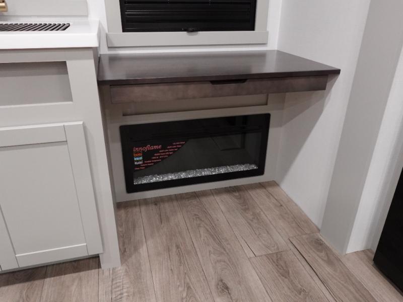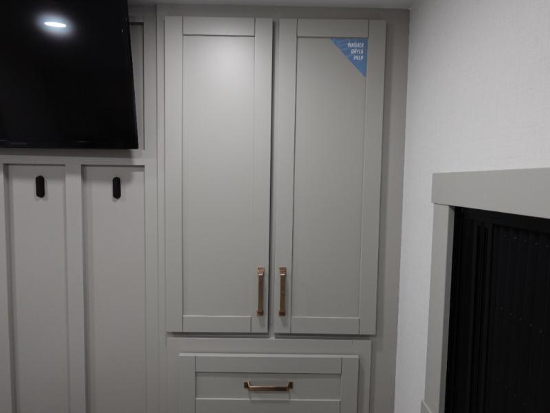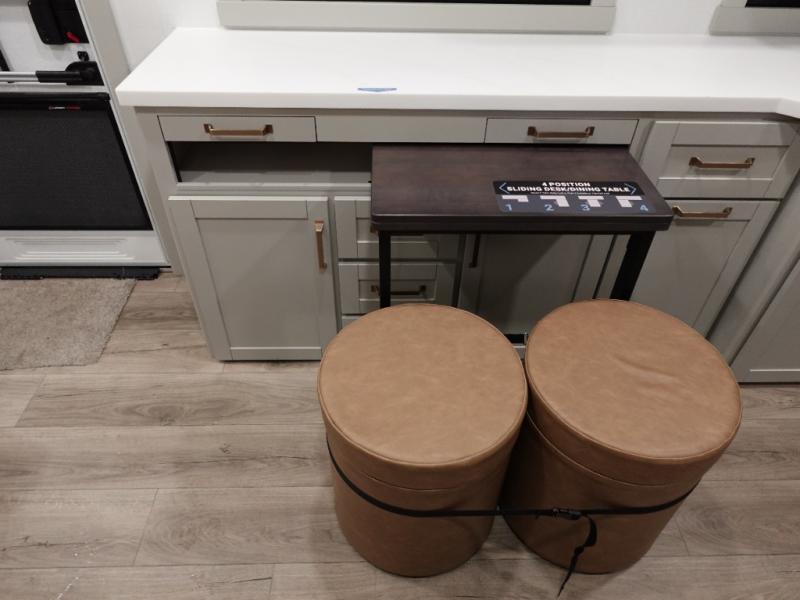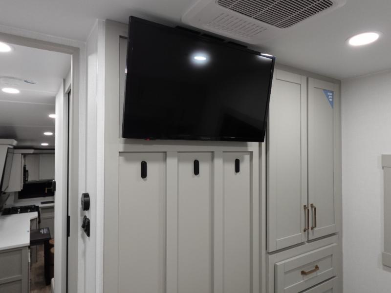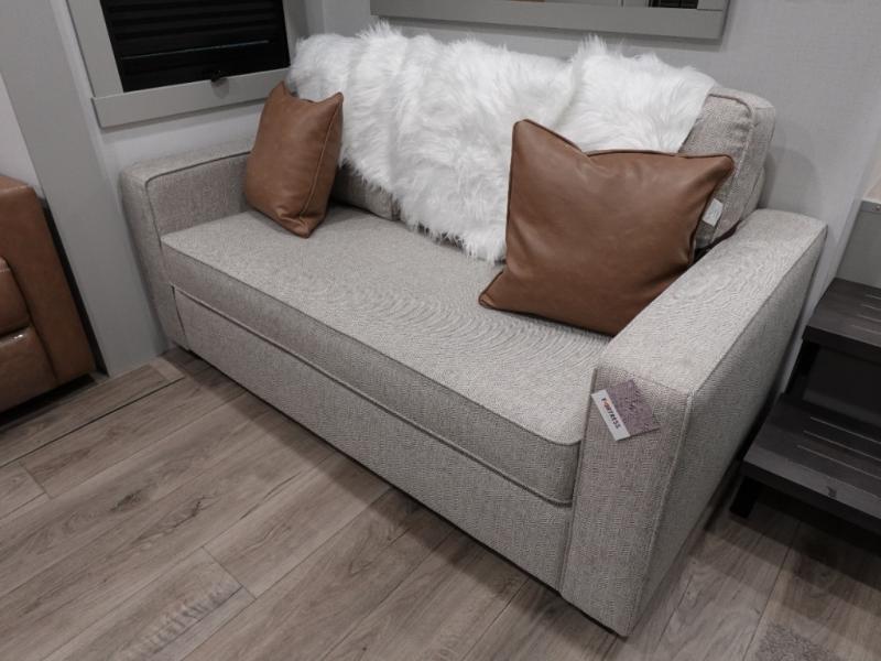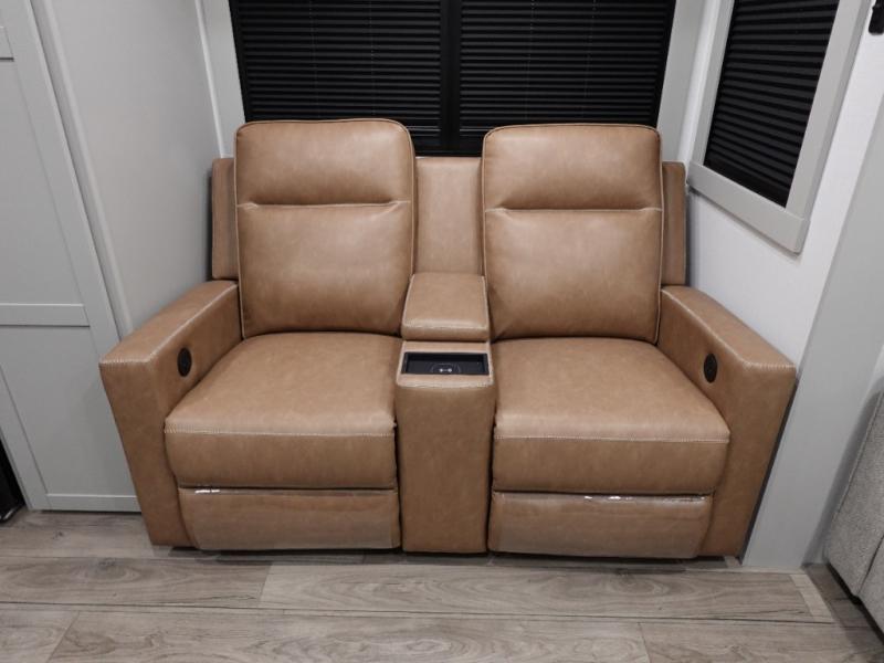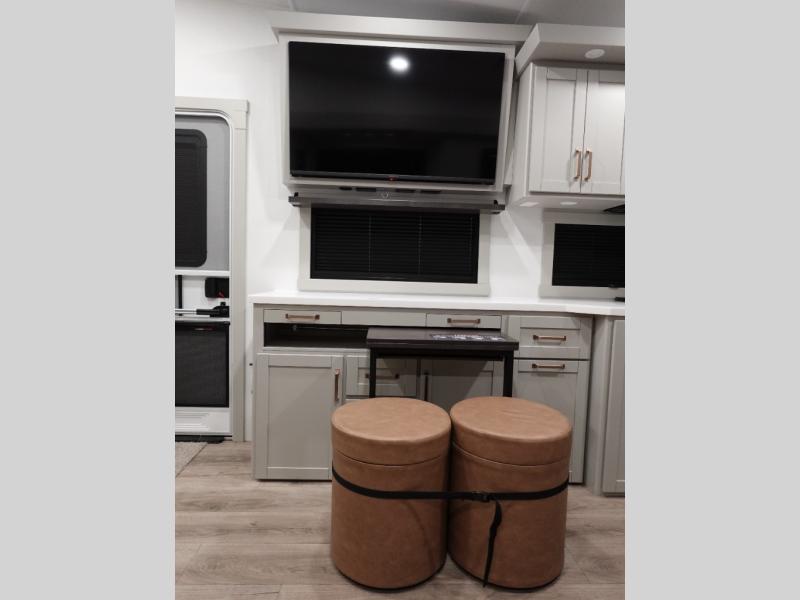 You'll love every minute spent in this spacious fifth wheel that can sleep four each night. There is a front private bedroom with a queen bed and 4x under-bed drawers to keep your space tidy. Your guests can sleep on the tri-fold sofa that extends to a 54" x 70" bed at night. The theater seating sits directly across from the 50" articulating TV for movie nights, and the pantry with drawers is right next to the theater seating for quick access to snacks! The chef of your group is sure to love the kitchen with its ample counter space, 30" residential microwave, and a sliding dining table with a drawer for even more storage. The desk in the back will allow you to get some work done if needed, or you can just spend your days outdoors under the two power awnings. There is also an exterior 12V refrigerator and storage, exterior speakers and controls, and a pass-thru storage for camp gear!