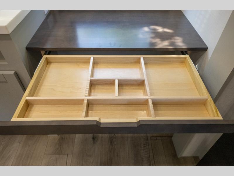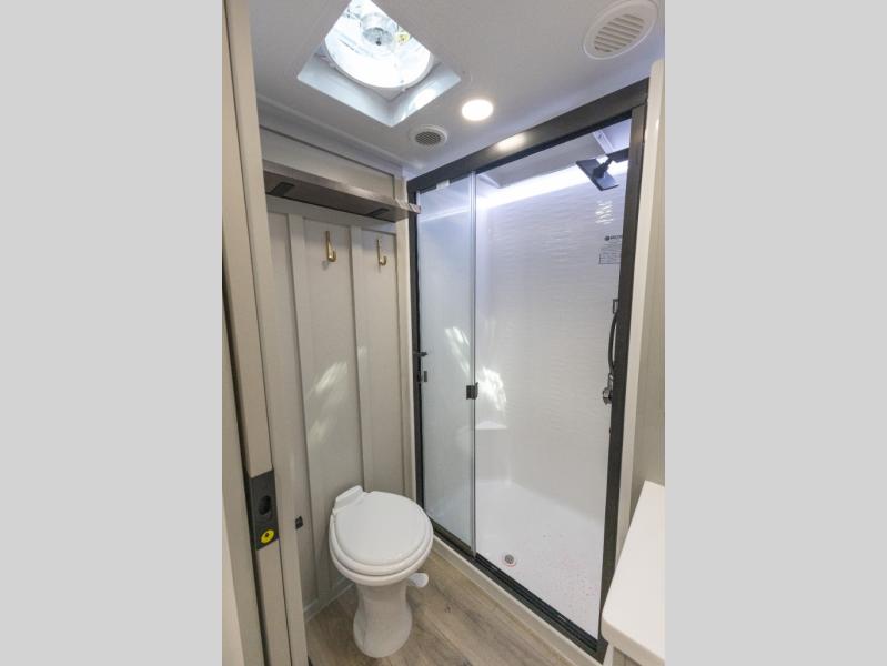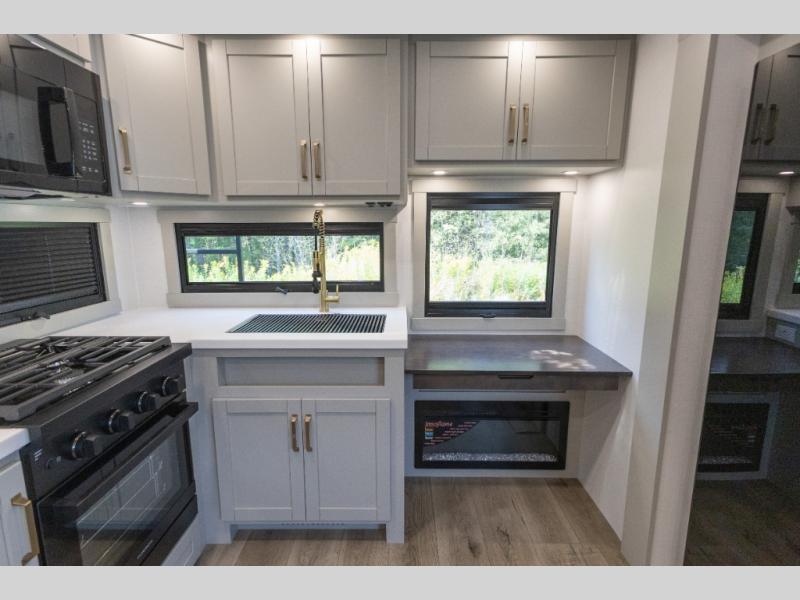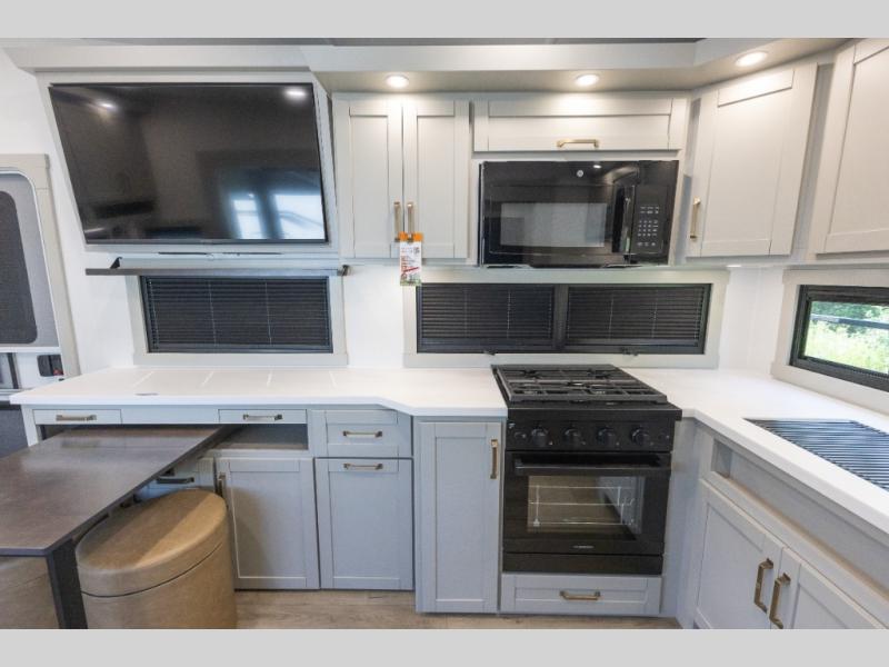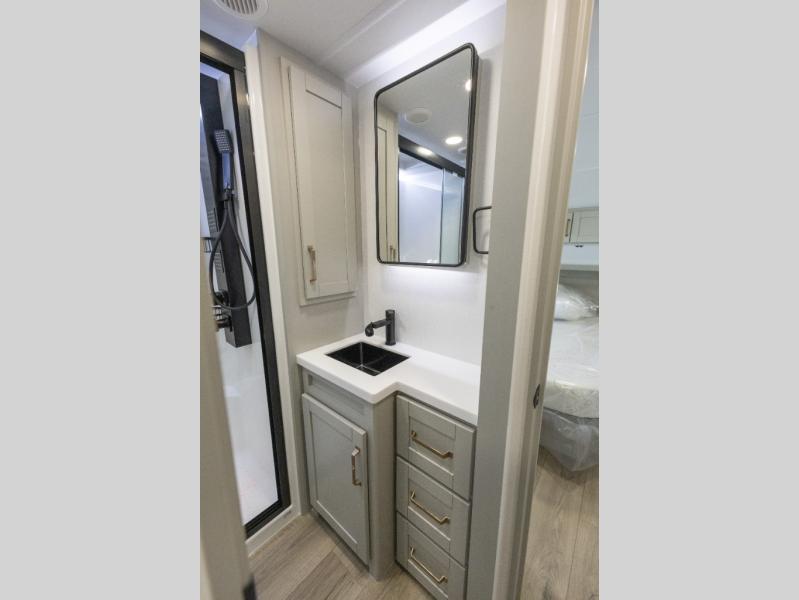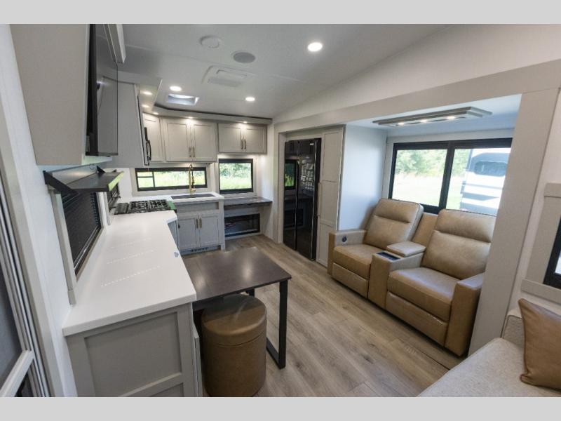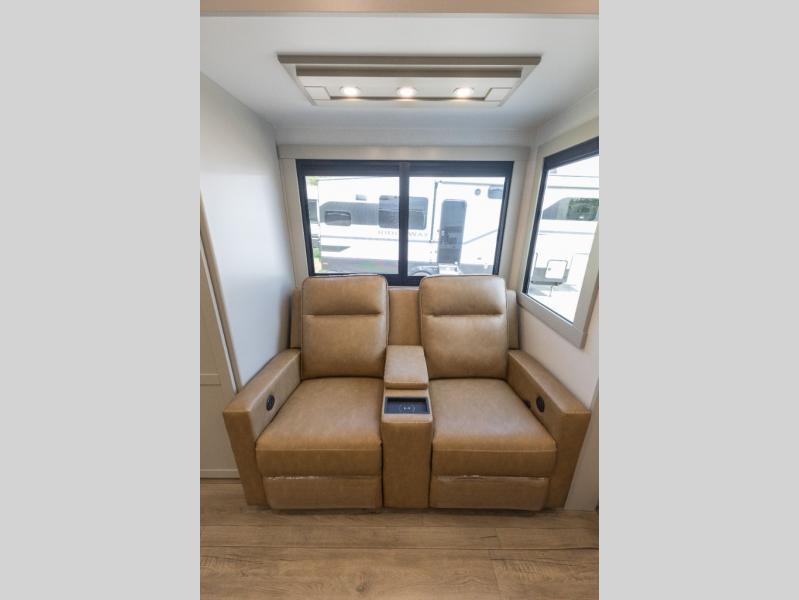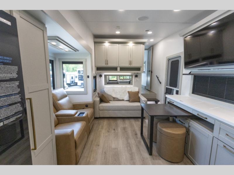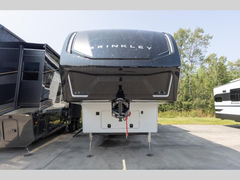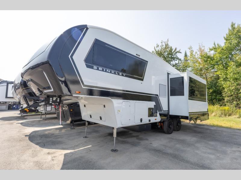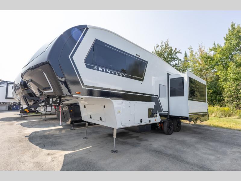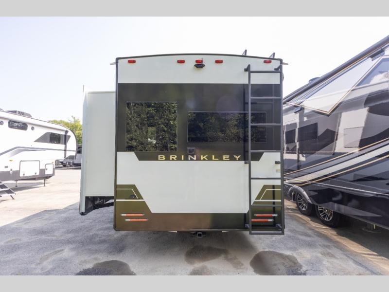 The Brinkley mid-profile Model Z fifth wheels bring you clean lines and an upscale look with plenty of style and exciting new features like the industry first brass plumbing connections. These units also feature an automotive grade front cap, plenty of exterior storage, dual exterior hot and cold showers, and wide stance leveling jacks for easy set up. Residential frameless windows provide a clean look and beautiful views, and ample electrical outlets and USB/USB-C outlets allow all of your electronics and appliances to easily be used and charged.