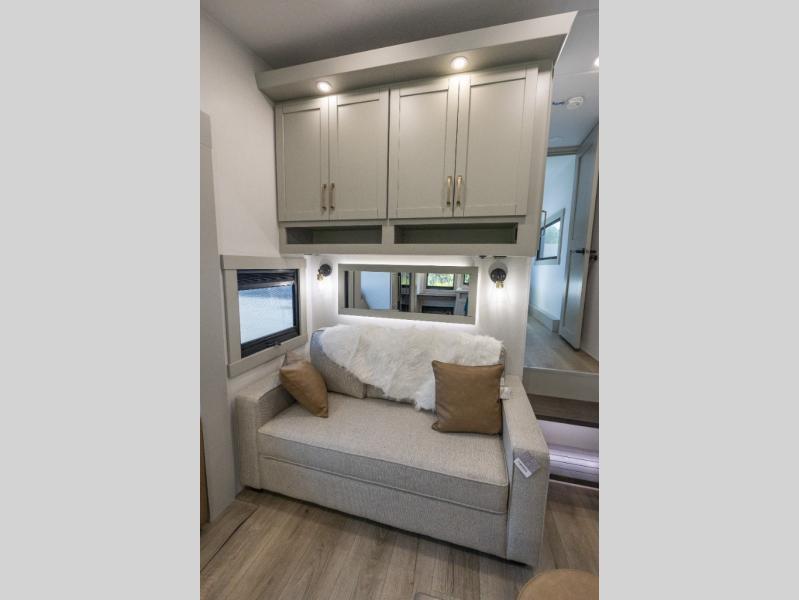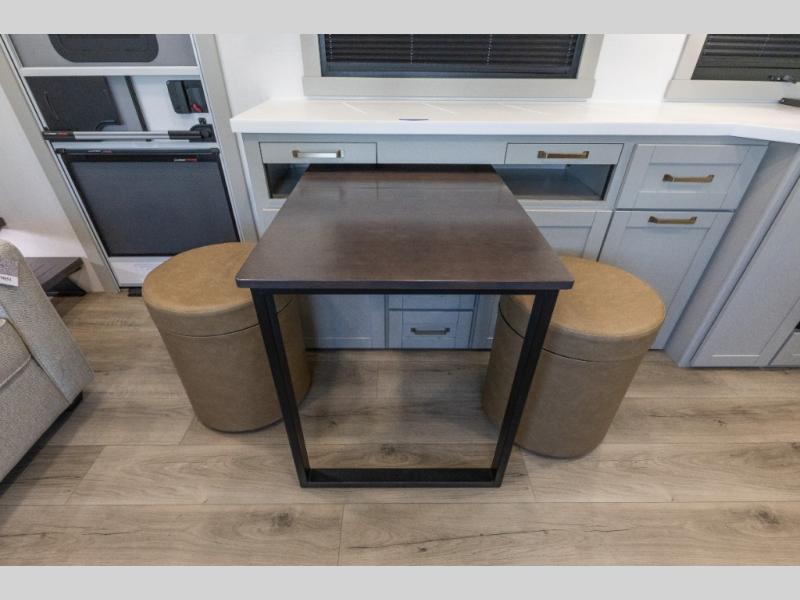 You'll love every minute spent in this spacious fifth wheel that can sleep four each night. There is a front private bedroom with a queen bed and 4x under-bed drawers to keep your space tidy. Your guests can sleep on the tri-fold sofa that extends to a 54" x 70" bed at night. The theater seating sits directly across from the 50" articulating TV for movie nights, and the pantry with drawers is right next to the theater seating for quick access to snacks! The chef of your group is sure to love the kitchen with its ample counter space, 30" residential microwave, and a sliding dining table with a drawer for even more storage. The desk in the back will allow you to get some work done if needed, or you can just spend your days outdoors under the two power awnings. There is also an exterior 12V refrigerator and storage, exterior speakers and controls, and a pass-thru storage for camp gear!