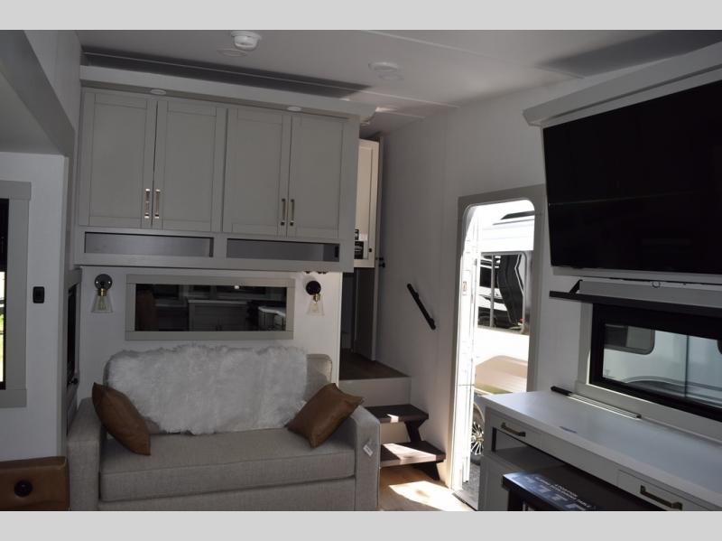 You'll love every minute spent in this spacious fifth wheel that can sleep four each night. There is a front private bedroom with a queen bed and 4x under-bed drawers to keep your space tidy. Your guests can sleep on the tri-fold sofa that extends to a 54" x 70" bed at night. The theater seating sits directly across from the 50" articulating TV for movie nights, and the pantry with drawers is right next to the theater seating for quick access to snacks! The chef of your group is sure to love the kitchen with its ample counter space, 30" residential microwave, and a sliding dining table with a drawer for even more storage. The desk in the back will allow you to get some work done if needed, or you can just spend your days outdoors under the two power awnings. There is also an exterior 12V refrigerator and storage, exterior speakers and controls, and a pass-thru storage for camp gear!