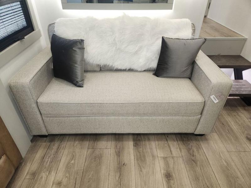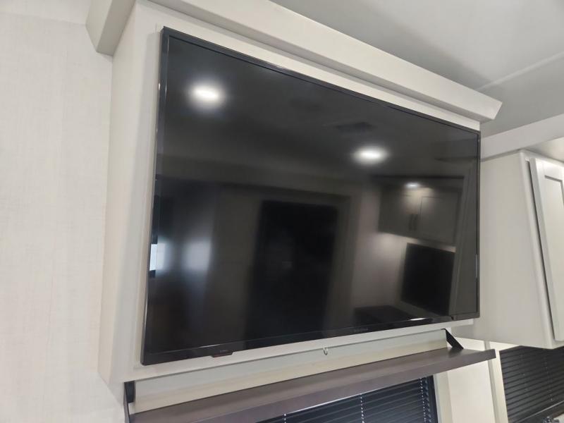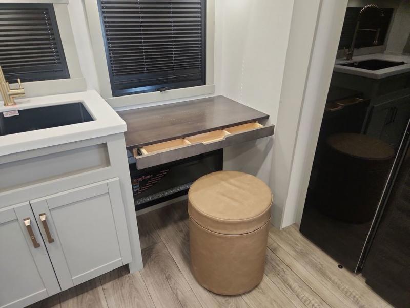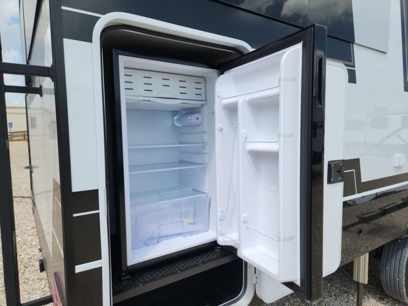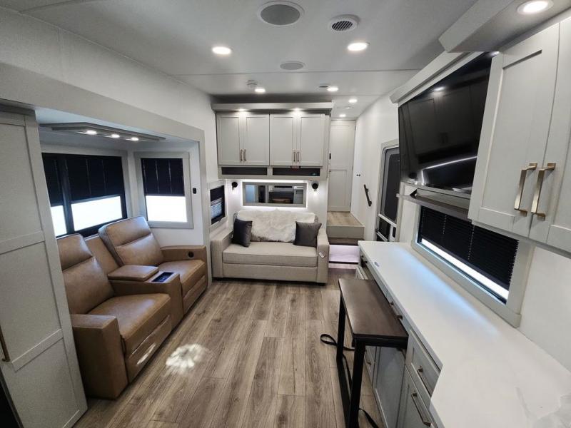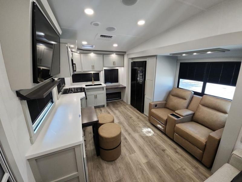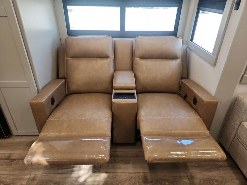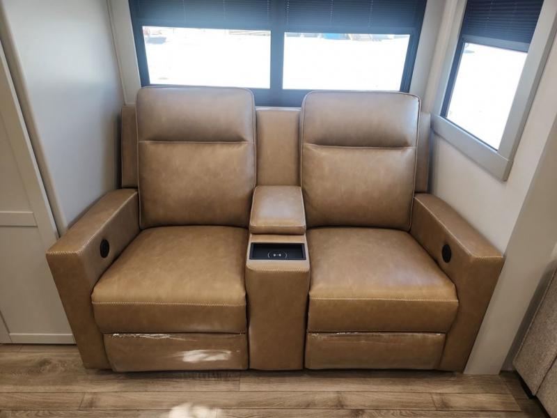 You'll love every minute spent in this spacious fifth wheel that can sleep four each night. There is a front private bedroom with a queen bed and 4x under-bed drawers to keep your space tidy. Your guests can sleep on the tri-fold sofa that extends to a 54" x 70" bed at night. The theater seating sits directly across from the 50" articulating TV for movie nights, and the pantry with drawers is right next to the theater seating for quick access to snacks! The chef of your group is sure to love the kitchen with its ample counter space, 30" residential microwave, and a sliding dining table with a drawer for even more storage. The desk in the back will allow you to get some work done if needed, or you can just spend your days outdoors under the two power awnings. There is also an exterior 12V refrigerator and storage, exterior speakers and controls, and a pass-thru storage for camp gear!