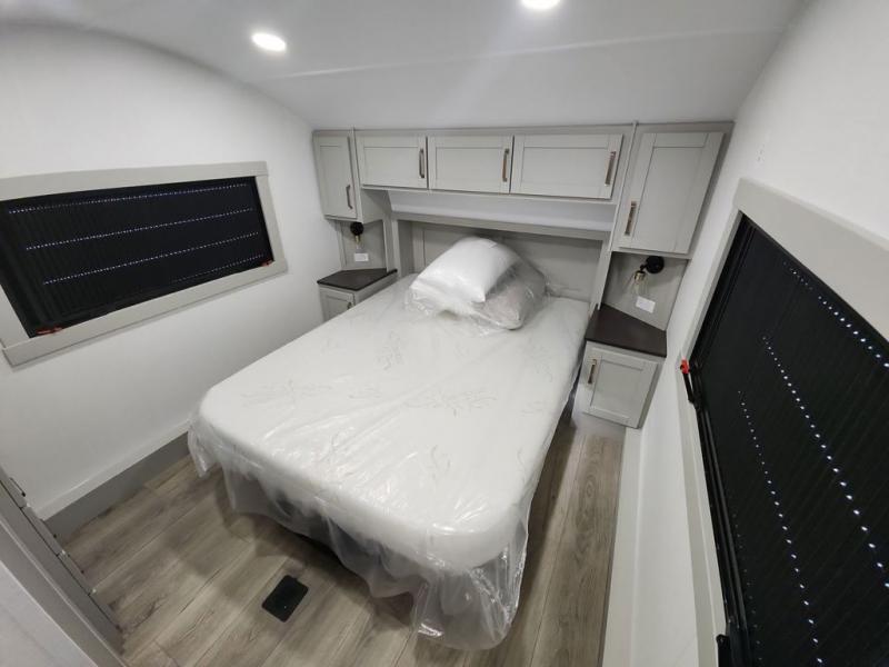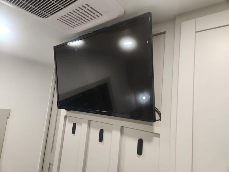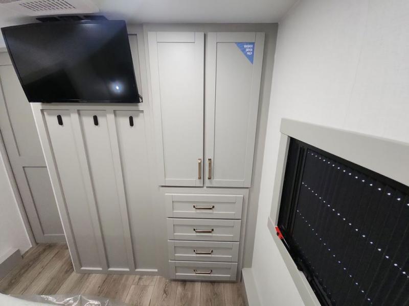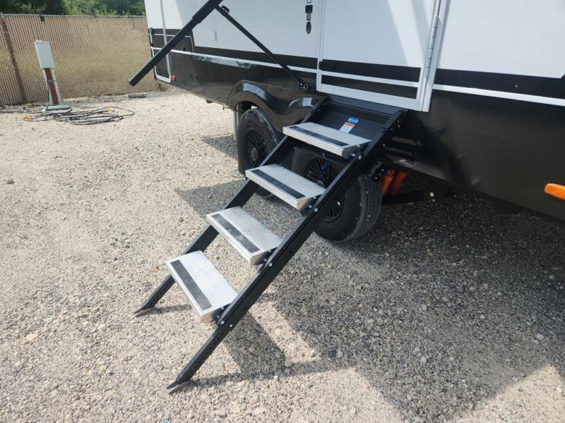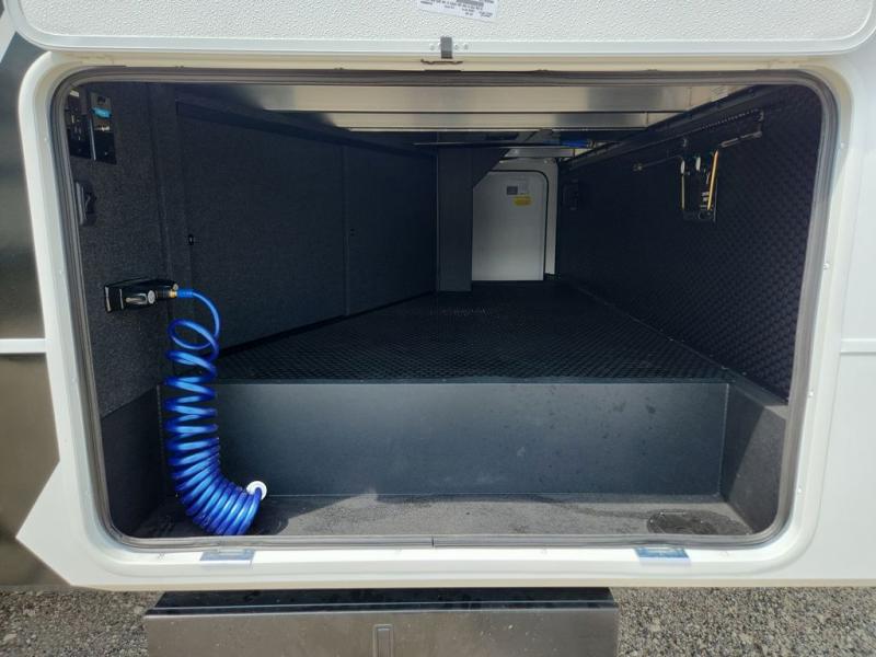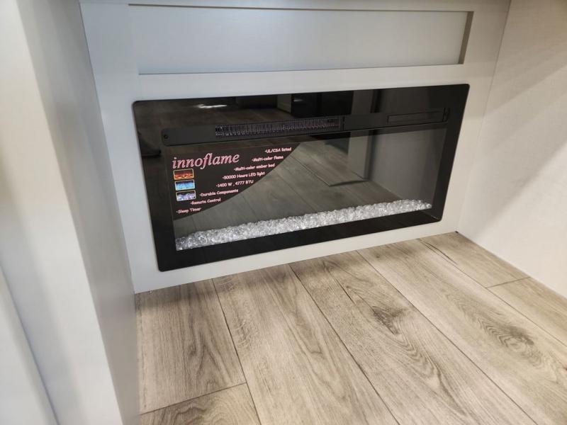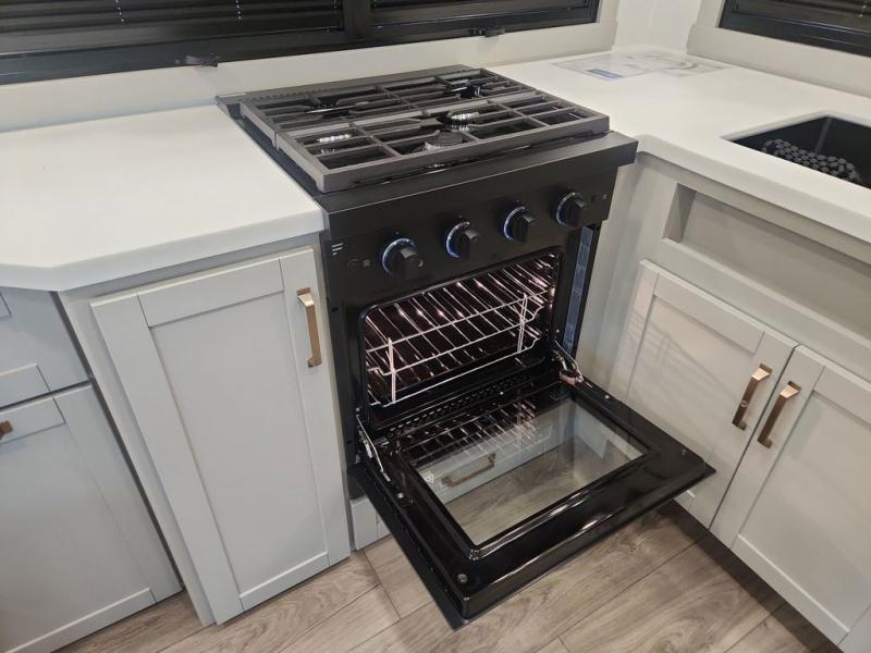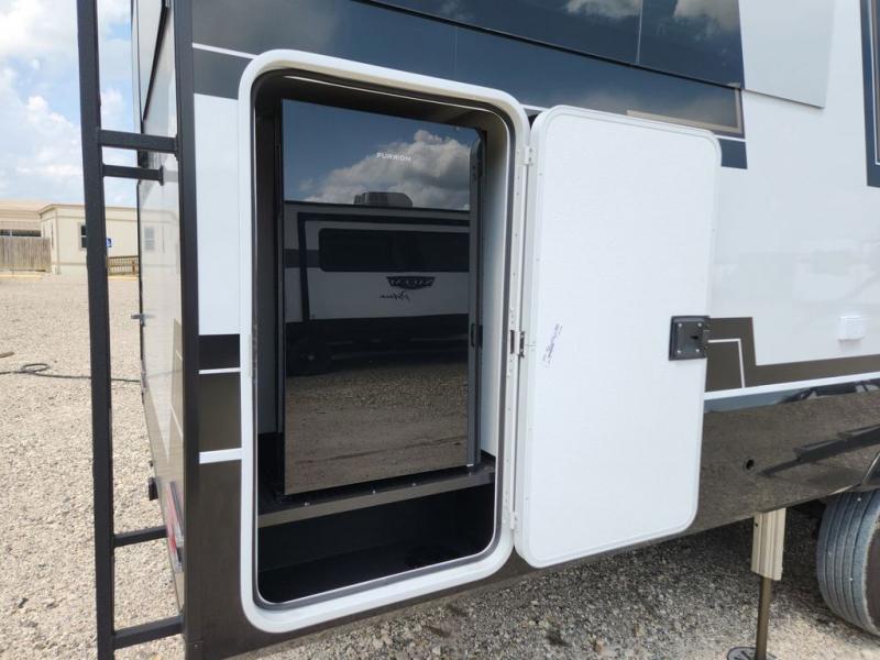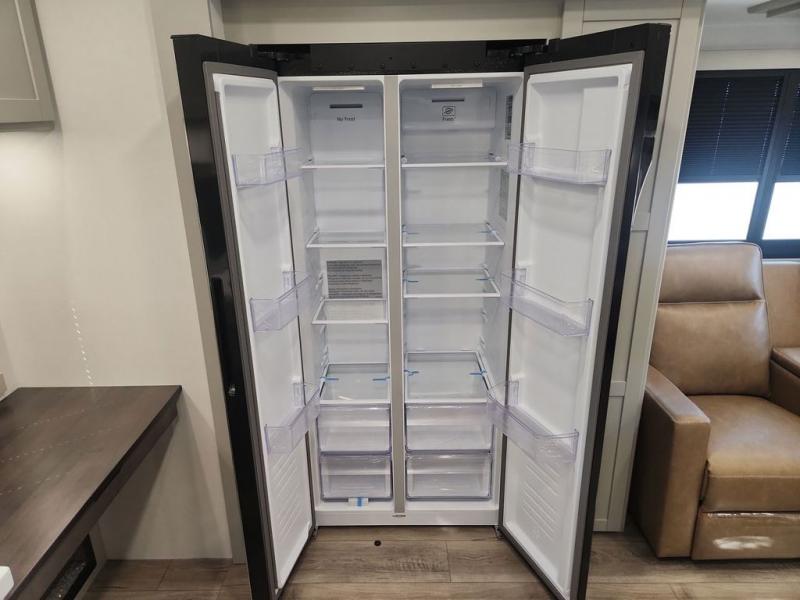 You'll love every minute spent in this spacious fifth wheel that can sleep four each night. There is a front private bedroom with a queen bed and 4x under-bed drawers to keep your space tidy. Your guests can sleep on the tri-fold sofa that extends to a 54" x 70" bed at night. The theater seating sits directly across from the 50" articulating TV for movie nights, and the pantry with drawers is right next to the theater seating for quick access to snacks! The chef of your group is sure to love the kitchen with its ample counter space, 30" residential microwave, and a sliding dining table with a drawer for even more storage. The desk in the back will allow you to get some work done if needed, or you can just spend your days outdoors under the two power awnings. There is also an exterior 12V refrigerator and storage, exterior speakers and controls, and a pass-thru storage for camp gear!