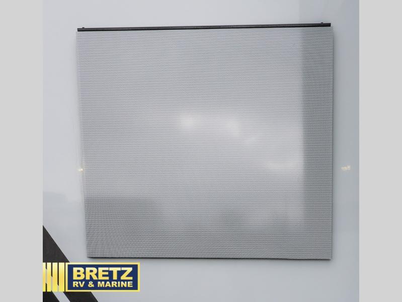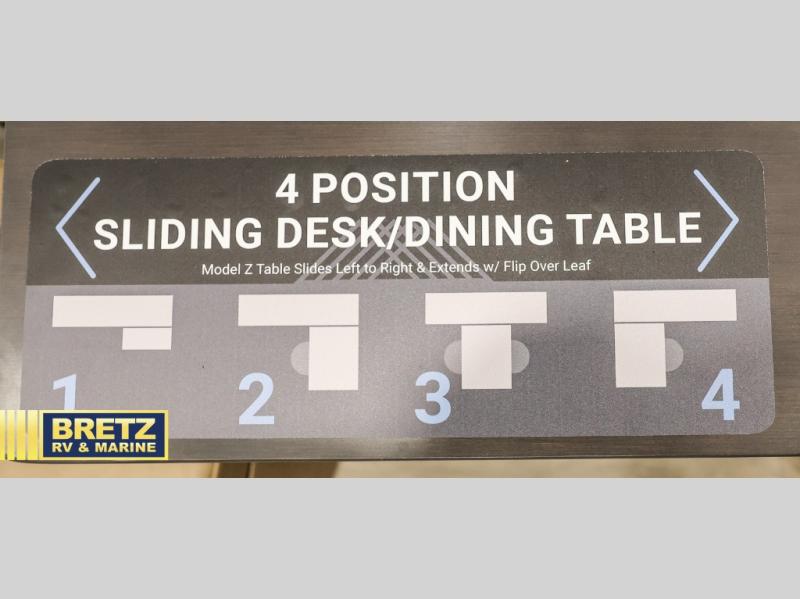 You'll love every minute spent in this spacious fifth wheel that can sleep four each night. There is a front private bedroom with a queen bed and 4x under-bed drawers to keep your space tidy. Your guests can sleep on the tri-fold sofa that extends to a 54" x 70" bed at night. The theater seating sits directly across from the 50" articulating TV for movie nights, and the pantry with drawers is right next to the theater seating for quick access to snacks! The chef of your group is sure to love the kitchen with its ample counter space, 30" residential microwave, and a sliding dining table with a drawer for even more storage. The desk in the back will allow you to get some work done if needed, or you can just spend your days outdoors under the two power awnings. There is also an exterior 12V refrigerator and storage, exterior speakers and controls, and a pass-thru storage for camp gear!