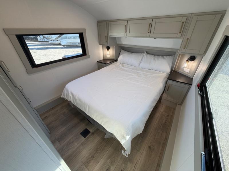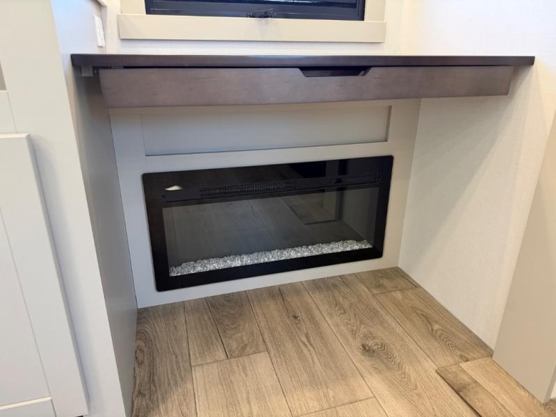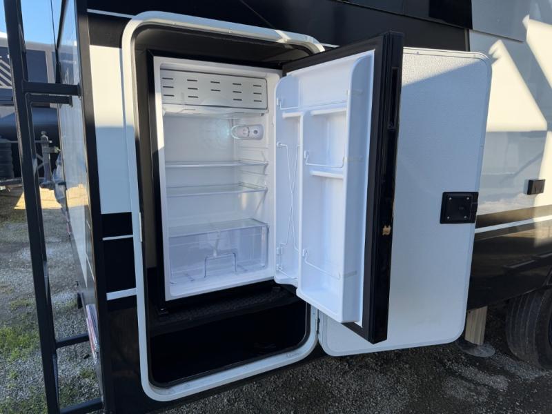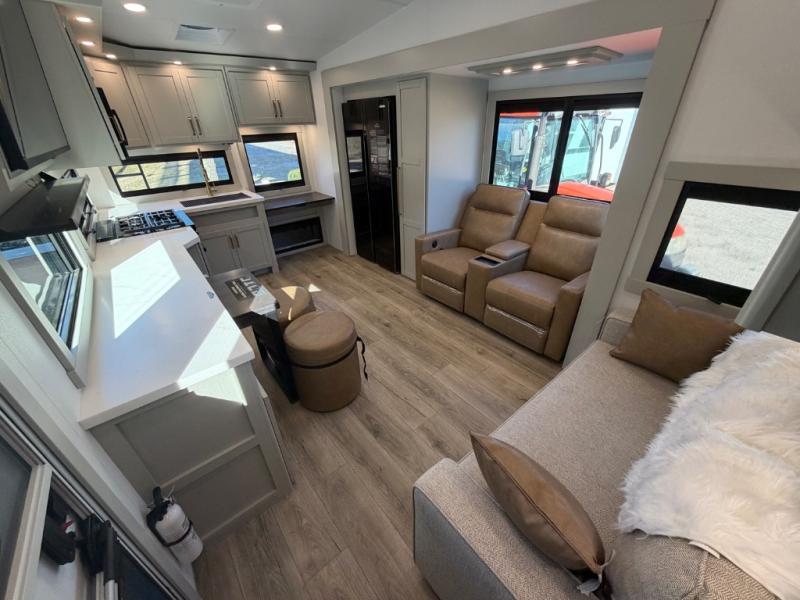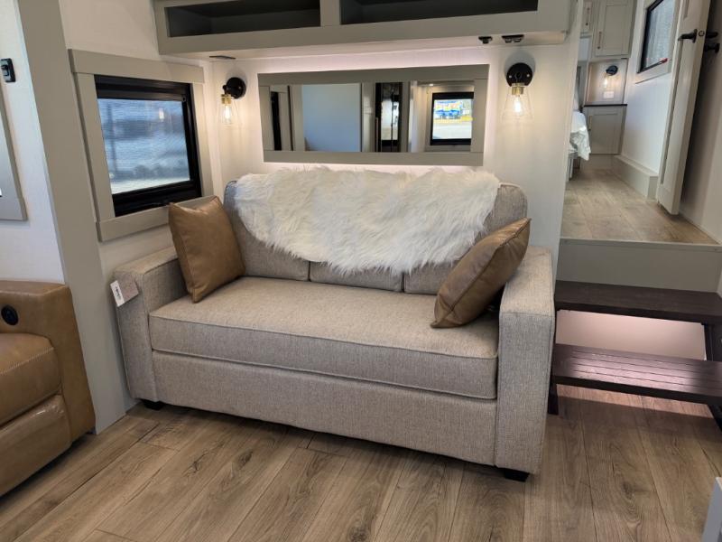 You'll love every minute spent in this spacious fifth wheel that can sleep four each night. There is a front private bedroom with a queen bed and 4x under-bed drawers to keep your space tidy. Your guests can sleep on the tri-fold sofa that extends to a 54" x 70" bed at night. The theater seating sits directly across from the 50" articulating TV for movie nights, and the pantry with drawers is right next to the theater seating for quick access to snacks! The chef of your group is sure to love the kitchen with its ample counter space, 30" residential microwave, and a sliding dining table with a drawer for even more storage. The desk in the back will allow you to get some work done if needed, or you can just spend your days outdoors under the two power awnings. There is also an exterior 12V refrigerator and storage, exterior speakers and controls, and a pass-thru storage for camp gear!