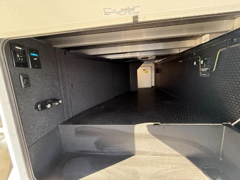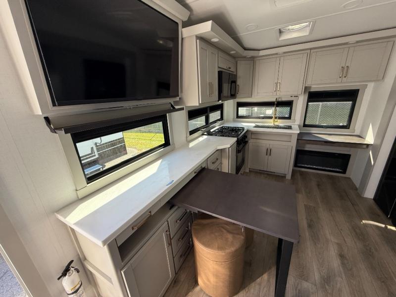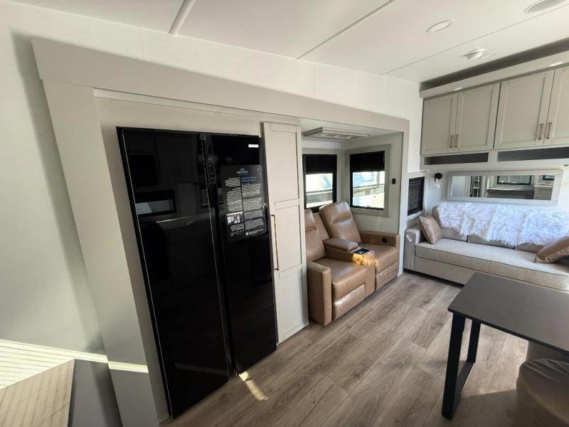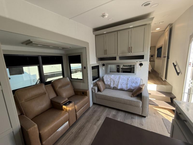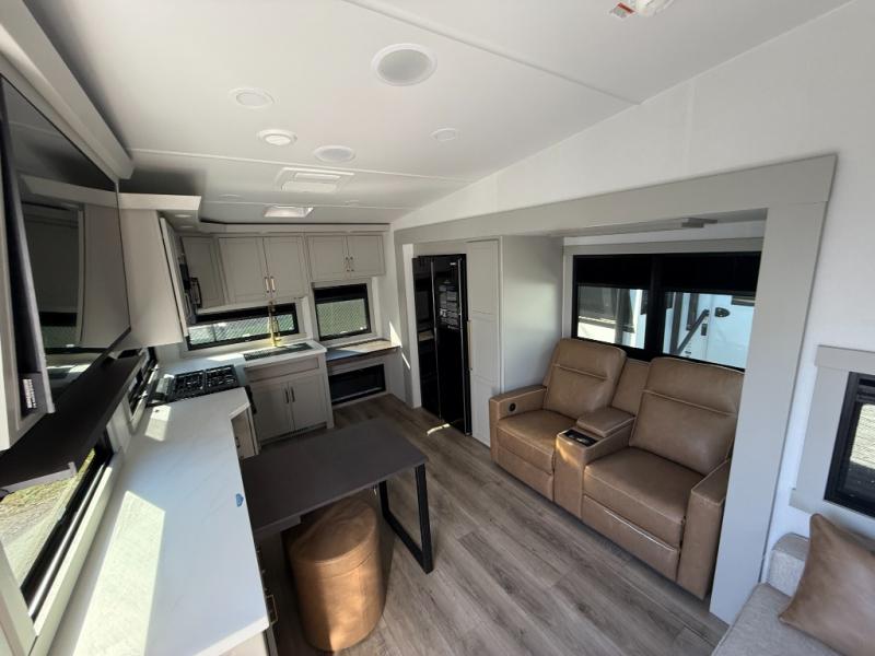 You'll love every minute spent in this spacious fifth wheel that can sleep four each night. There is a front private bedroom with a queen bed and 4x under-bed drawers to keep your space tidy. Your guests can sleep on the tri-fold sofa that extends to a 54" x 70" bed at night. The theater seating sits directly across from the 50" articulating TV for movie nights, and the pantry with drawers is right next to the theater seating for quick access to snacks! The chef of your group is sure to love the kitchen with its ample counter space, 30" residential microwave, and a sliding dining table with a drawer for even more storage. The desk in the back will allow you to get some work done if needed, or you can just spend your days outdoors under the two power awnings. There is also an exterior 12V refrigerator and storage, exterior speakers and controls, and a pass-thru storage for camp gear!