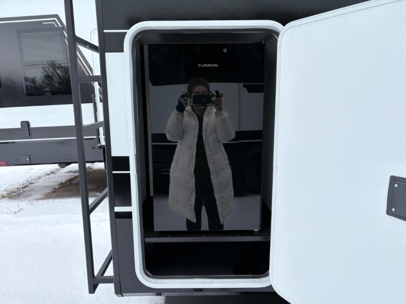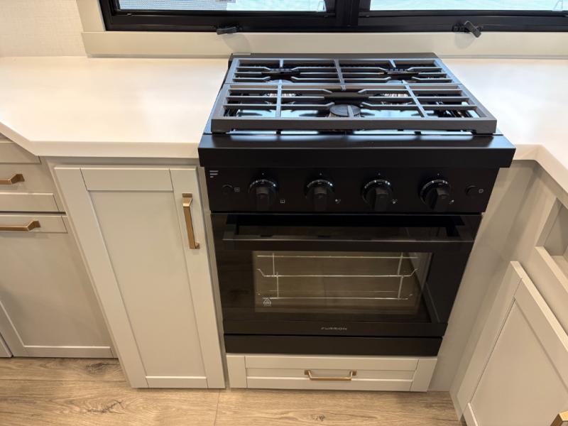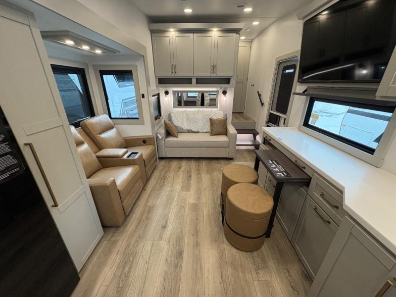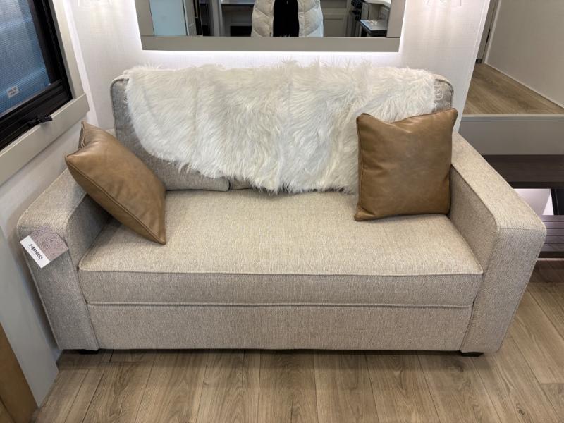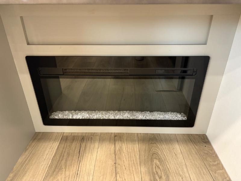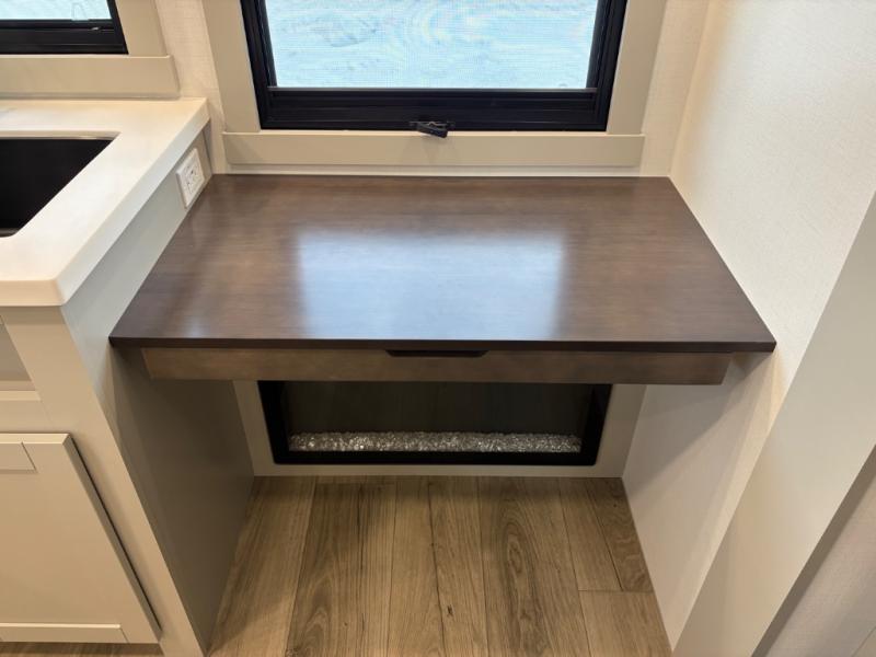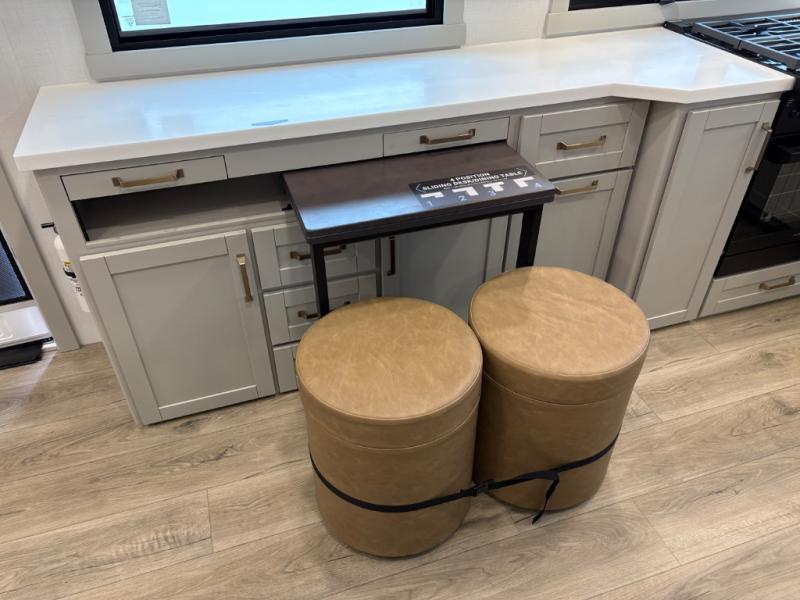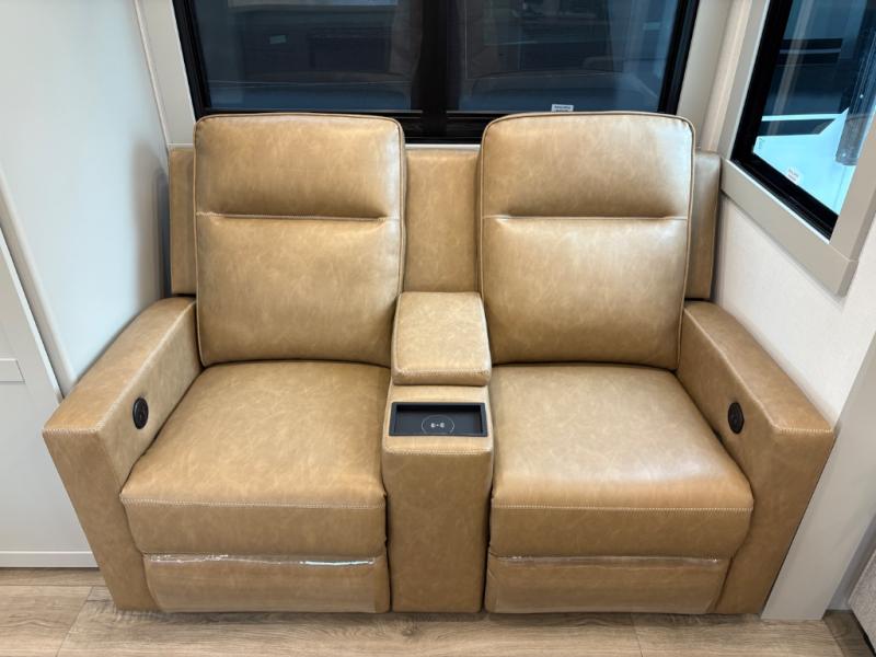 You'll love every minute spent in this spacious fifth wheel that can sleep four each night. There is a front private bedroom with a queen bed and 4x under-bed drawers to keep your space tidy. Your guests can sleep on the tri-fold sofa that extends to a 54" x 70" bed at night. The theater seating sits directly across from the 50" articulating TV for movie nights, and the pantry with drawers is right next to the theater seating for quick access to snacks! The chef of your group is sure to love the kitchen with its ample counter space, 30" residential microwave, and a sliding dining table with a drawer for even more storage. The desk in the back will allow you to get some work done if needed, or you can just spend your days outdoors under the two power awnings. There is also an exterior 12V refrigerator and storage, exterior speakers and controls, and a pass-thru storage for camp gear!