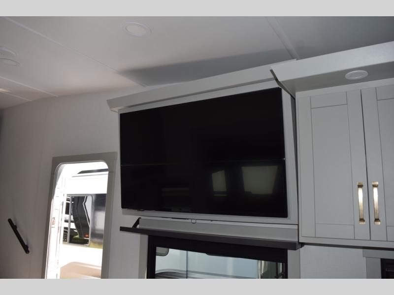 You'll love every minute spent in this spacious fifth wheel that can sleep four each night. There is a front private bedroom with a queen bed and 4x under-bed drawers to keep your space tidy. Your guests can sleep on the tri-fold sofa that extends to a 54" x 70" bed at night. The theater seating sits directly across from the 50" articulating TV for movie nights, and the pantry with drawers is right next to the theater seating for quick access to snacks! The chef of your group is sure to love the kitchen with its ample counter space, 30" residential microwave, and a sliding dining table with a drawer for even more storage. The desk in the back will allow you to get some work done if needed, or you can just spend your days outdoors under the two power awnings. There is also an exterior 12V refrigerator and storage, exterior speakers and controls, and a pass-thru storage for camp gear!