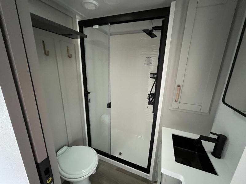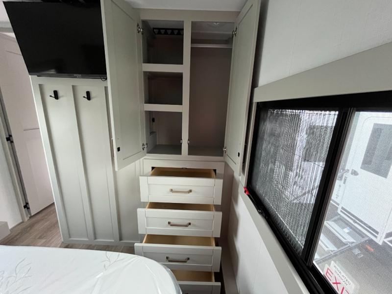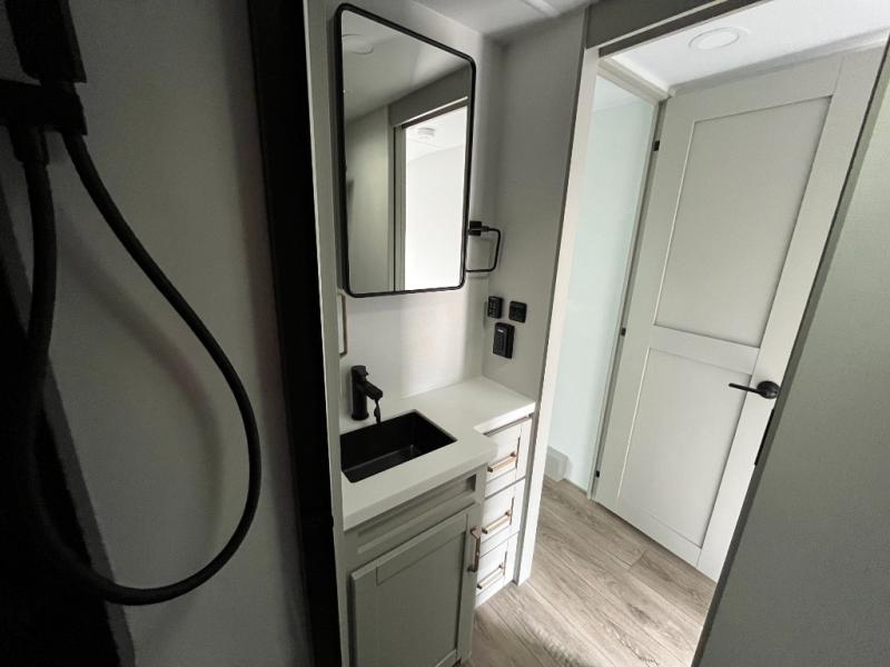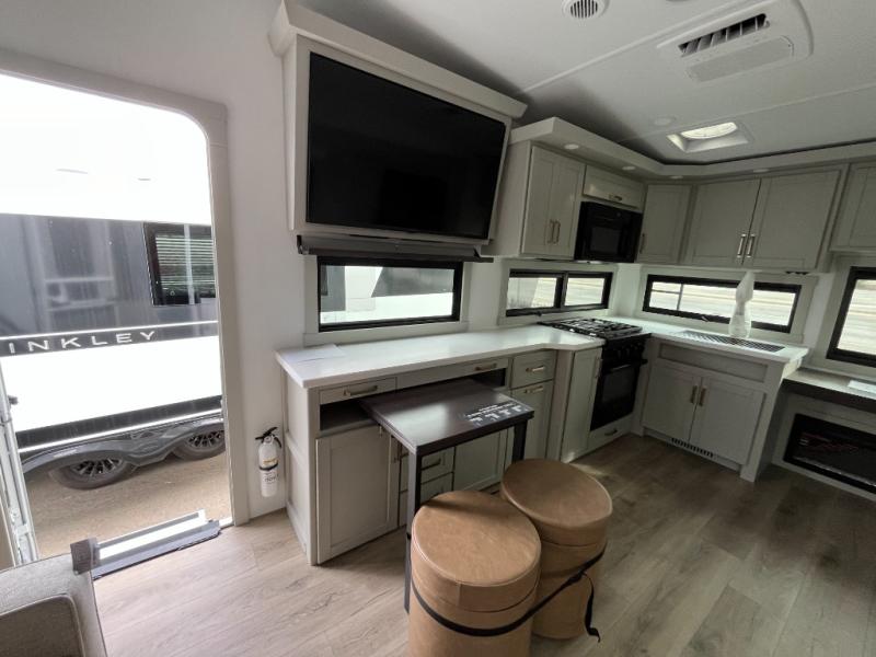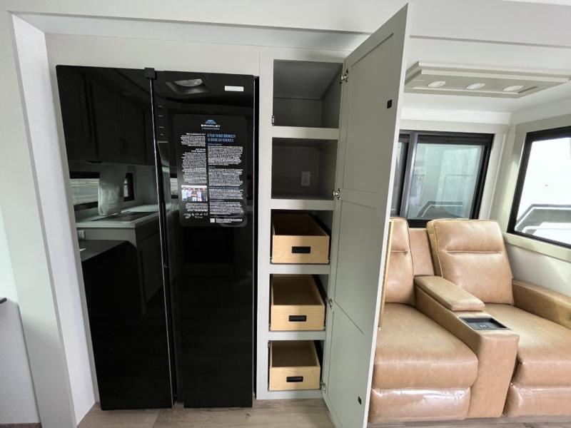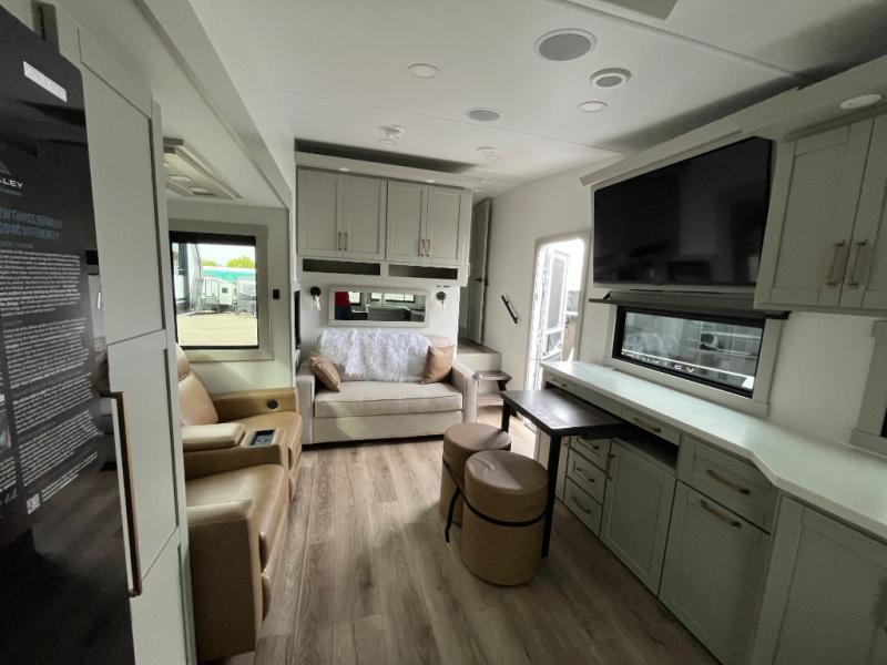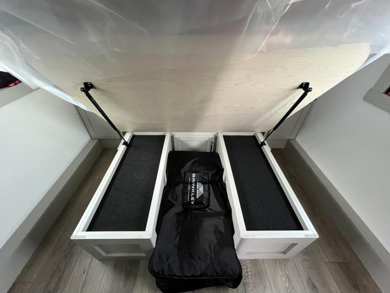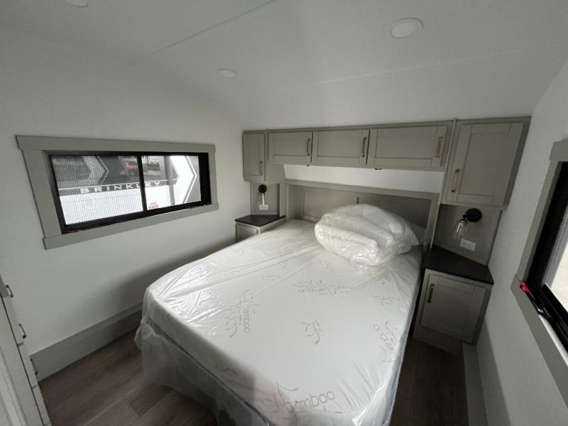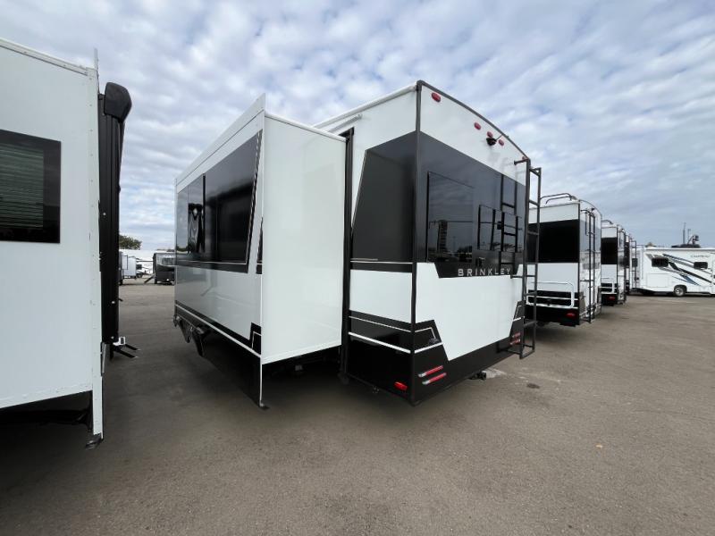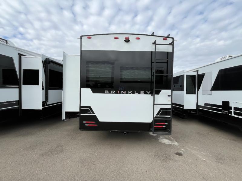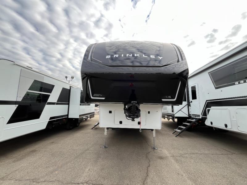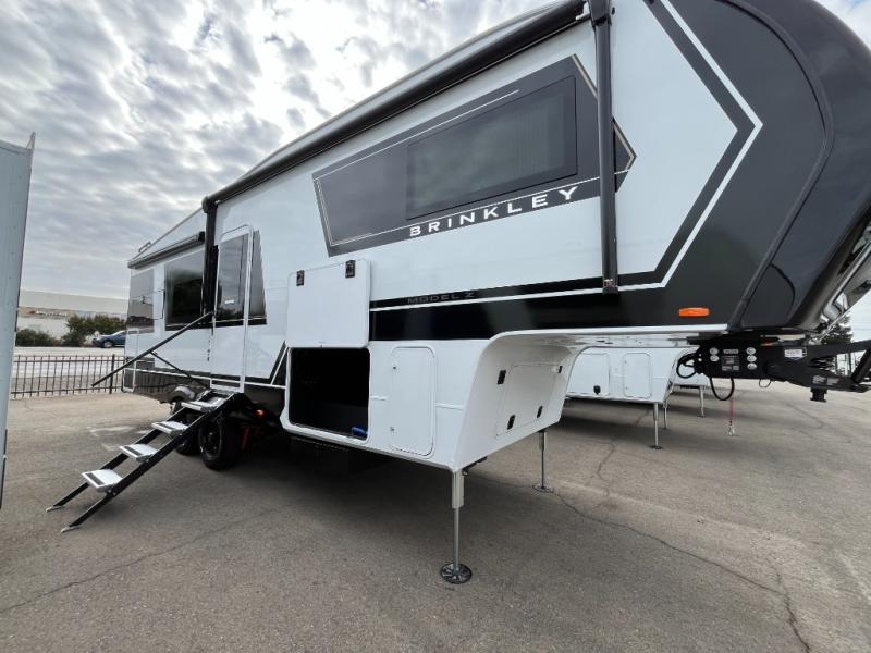 The Brinkley mid-profile Model Z fifth wheels bring you clean lines and an upscale look with plenty of style and exciting new features like the industry first brass plumbing connections. These units also feature an automotive grade front cap, plenty of exterior storage, dual exterior hot and cold showers, and wide stance leveling jacks for easy set up. Residential frameless windows provide a clean look and beautiful views, and ample electrical outlets and USB/USB-C outlets allow all of your electronics and appliances to easily be used and charged.