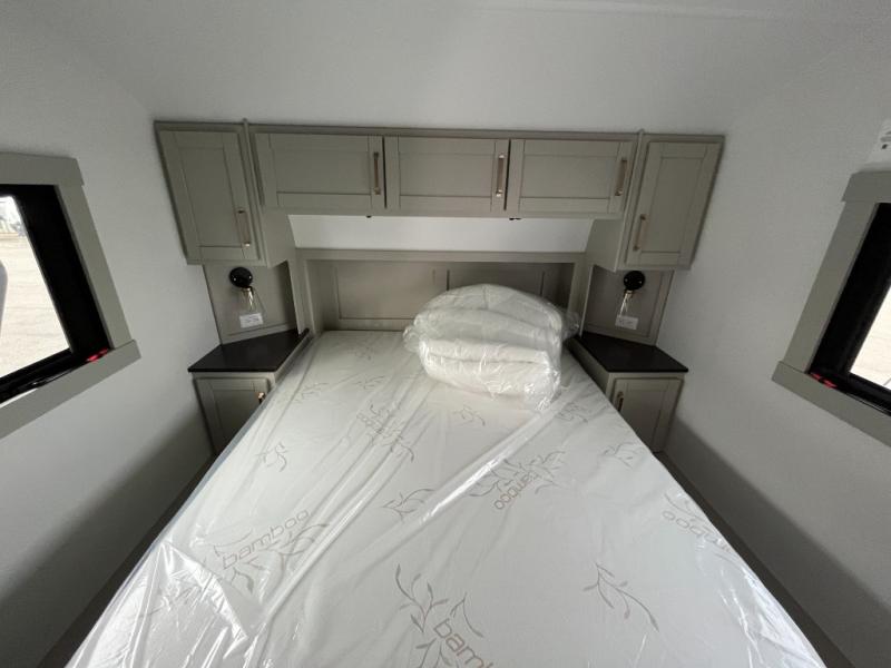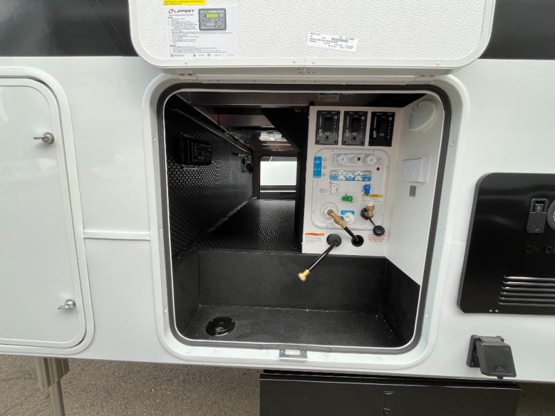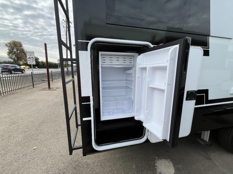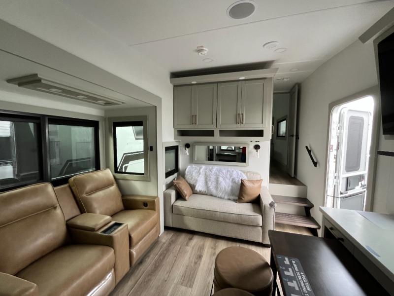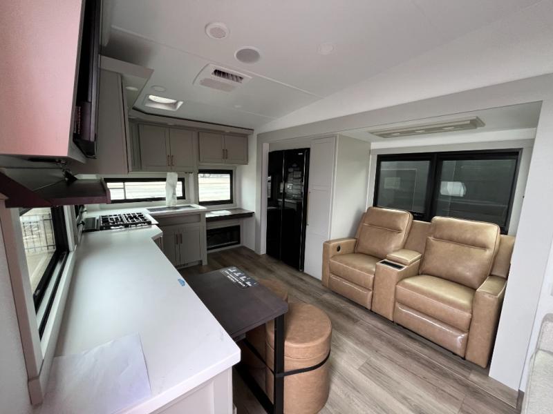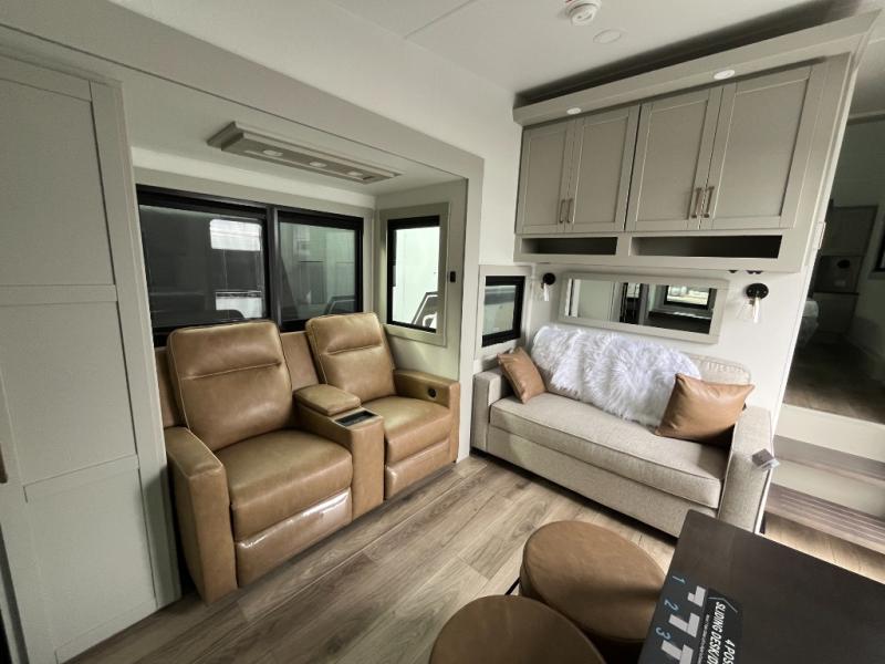 You'll love every minute spent in this spacious fifth wheel that can sleep four each night. There is a front private bedroom with a queen bed and 4x under-bed drawers to keep your space tidy. Your guests can sleep on the tri-fold sofa that extends to a 54" x 70" bed at night. The theater seating sits directly across from the 50" articulating TV for movie nights, and the pantry with drawers is right next to the theater seating for quick access to snacks! The chef of your group is sure to love the kitchen with its ample counter space, 30" residential microwave, and a sliding dining table with a drawer for even more storage. The desk in the back will allow you to get some work done if needed, or you can just spend your days outdoors under the two power awnings. There is also an exterior 12V refrigerator and storage, exterior speakers and controls, and a pass-thru storage for camp gear!