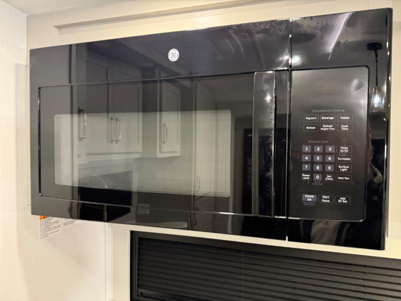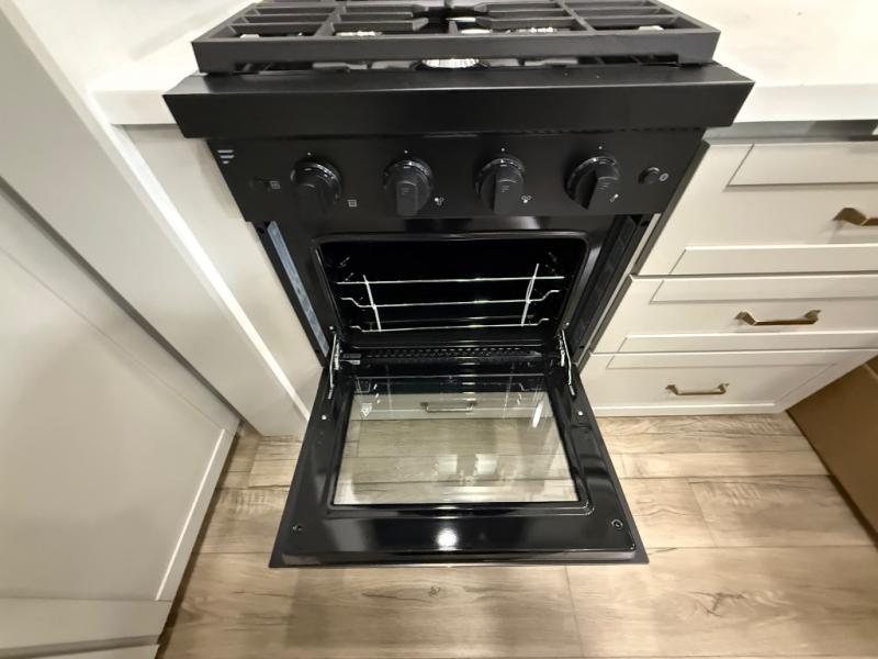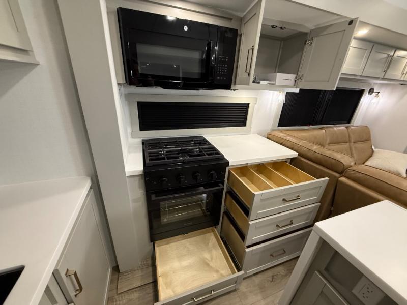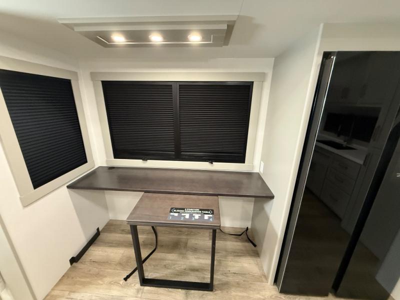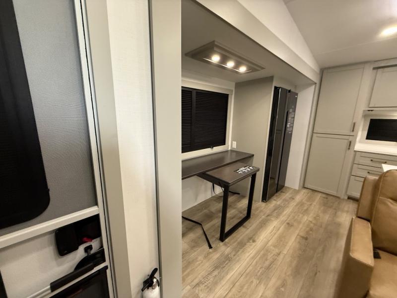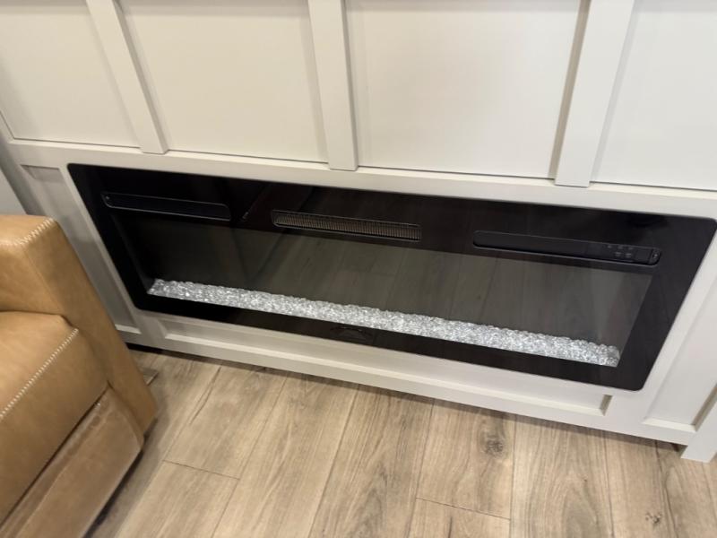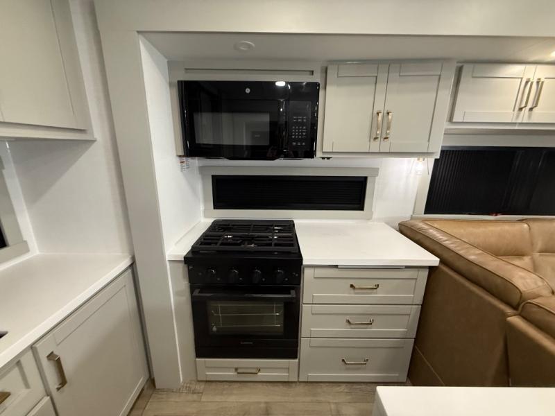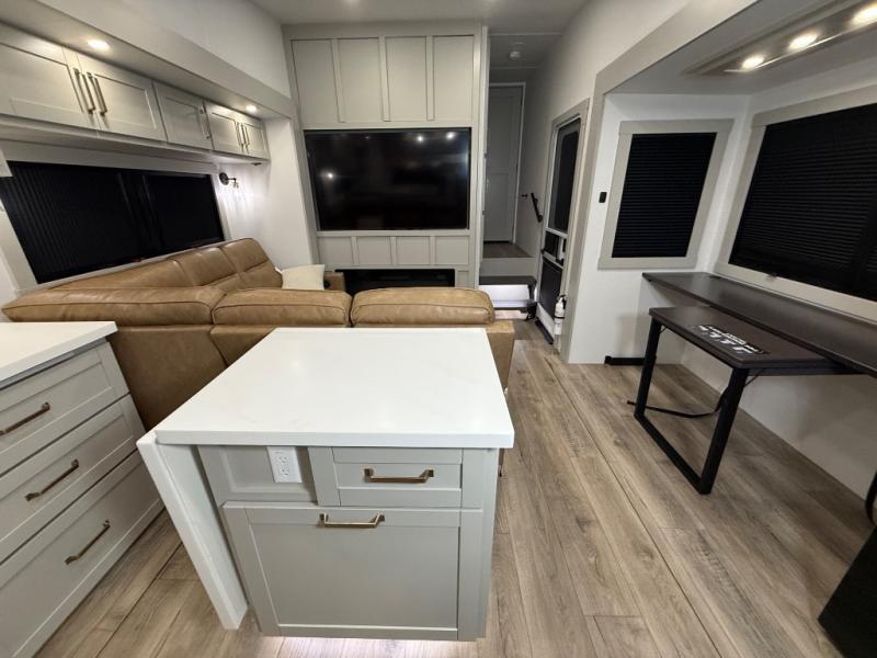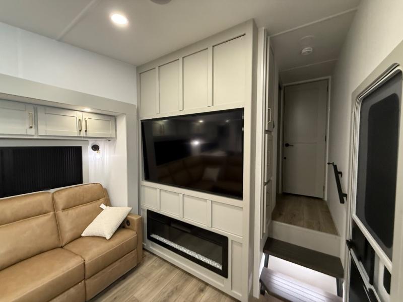 Featuring a spacious L-sofa with four recliners and a 65” articulating TV for endless entertainment, this fifth wheel is a great option to get on the road! The convertible dining table/L desk seats up to four people, making it perfect for meals, work, or play. You can cozy up by the fireplace and enjoy quality time with loved ones. Plus, ample shoe storage keeps your gear organized. The kitchen is equipped with solid surface countertops, dishwasher prep, a residential microwave, and a three-burner cooktop. Also, the large pantry with pull-out drawers provides ample storage for your favorite ingredients and cooking essentials. The one-piece fiberglass shower is a highlight of the bathroom, offering a convenient space to get ready, and additional storage is provided by the linen closet. And you will love the front main bedroom featuring a residential queen memory foam mattress with nightstands, outlets, and USB & USB-C ports for convenient charging.