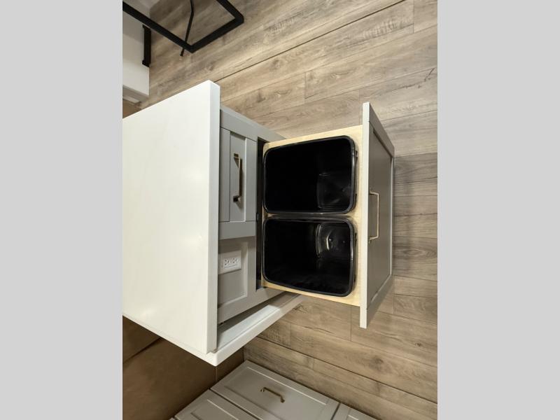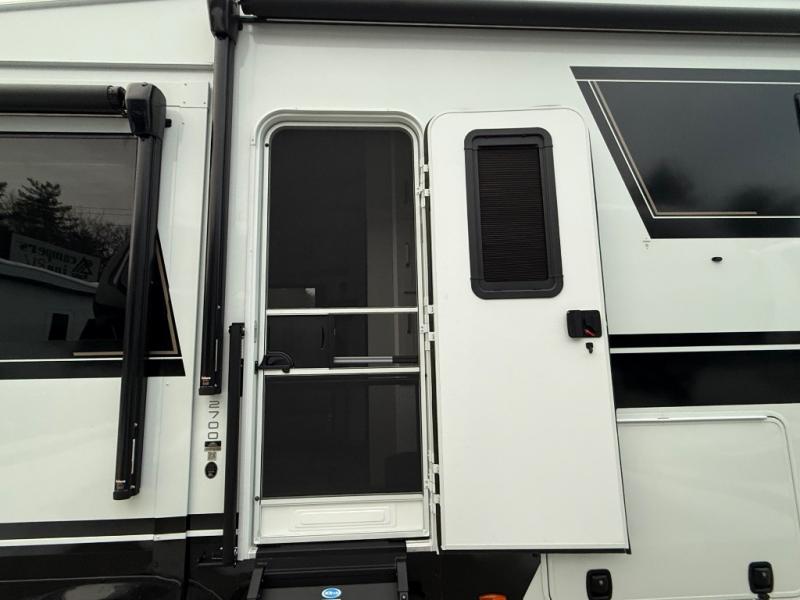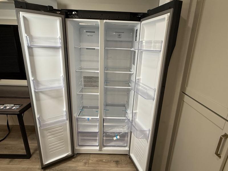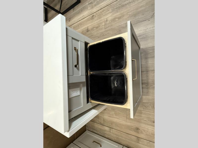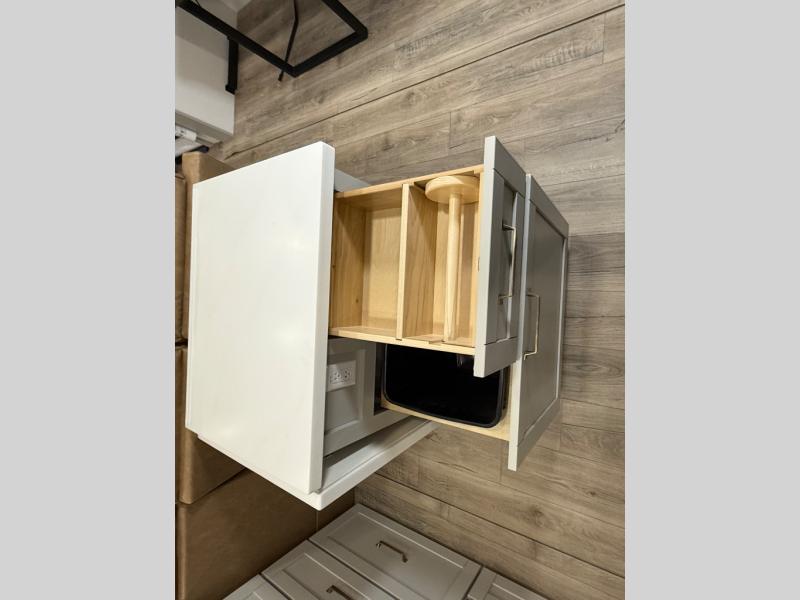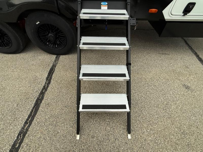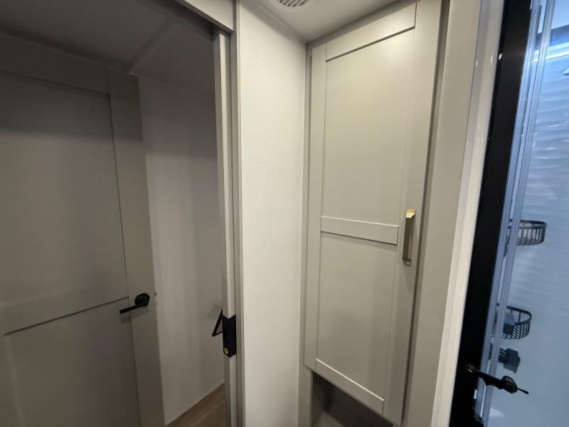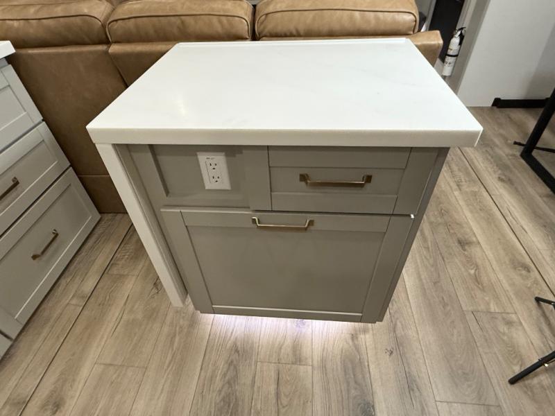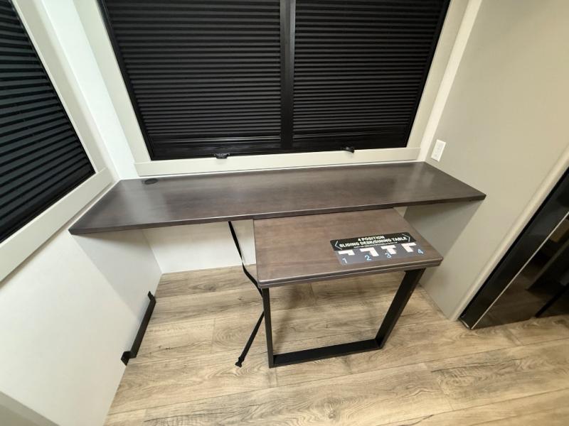 Featuring a spacious L-sofa with four recliners and a 65” articulating TV for endless entertainment, this fifth wheel is a great option to get on the road! The convertible dining table/L desk seats up to four people, making it perfect for meals, work, or play. You can cozy up by the fireplace and enjoy quality time with loved ones. Plus, ample shoe storage keeps your gear organized. The kitchen is equipped with solid surface countertops, dishwasher prep, a residential microwave, and a three-burner cooktop. Also, the large pantry with pull-out drawers provides ample storage for your favorite ingredients and cooking essentials. The one-piece fiberglass shower is a highlight of the bathroom, offering a convenient space to get ready, and additional storage is provided by the linen closet. And you will love the front main bedroom featuring a residential queen memory foam mattress with nightstands, outlets, and USB & USB-C ports for convenient charging.
