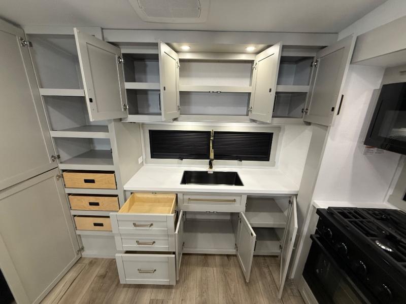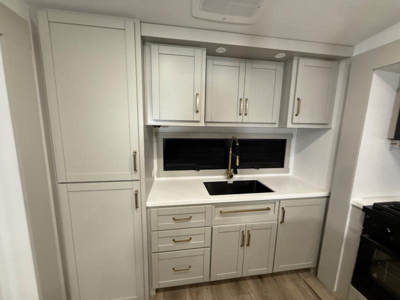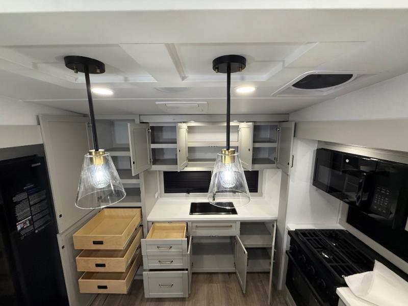 The Brinkley mid-profile Model Z fifth wheels bring you clean lines and an upscale look with plenty of style and exciting new features like the industry first brass plumbing connections. These units also feature an automotive grade front cap, plenty of exterior storage, exterior hot and cold showers, and wide stance leveling jacks for easy set up. Residential frameless windows provide a clean look and beautiful views, and ample electrical outlets and 6 USB/USB-C outlets allow all of your electronics and appliances to easily be used and charged.