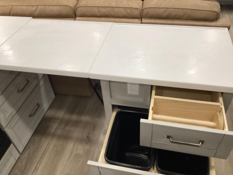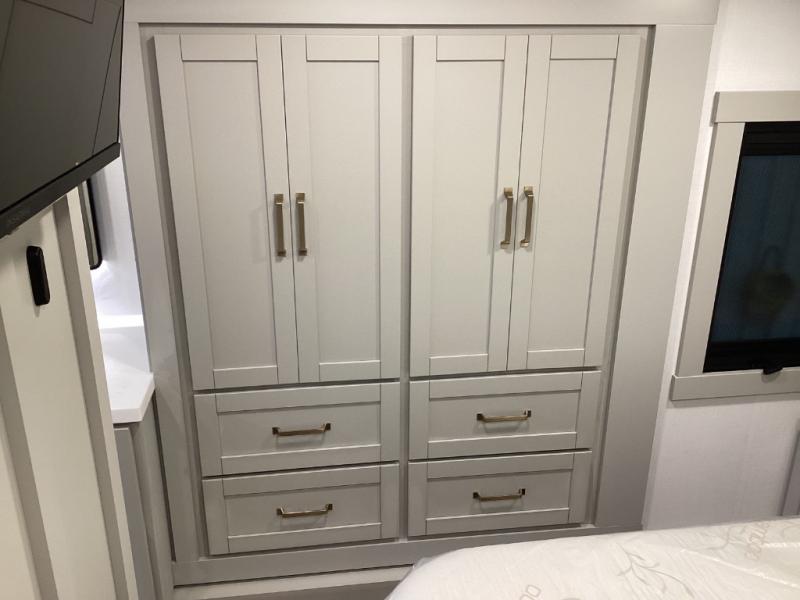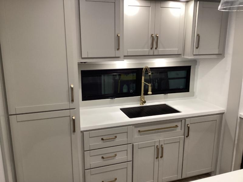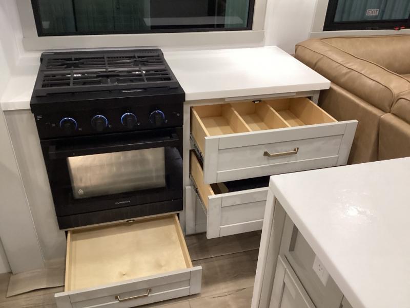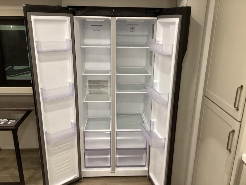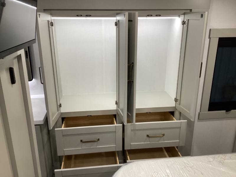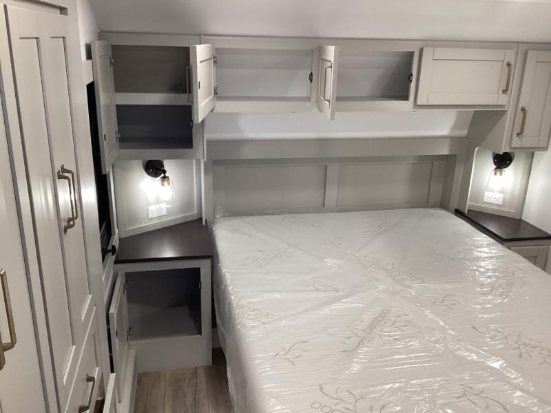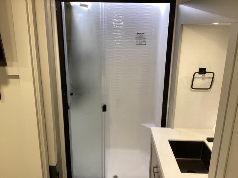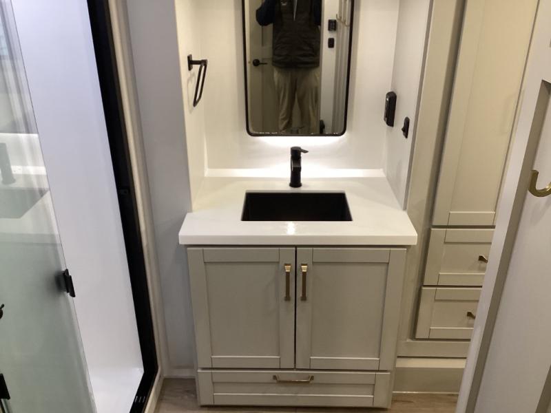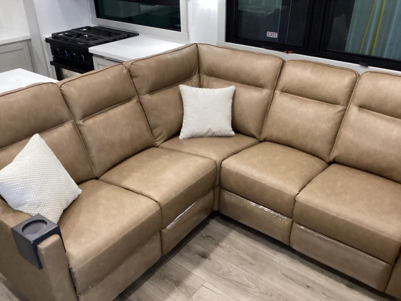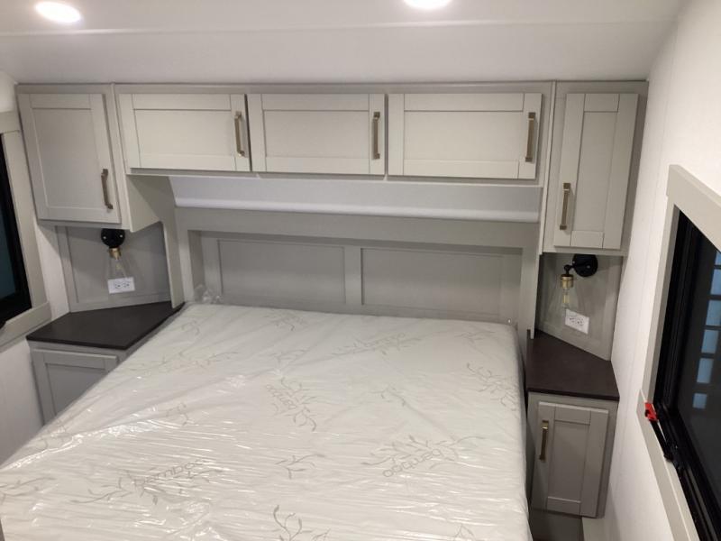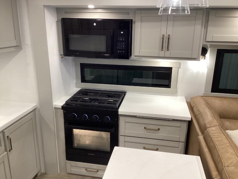 Inside, you’ll find a spacious layout designed for modern living on the road. From the upscale kitchen with premium appliances and solid-surface countertops to a living area built for relaxation with theater-seating and ambient lighting, this Model Z checks the “home away from home” box and then some. The private master suite offers a retreat of its own, while high-end touches throughout (luxury trim, oversized windows, smart storage) make this fifth-wheel feel far above the competition.