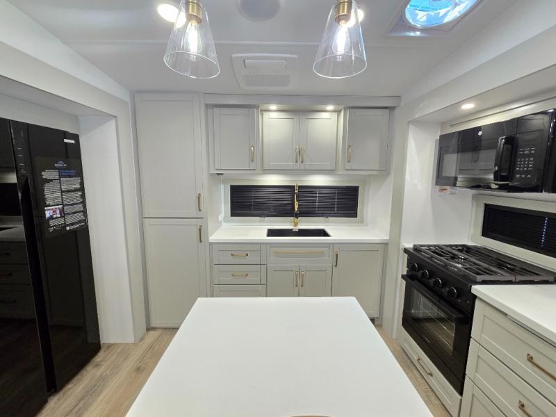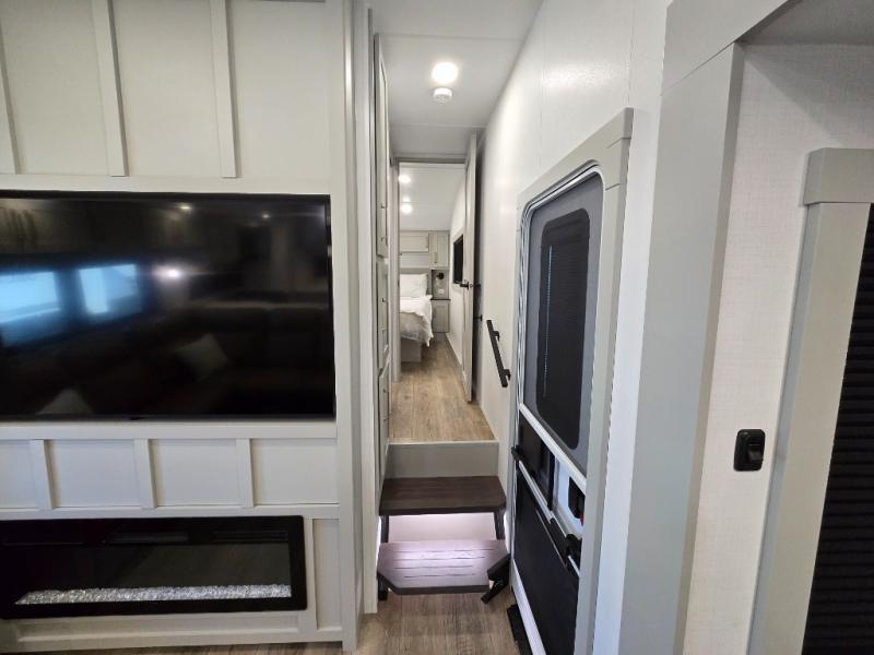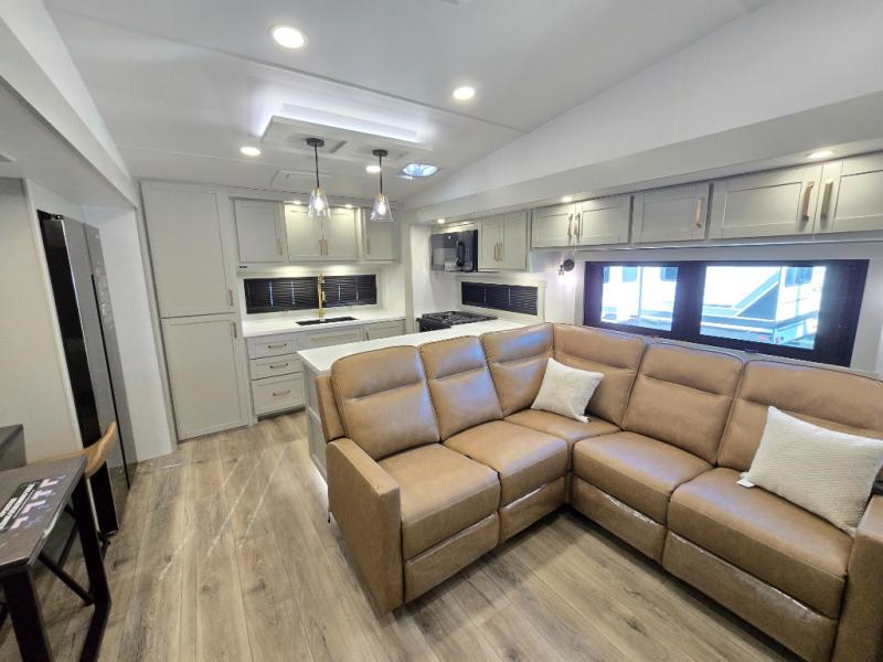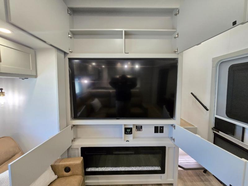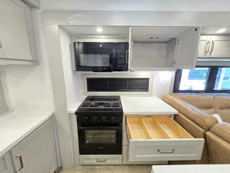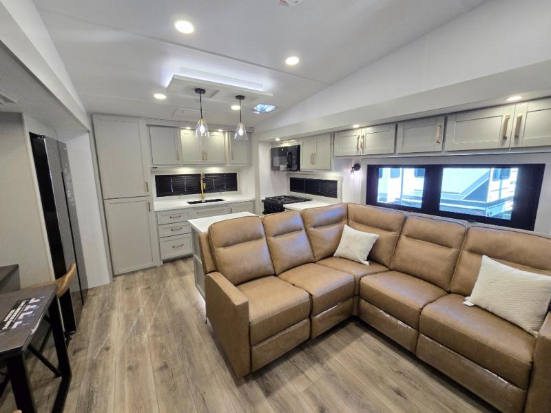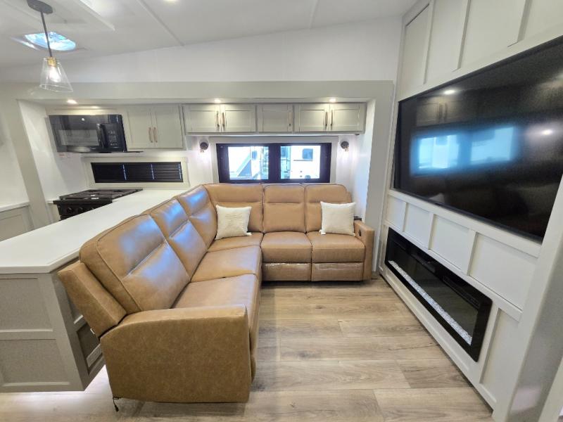 Featuring a spacious L-sofa with four recliners and a 65” articulating TV for endless entertainment, this fifth wheel is a great option to get on the road! The convertible dining table/L desk seats up to four people, making it perfect for meals, work, or play. You can cozy up by the fireplace and enjoy quality time with loved ones. Plus, ample shoe storage keeps your gear organized. The kitchen is equipped with solid surface countertops, dishwasher prep, a residential microwave, and a three-burner cooktop. Also, the large pantry with pull-out drawers provides ample storage for your favorite ingredients and cooking essentials. The one-piece fiberglass shower is a highlight of the bathroom, offering a convenient space to get ready, and additional storage is provided by the linen closet. And you will love the front main bedroom featuring a residential queen memory foam mattress with nightstands, outlets, and USB & USB-C ports for convenient charging.
