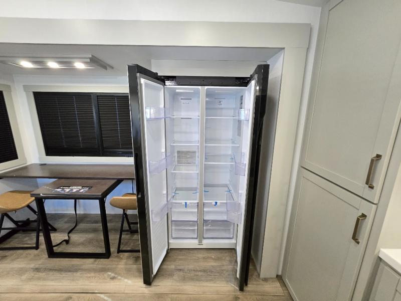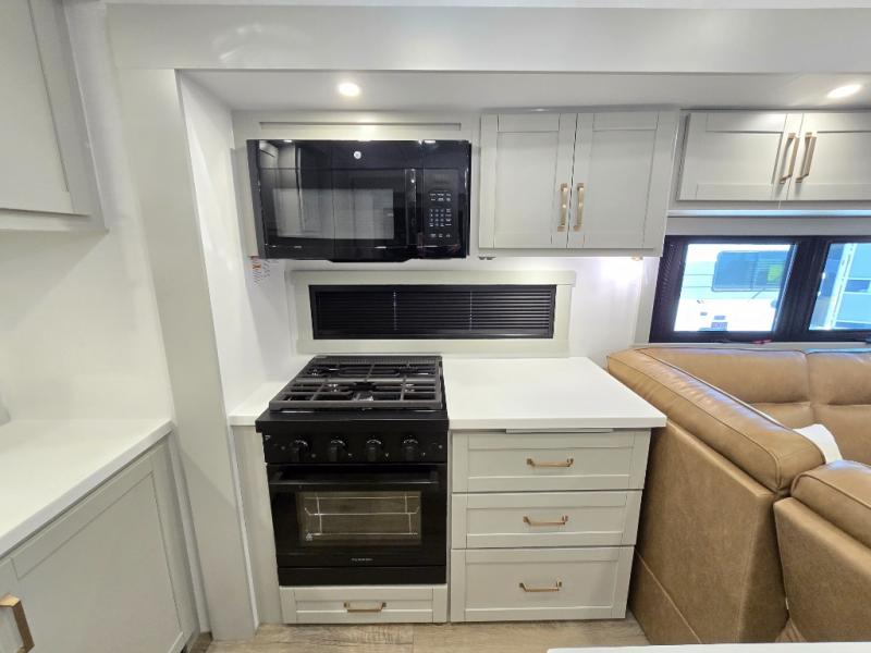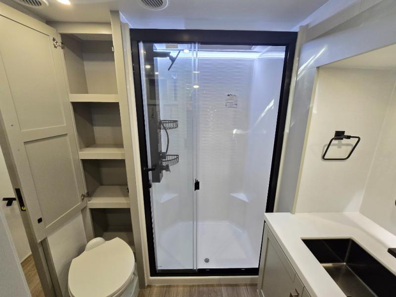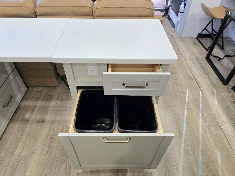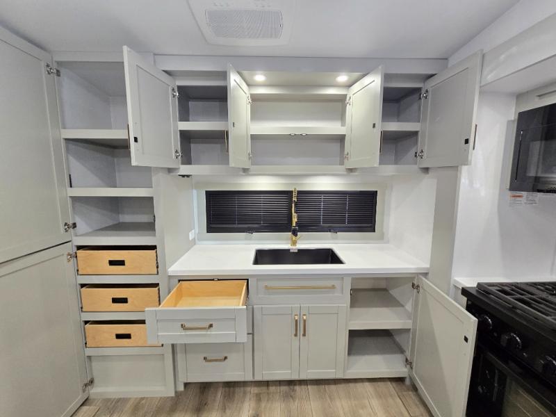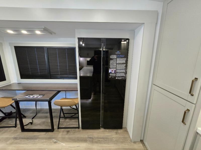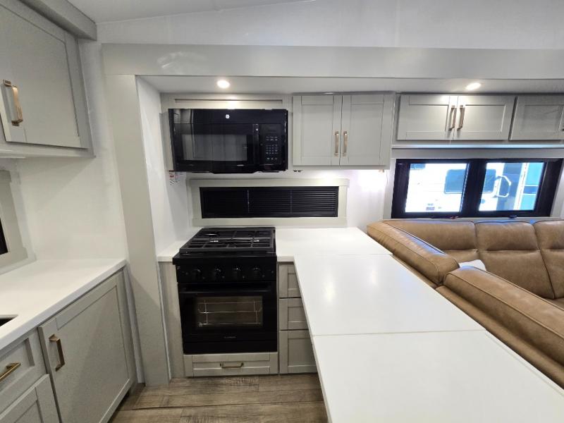 Featuring a spacious L-sofa with four recliners and a 65” articulating TV for endless entertainment, this fifth wheel is a great option to get on the road! The convertible dining table/L desk seats up to four people, making it perfect for meals, work, or play. You can cozy up by the fireplace and enjoy quality time with loved ones. Plus, ample shoe storage keeps your gear organized. The kitchen is equipped with solid surface countertops, dishwasher prep, a residential microwave, and a three-burner cooktop. Also, the large pantry with pull-out drawers provides ample storage for your favorite ingredients and cooking essentials. The one-piece fiberglass shower is a highlight of the bathroom, offering a convenient space to get ready, and additional storage is provided by the linen closet. And you will love the front main bedroom featuring a residential queen memory foam mattress with nightstands, outlets, and USB & USB-C ports for convenient charging.