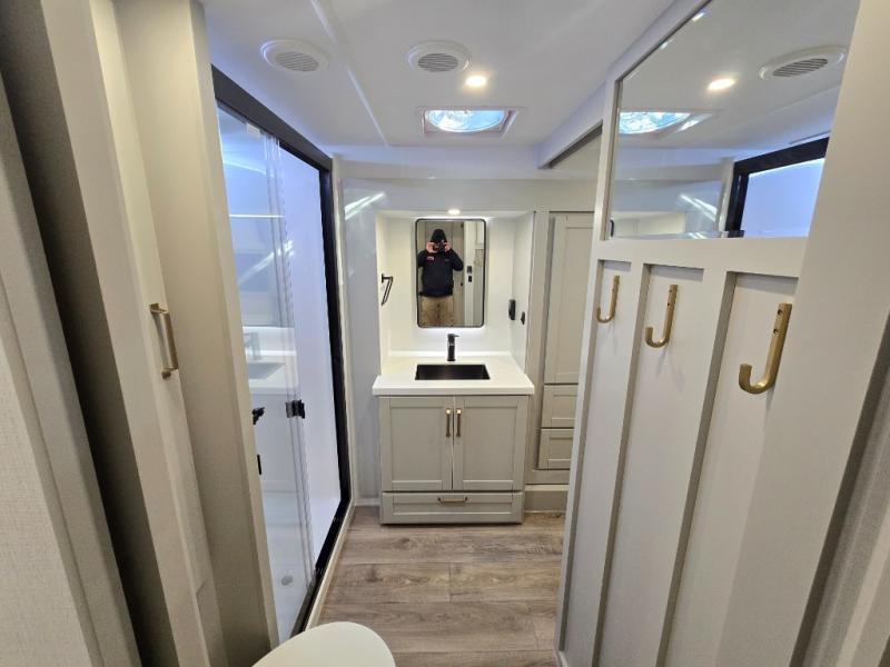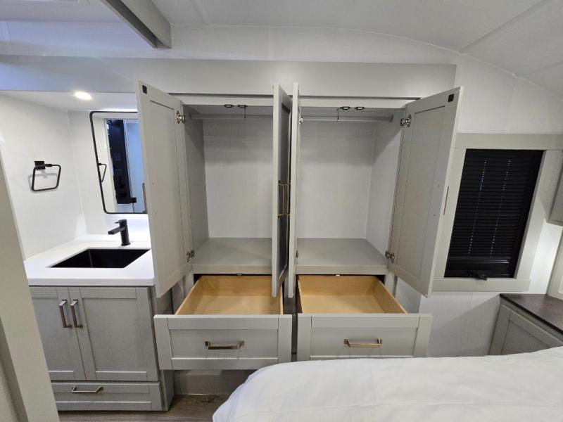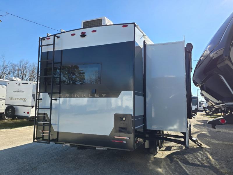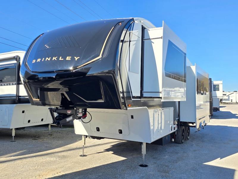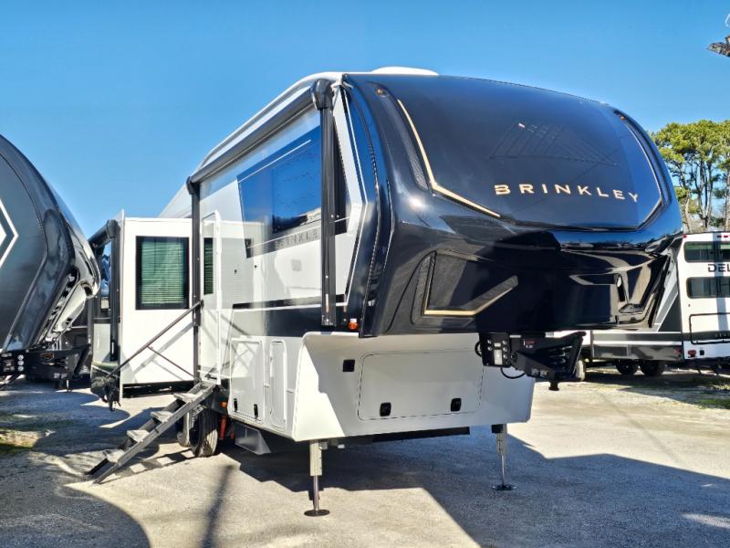 The Brinkley mid-profile Model Z fifth wheels bring you clean lines and an upscale look with plenty of style and exciting new features like the industry first brass plumbing connections. These units also feature an automotive grade front cap, plenty of exterior storage, exterior hot and cold showers, and wide stance leveling jacks for easy set up. Residential frameless windows provide a clean look and beautiful views, and ample electrical outlets and 6 USB/USB-C outlets allow all of your electronics and appliances to easily be used and charged.