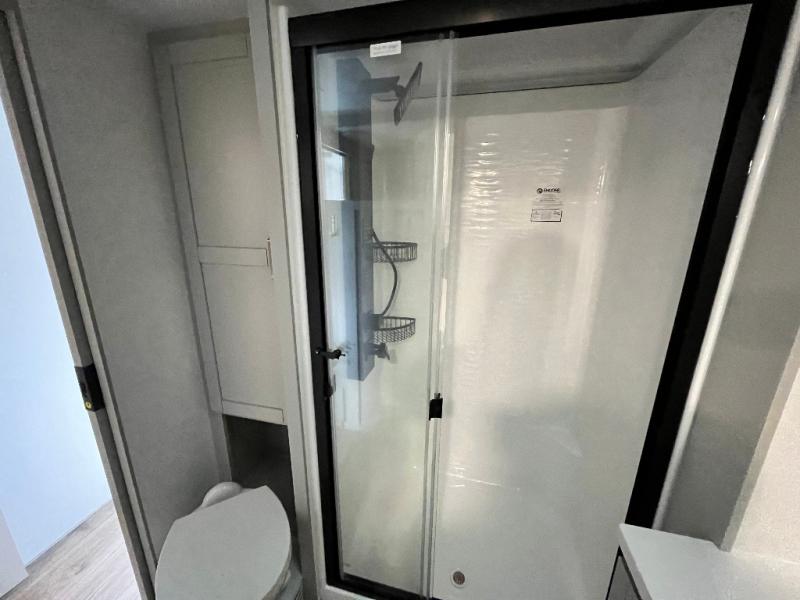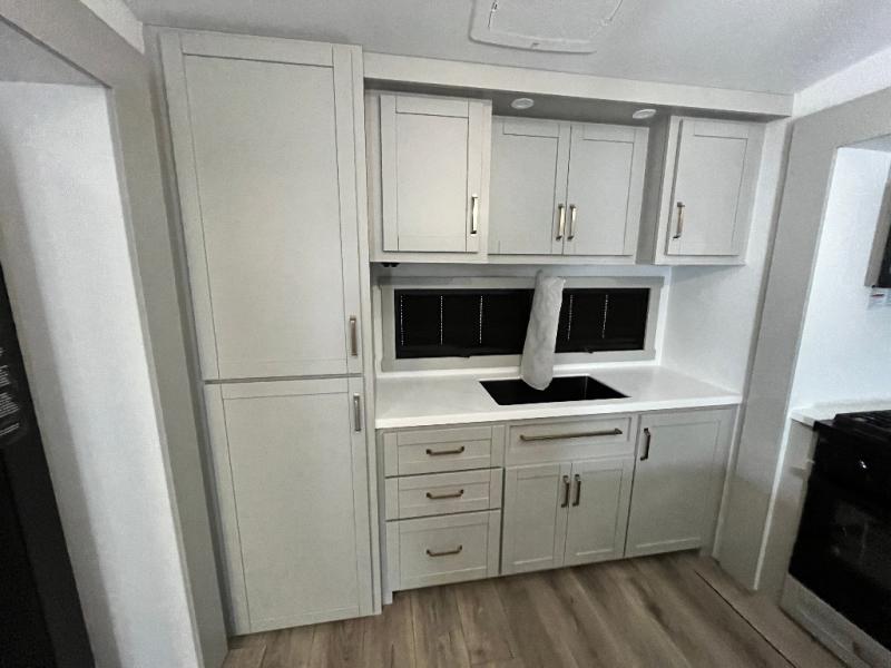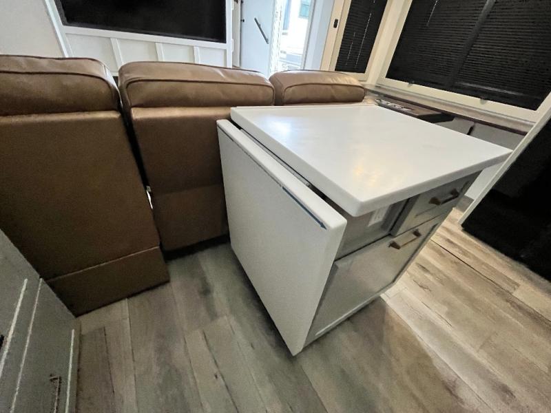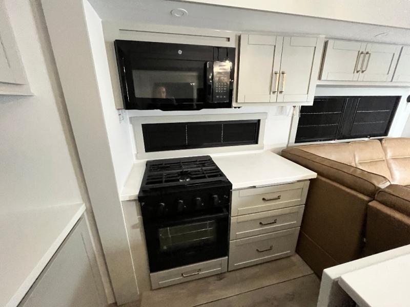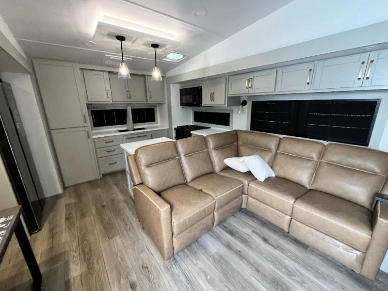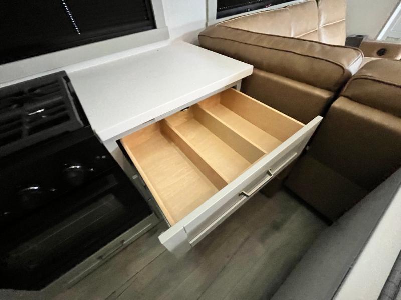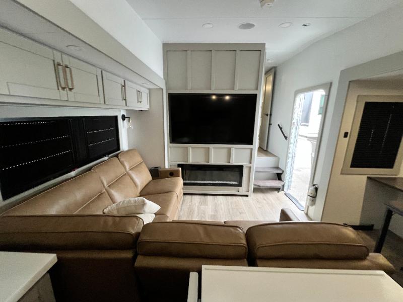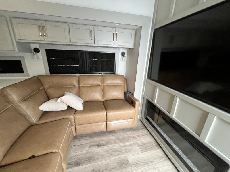Featuring a spacious L-sofa with four recliners and a 65” articulating TV for endless entertainment, this fifth wheel is a great option to get on the road! The convertible dining table/L desk seats up to four people, making it perfect for meals, work, or play. You can cozy up by the fireplace and enjoy quality time with loved ones. Plus, ample shoe storage keeps your gear organized. The kitchen is equipped with solid surface countertops, dishwasher prep, a residential microwave, and a three-burner cooktop. Also, the large pantry with pull-out drawers provides ample storage for your favorite ingredients and cooking essentials. The one-piece fiberglass shower is a highlight of the bathroom, offering a convenient space to get ready, and additional storage is provided by the linen closet. And you will love the front main bedroom featuring a residential queen memory foam mattress with nightstands, outlets, and USB & USB-C ports for convenient charging.