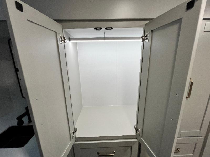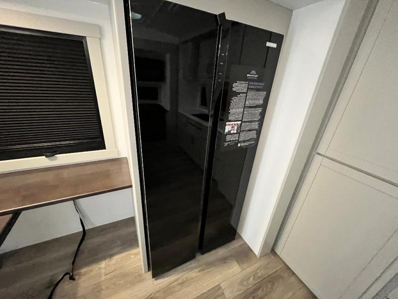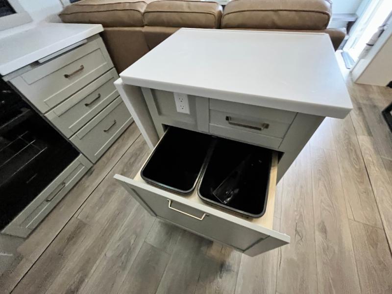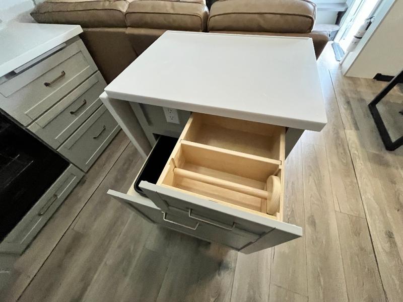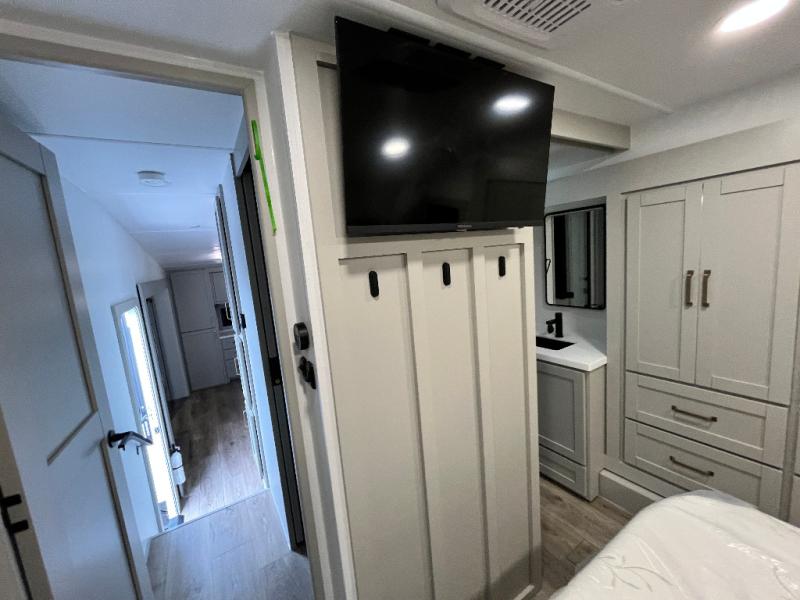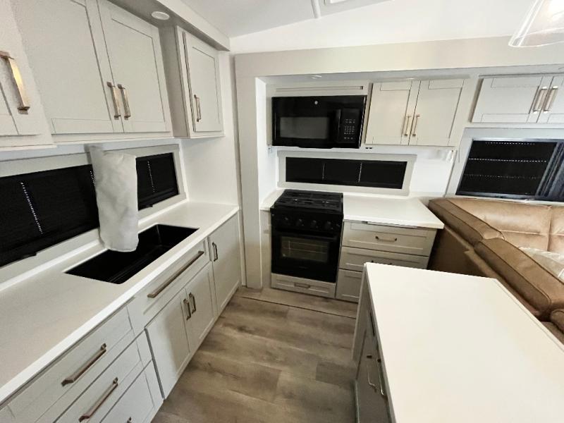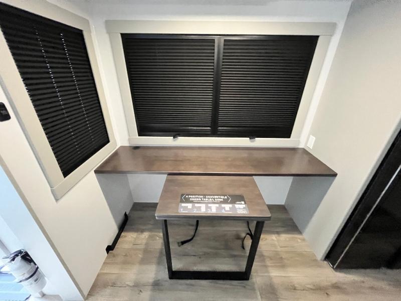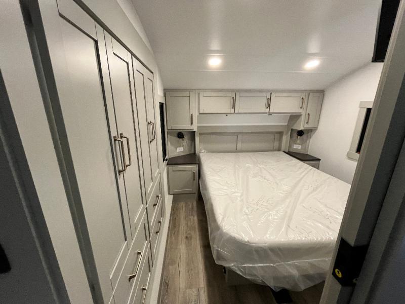 Featuring a spacious L-sofa with four recliners and a 65” articulating TV for endless entertainment, this fifth wheel is a great option to get on the road! The convertible dining table/L desk seats up to four people, making it perfect for meals, work, or play. You can cozy up by the fireplace and enjoy quality time with loved ones. Plus, ample shoe storage keeps your gear organized. The kitchen is equipped with solid surface countertops, dishwasher prep, a residential microwave, and a three-burner cooktop. Also, the large pantry with pull-out drawers provides ample storage for your favorite ingredients and cooking essentials. The one-piece fiberglass shower is a highlight of the bathroom, offering a convenient space to get ready, and additional storage is provided by the linen closet. And you will love the front main bedroom featuring a residential queen memory foam mattress with nightstands, outlets, and USB & USB-C ports for convenient charging.
