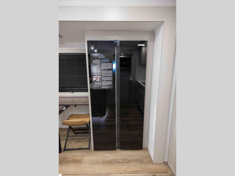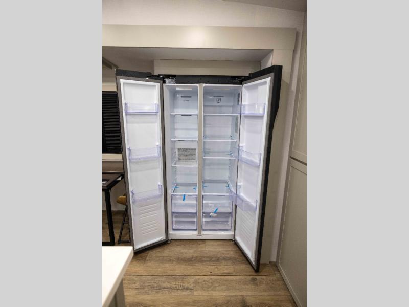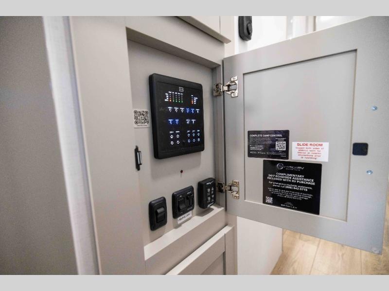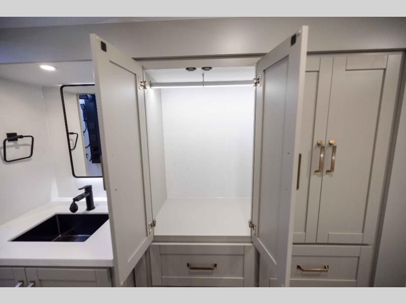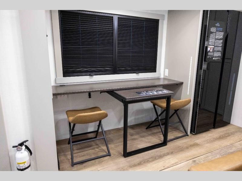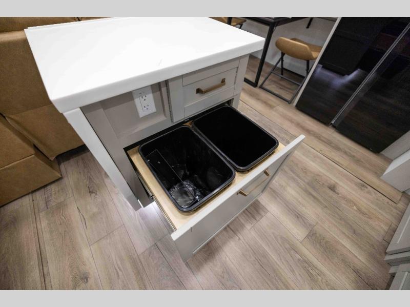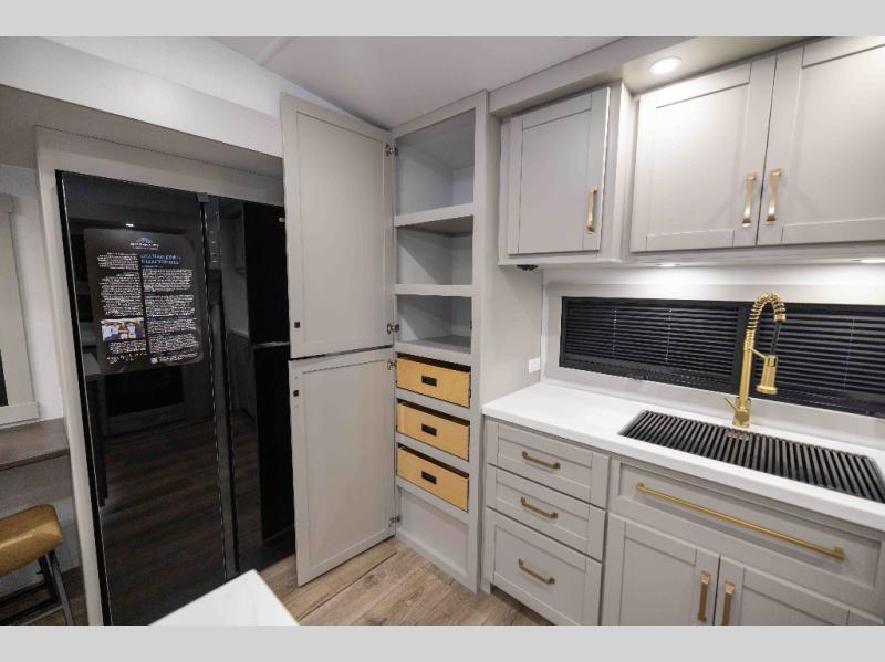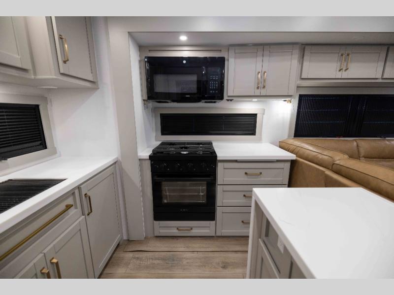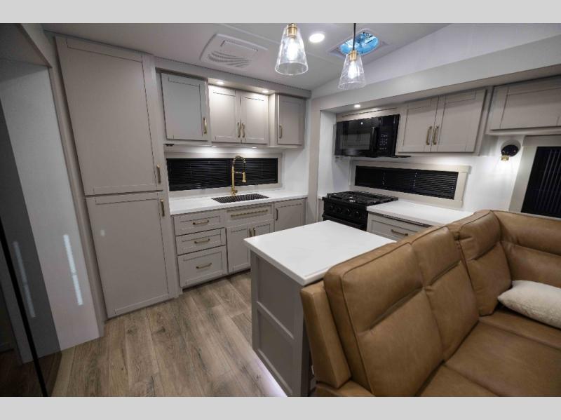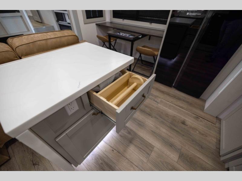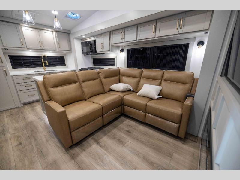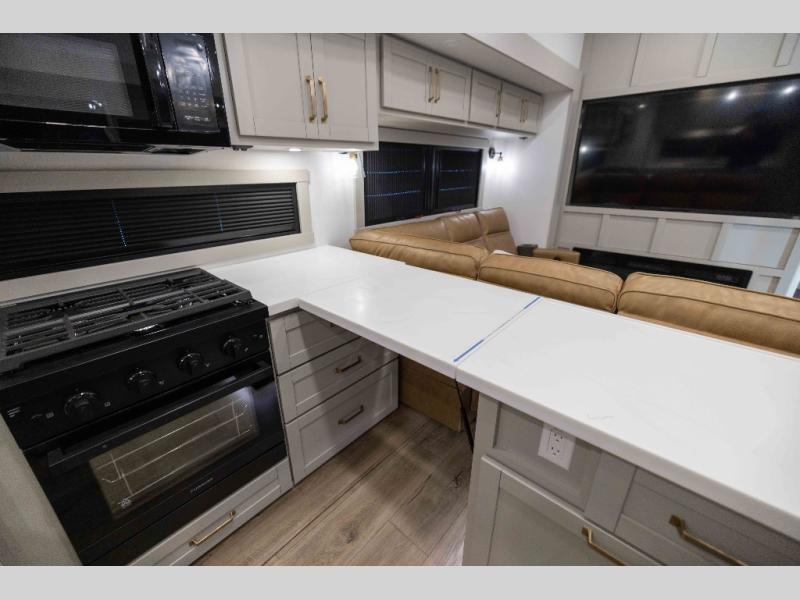 Featuring a spacious L-sofa with four recliners and a 65” articulating TV for endless entertainment, this fifth wheel is a great option to get on the road! The convertible dining table/L desk seats up to four people, making it perfect for meals, work, or play. You can cozy up by the fireplace and enjoy quality time with loved ones. Plus, ample shoe storage keeps your gear organized. The kitchen is equipped with solid surface countertops, dishwasher prep, a residential microwave, and a three-burner cooktop. Also, the large pantry with pull-out drawers provides ample storage for your favorite ingredients and cooking essentials. The one-piece fiberglass shower is a highlight of the bathroom, offering a convenient space to get ready, and additional storage is provided by the linen closet. And you will love the front main bedroom featuring a residential queen memory foam mattress with nightstands, outlets, and USB & USB-C ports for convenient charging.