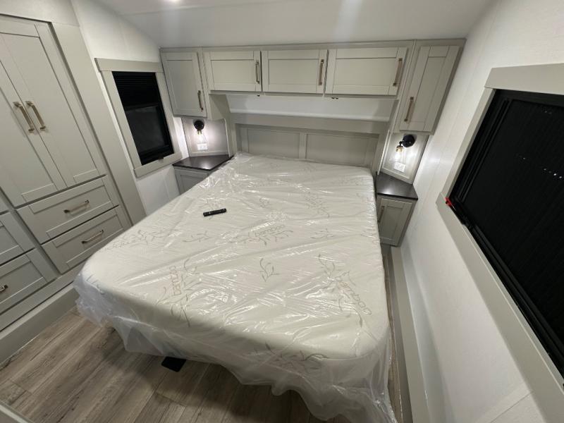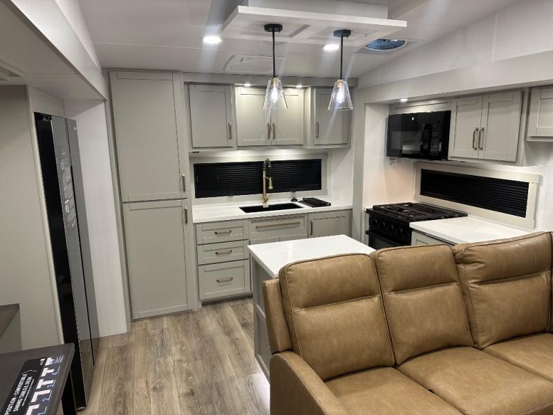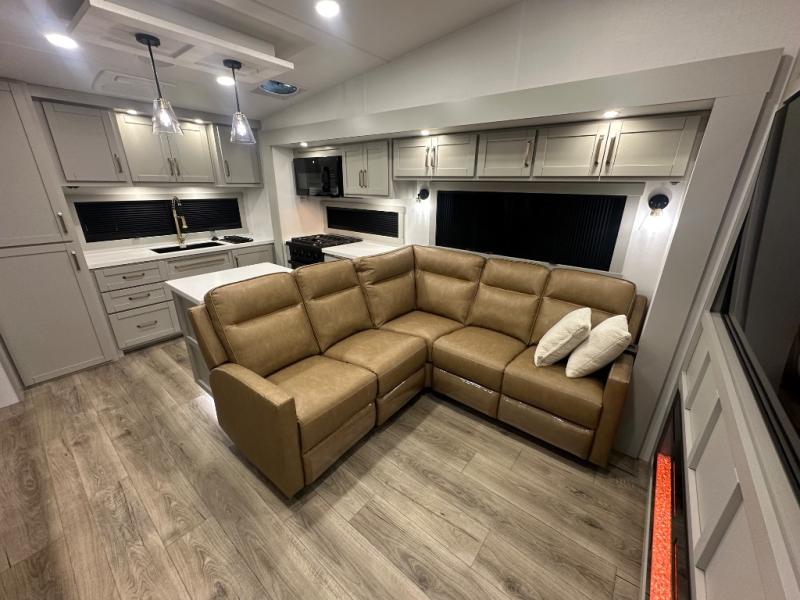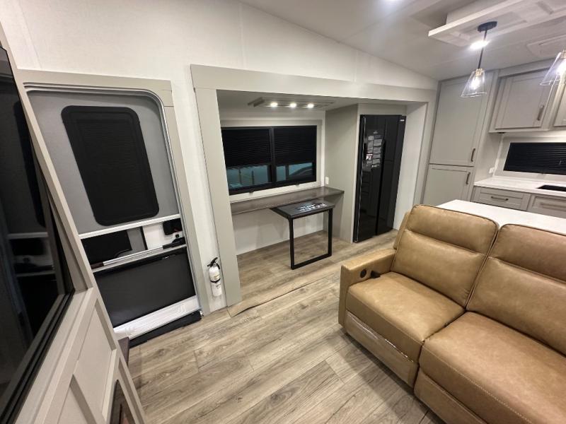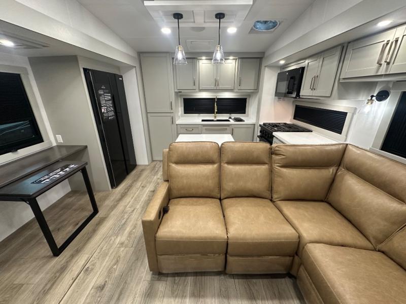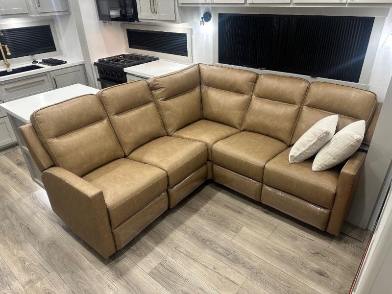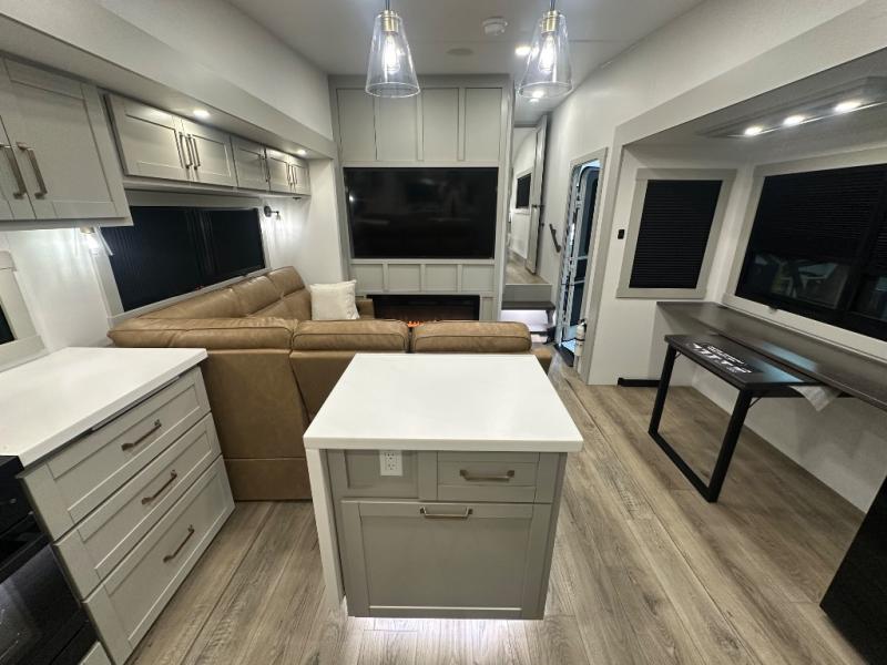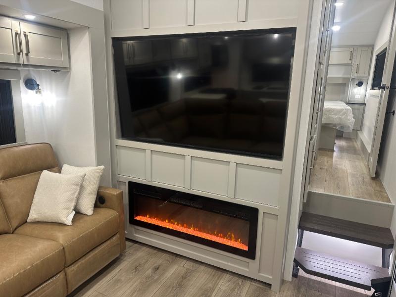 Featuring a spacious L-sofa with four recliners and a 65” articulating TV for endless entertainment, this fifth wheel is a great option to get on the road! The convertible dining table/L desk seats up to four people, making it perfect for meals, work, or play. You can cozy up by the fireplace and enjoy quality time with loved ones. Plus, ample shoe storage keeps your gear organized. The kitchen is equipped with solid surface countertops, dishwasher prep, a residential microwave, and a three-burner cooktop. Also, the large pantry with pull-out drawers provides ample storage for your favorite ingredients and cooking essentials. The one-piece fiberglass shower is a highlight of the bathroom, offering a convenient space to get ready, and additional storage is provided by the linen closet. And you will love the front main bedroom featuring a residential queen memory foam mattress with nightstands, outlets, and USB & USB-C ports for convenient charging.