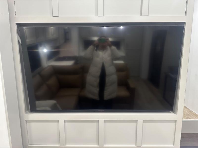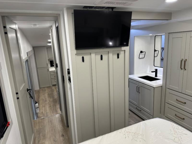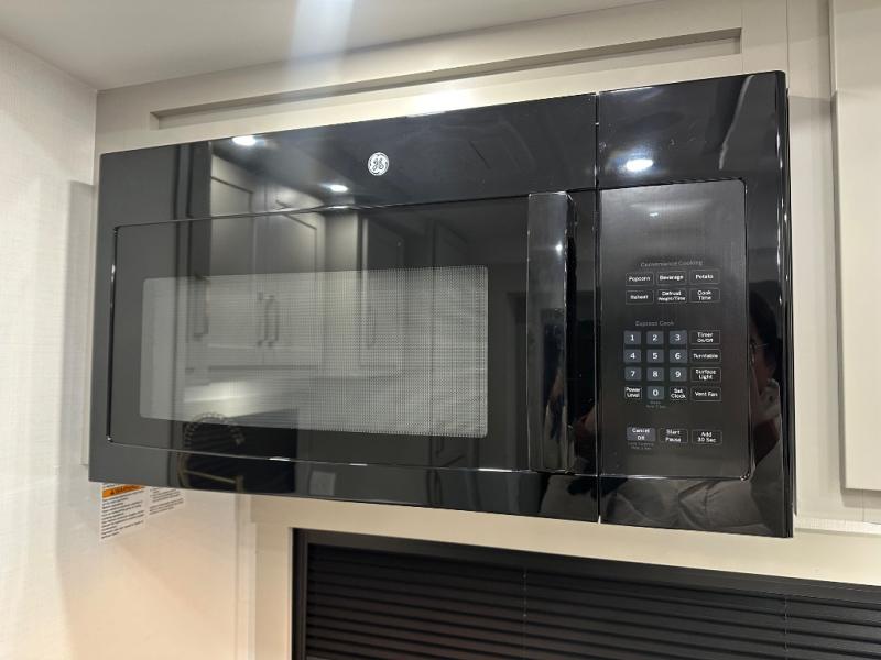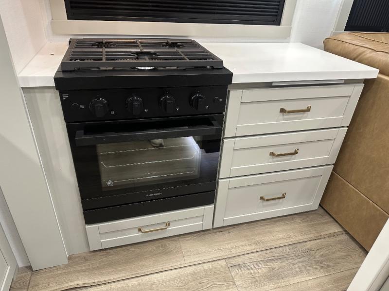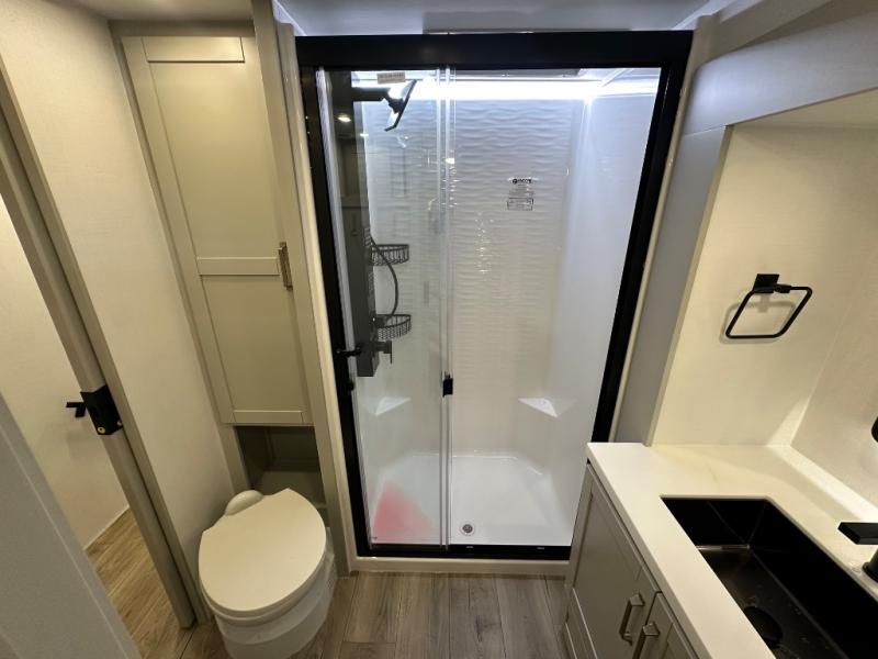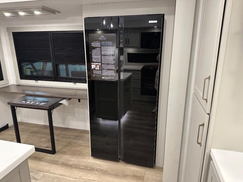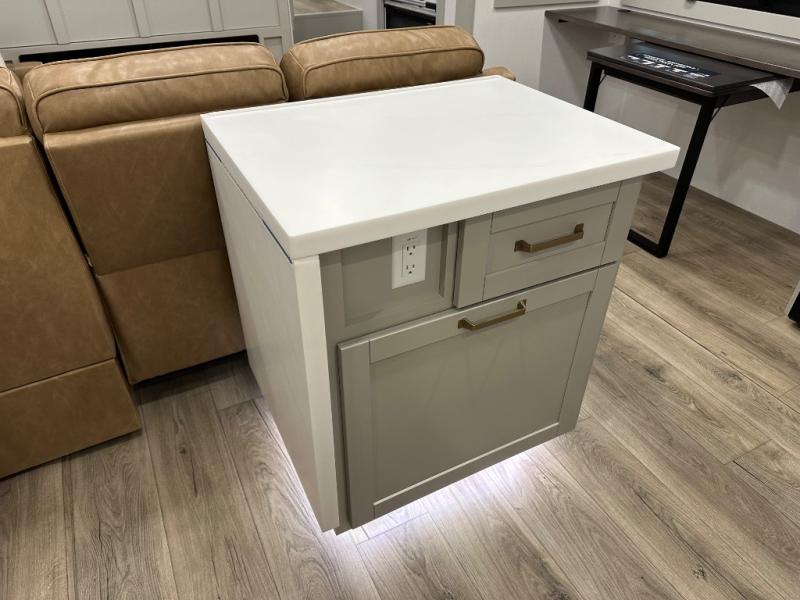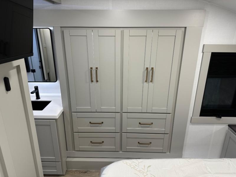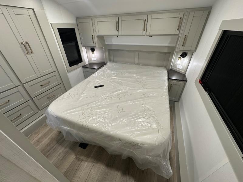 Featuring a spacious L-sofa with four recliners and a 65” articulating TV for endless entertainment, this fifth wheel is a great option to get on the road! The convertible dining table/L desk seats up to four people, making it perfect for meals, work, or play. You can cozy up by the fireplace and enjoy quality time with loved ones. Plus, ample shoe storage keeps your gear organized. The kitchen is equipped with solid surface countertops, dishwasher prep, a residential microwave, and a three-burner cooktop. Also, the large pantry with pull-out drawers provides ample storage for your favorite ingredients and cooking essentials. The one-piece fiberglass shower is a highlight of the bathroom, offering a convenient space to get ready, and additional storage is provided by the linen closet. And you will love the front main bedroom featuring a residential queen memory foam mattress with nightstands, outlets, and USB & USB-C ports for convenient charging.