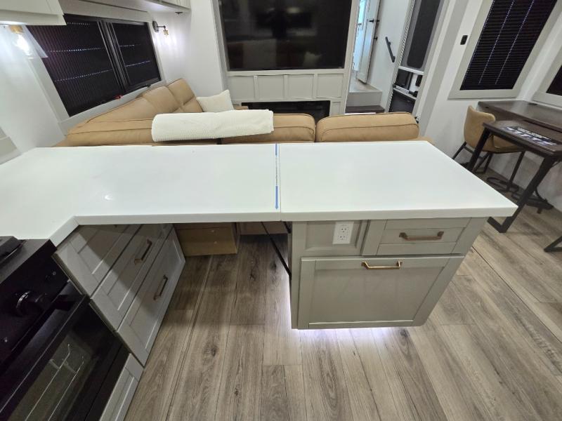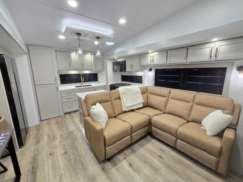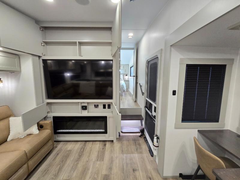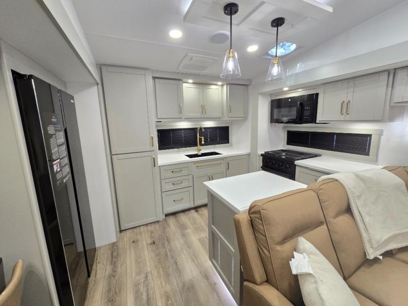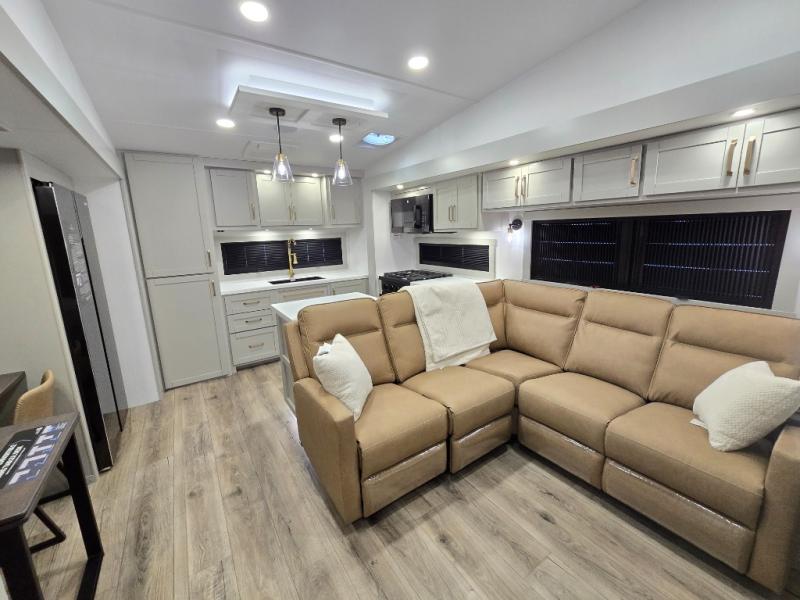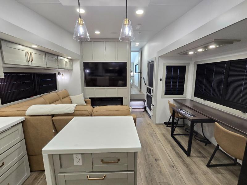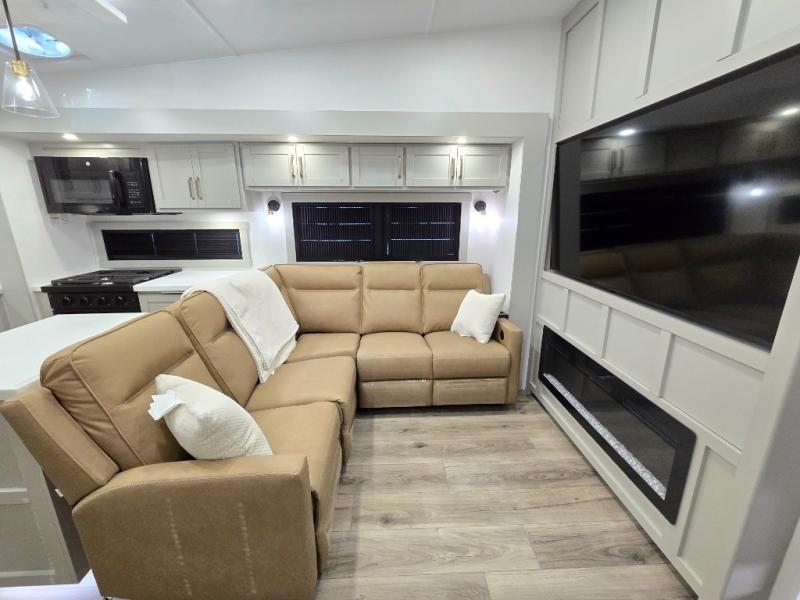 Featuring a spacious L-sofa with four recliners and a 65” articulating TV for endless entertainment, this fifth wheel is a great option to get on the road! The convertible dining table/L desk seats up to four people, making it perfect for meals, work, or play. You can cozy up by the fireplace and enjoy quality time with loved ones. Plus, ample shoe storage keeps your gear organized. The kitchen is equipped with solid surface countertops, dishwasher prep, a residential microwave, and a three-burner cooktop. Also, the large pantry with pull-out drawers provides ample storage for your favorite ingredients and cooking essentials. The one-piece fiberglass shower is a highlight of the bathroom, offering a convenient space to get ready, and additional storage is provided by the linen closet. And you will love the front main bedroom featuring a residential queen memory foam mattress with nightstands, outlets, and USB & USB-C ports for convenient charging.