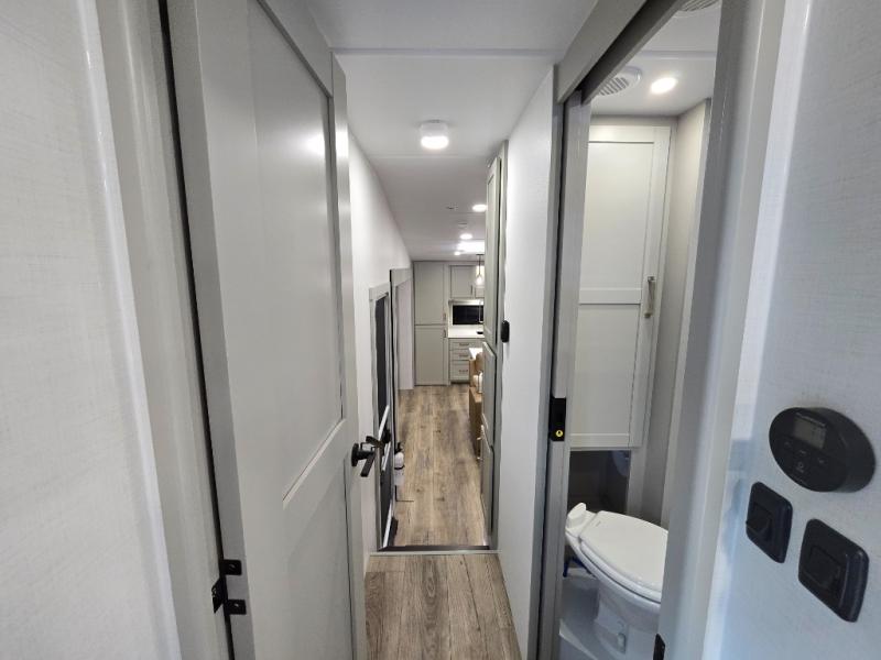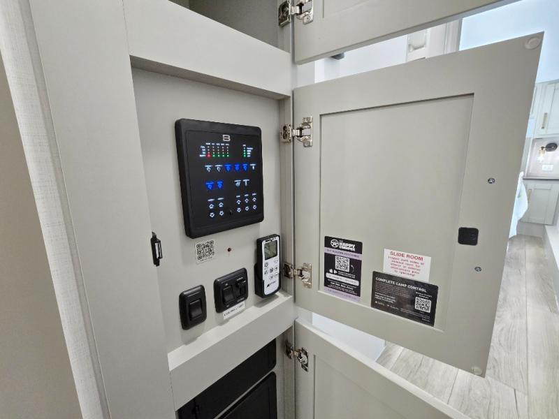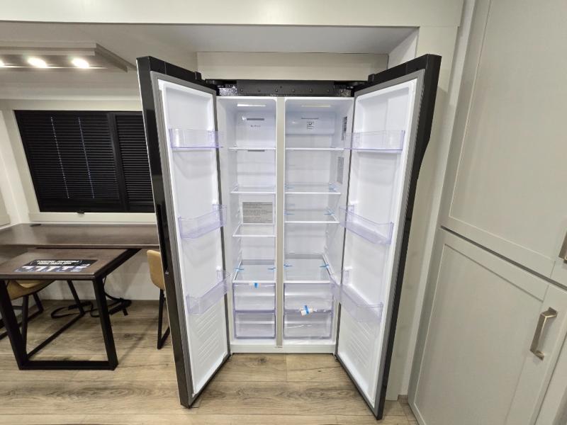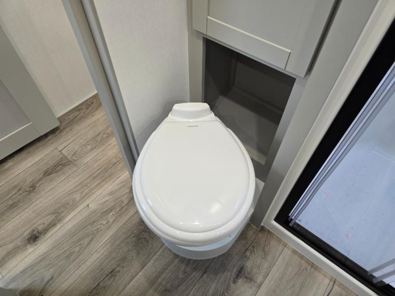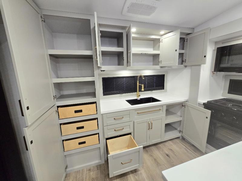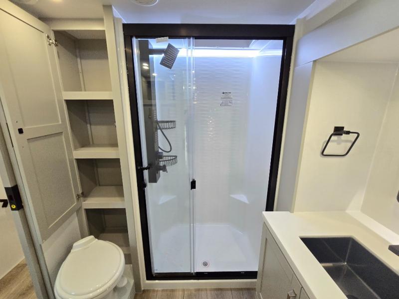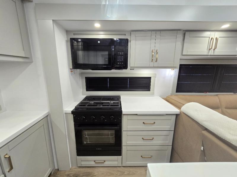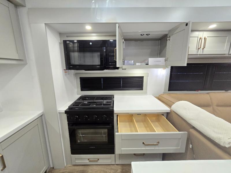 Featuring a spacious L-sofa with four recliners and a 65” articulating TV for endless entertainment, this fifth wheel is a great option to get on the road! The convertible dining table/L desk seats up to four people, making it perfect for meals, work, or play. You can cozy up by the fireplace and enjoy quality time with loved ones. Plus, ample shoe storage keeps your gear organized. The kitchen is equipped with solid surface countertops, dishwasher prep, a residential microwave, and a three-burner cooktop. Also, the large pantry with pull-out drawers provides ample storage for your favorite ingredients and cooking essentials. The one-piece fiberglass shower is a highlight of the bathroom, offering a convenient space to get ready, and additional storage is provided by the linen closet. And you will love the front main bedroom featuring a residential queen memory foam mattress with nightstands, outlets, and USB & USB-C ports for convenient charging.