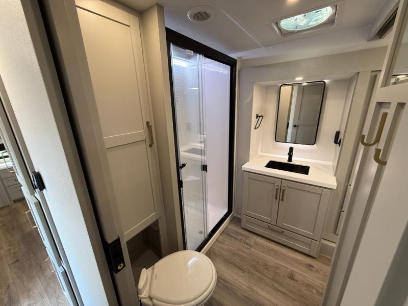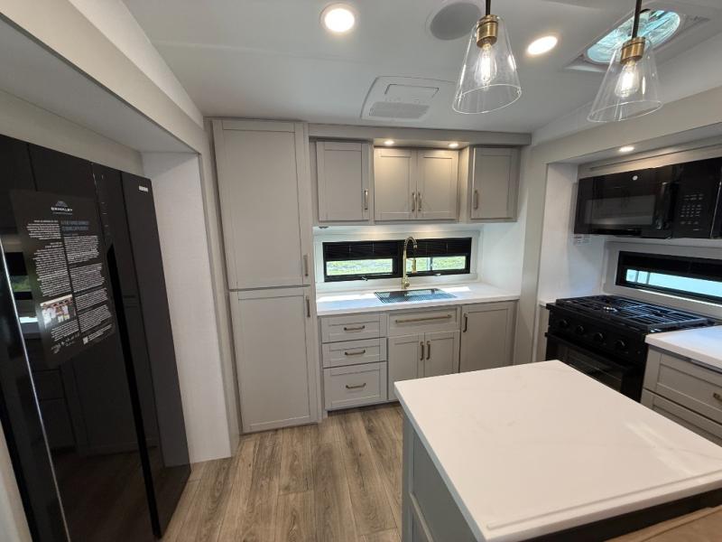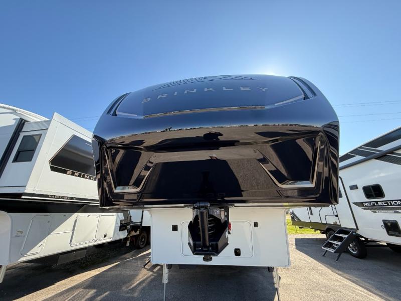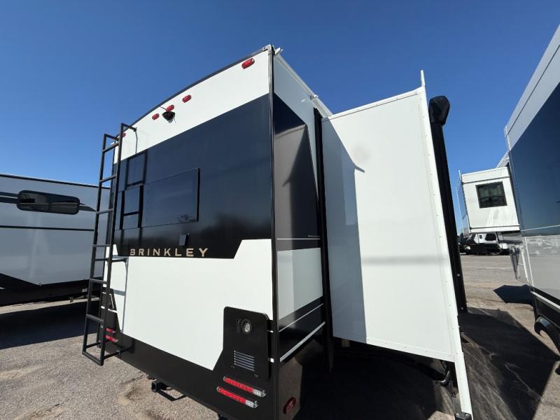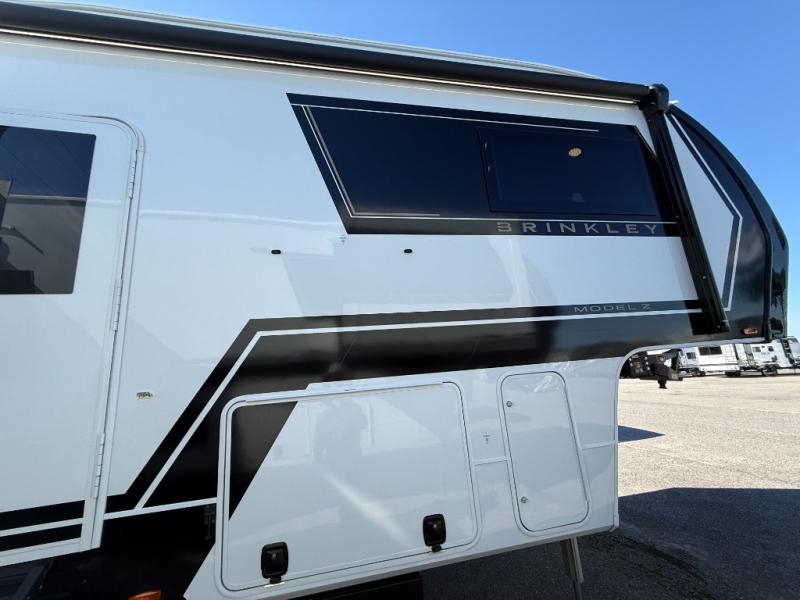 The Brinkley mid-profile Model Z fifth wheels bring you clean lines and an upscale look with plenty of style and exciting new features like the industry first brass plumbing connections. These units also feature an automotive grade front cap, plenty of exterior storage, exterior hot and cold showers, and wide stance leveling jacks for easy set up. Residential frameless windows provide a clean look and beautiful views, and ample electrical outlets and 6 USB/USB-C outlets allow all of your electronics and appliances to easily be used and charged.