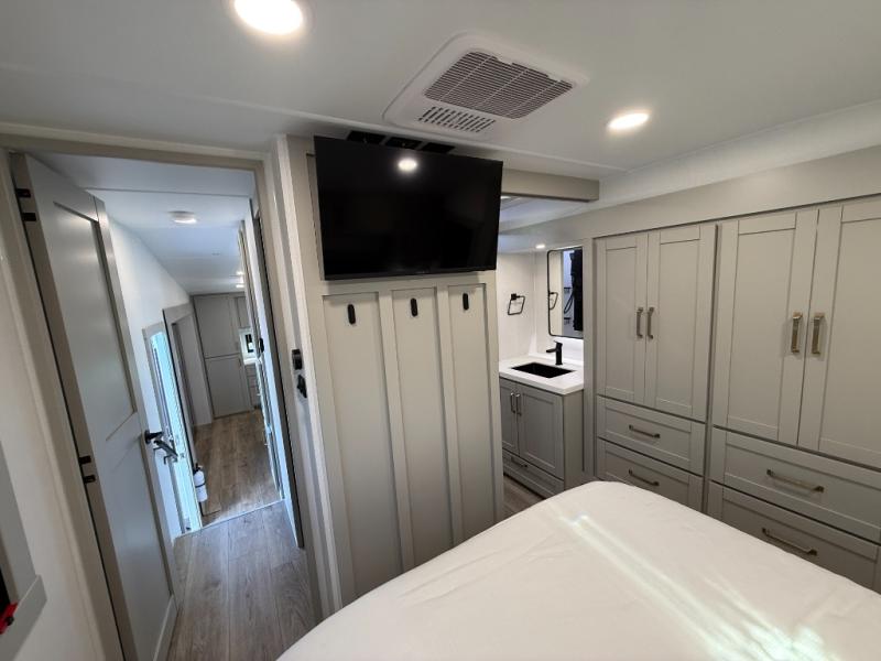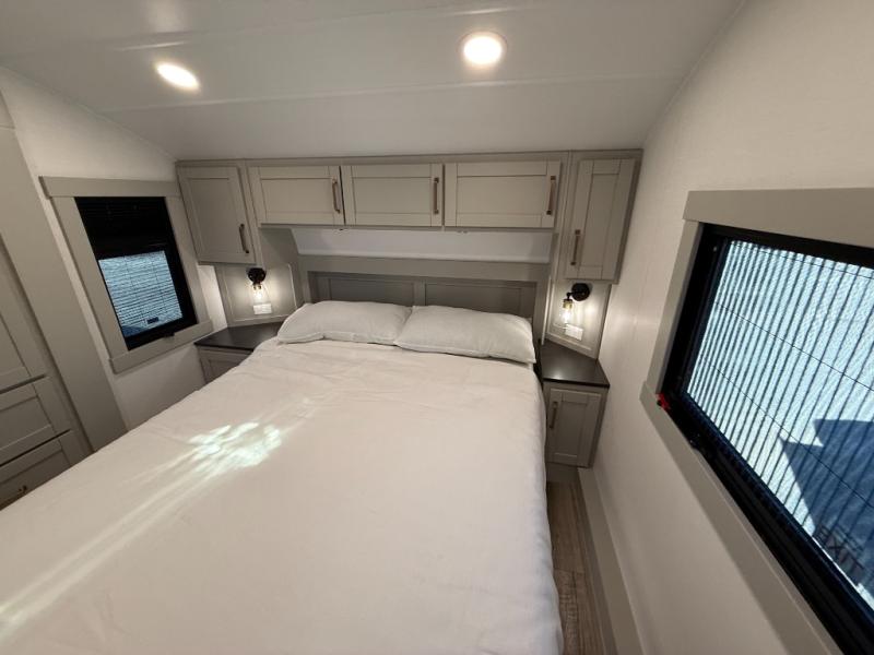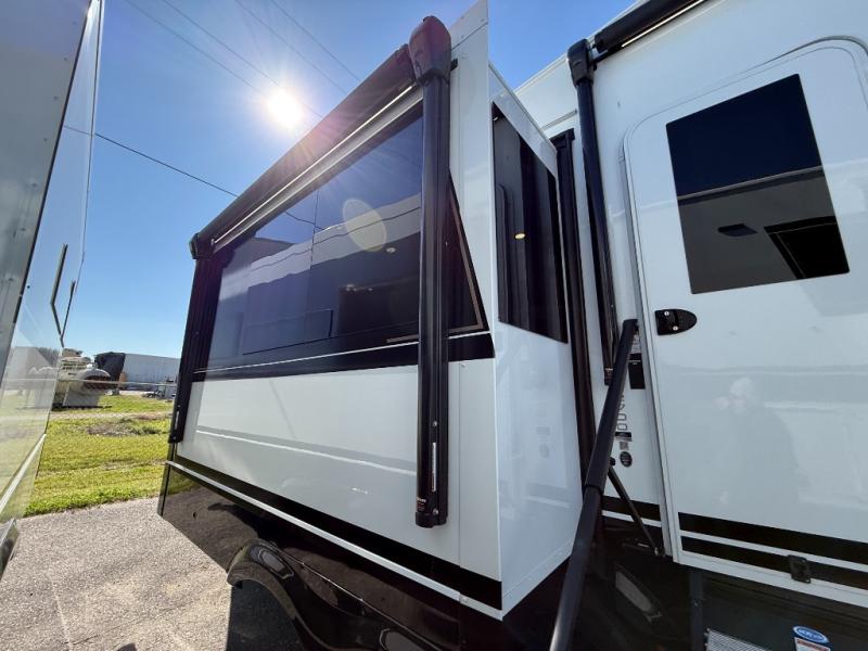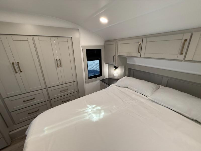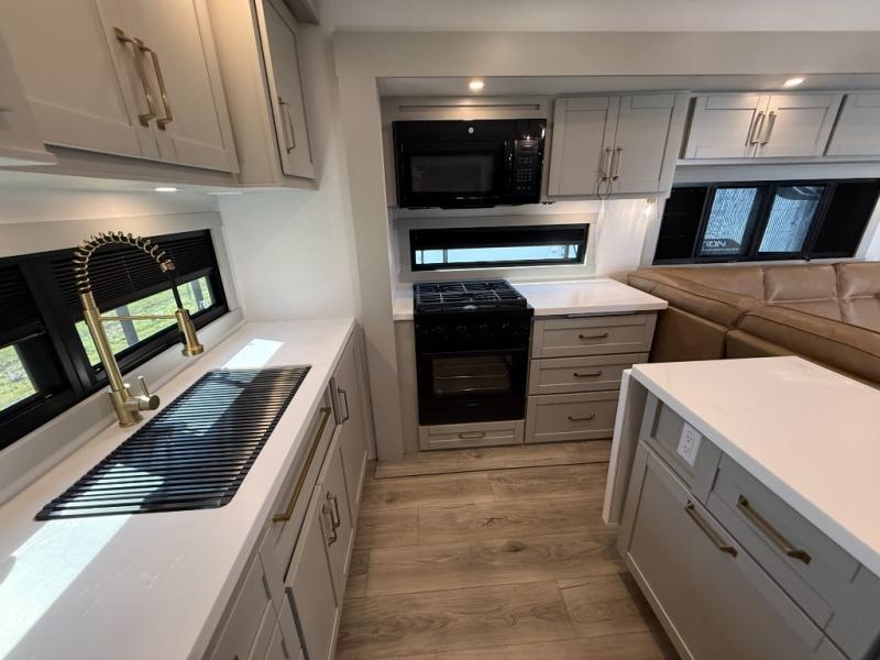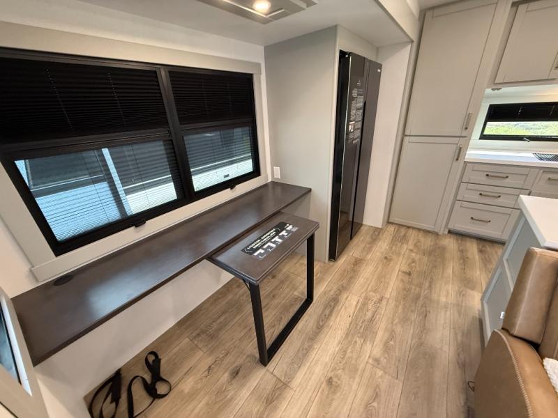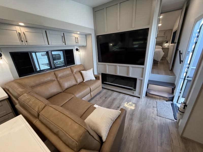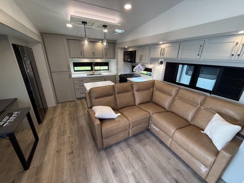 Featuring a spacious L-sofa with four recliners and a 65” articulating TV for endless entertainment, this fifth wheel is a great option to get on the road! The convertible dining table/L desk seats up to four people, making it perfect for meals, work, or play. You can cozy up by the fireplace and enjoy quality time with loved ones. Plus, ample shoe storage keeps your gear organized. The kitchen is equipped with solid surface countertops, dishwasher prep, a residential microwave, and a three-burner cooktop. Also, the large pantry with pull-out drawers provides ample storage for your favorite ingredients and cooking essentials. The one-piece fiberglass shower is a highlight of the bathroom, offering a convenient space to get ready, and additional storage is provided by the linen closet. And you will love the front main bedroom featuring a residential queen memory foam mattress with nightstands, outlets, and USB & USB-C ports for convenient charging.