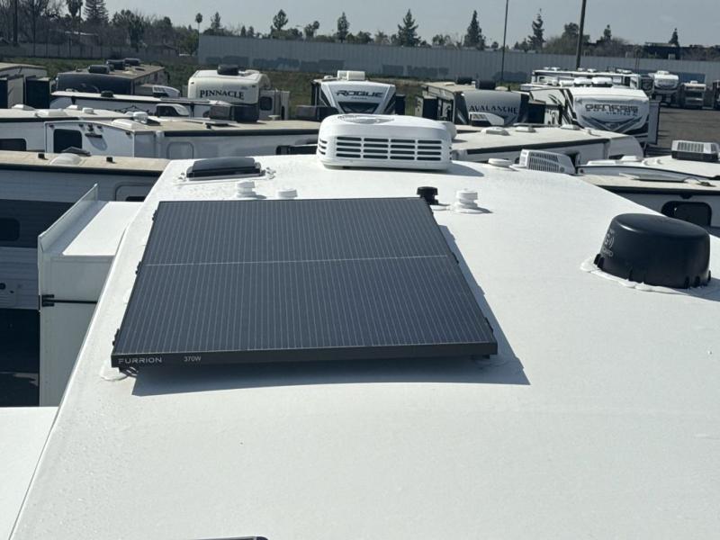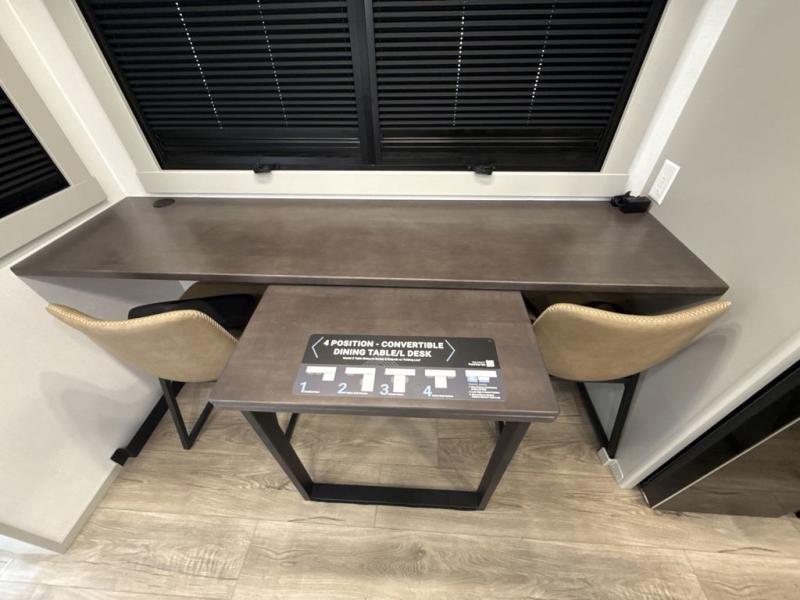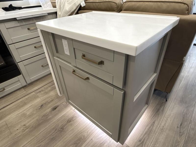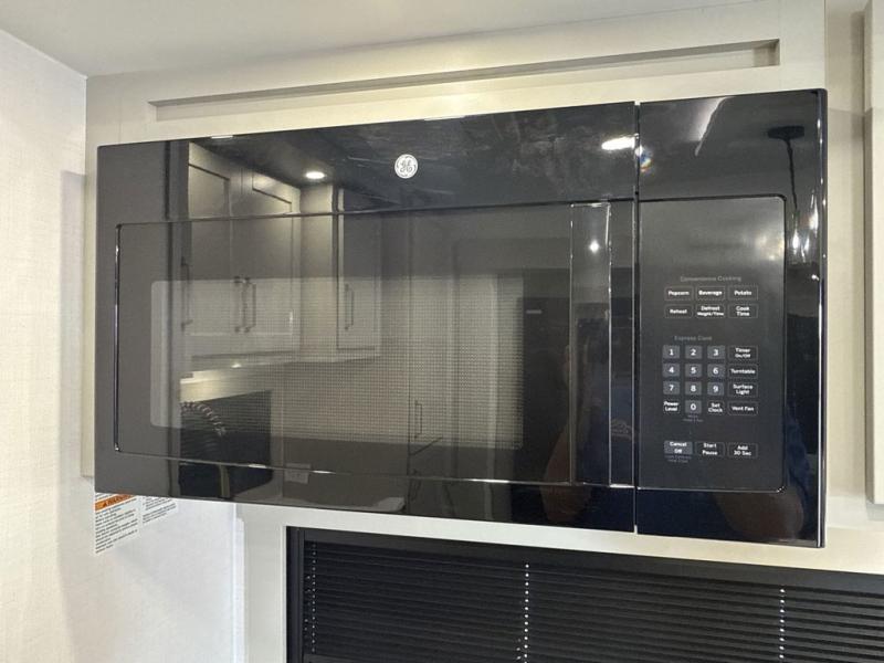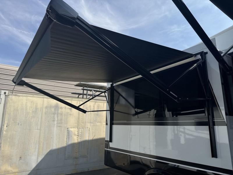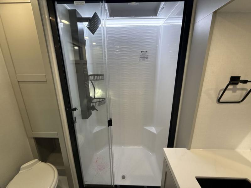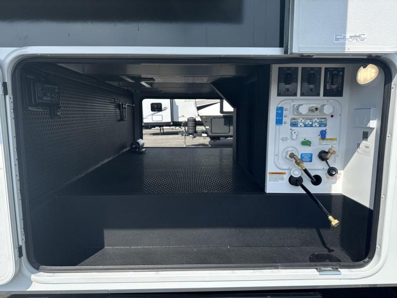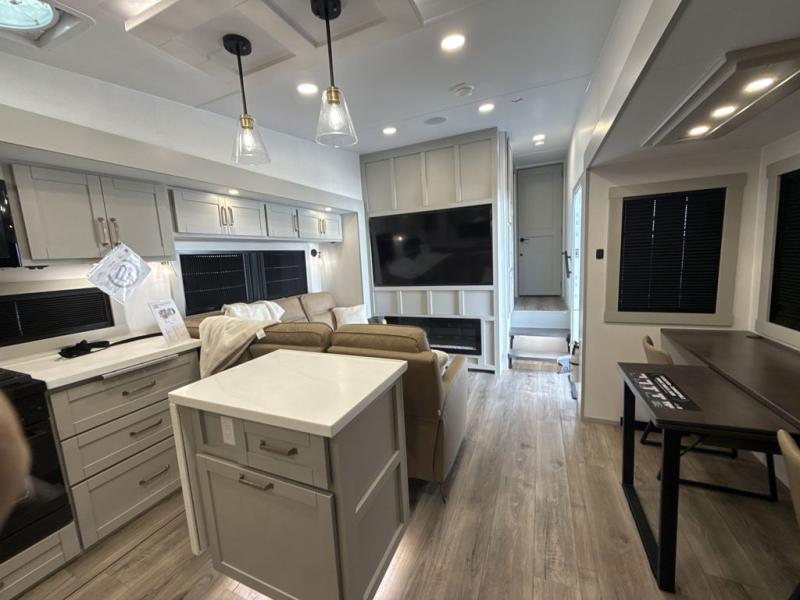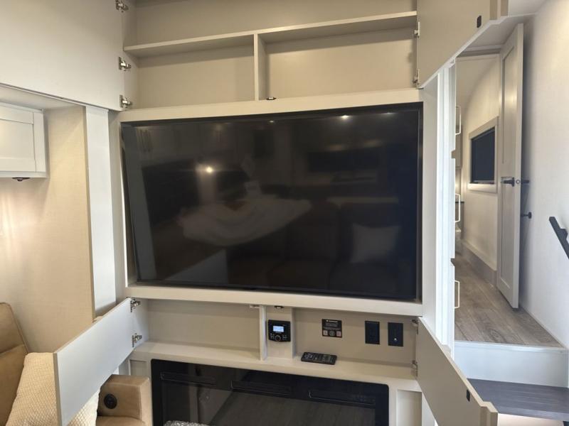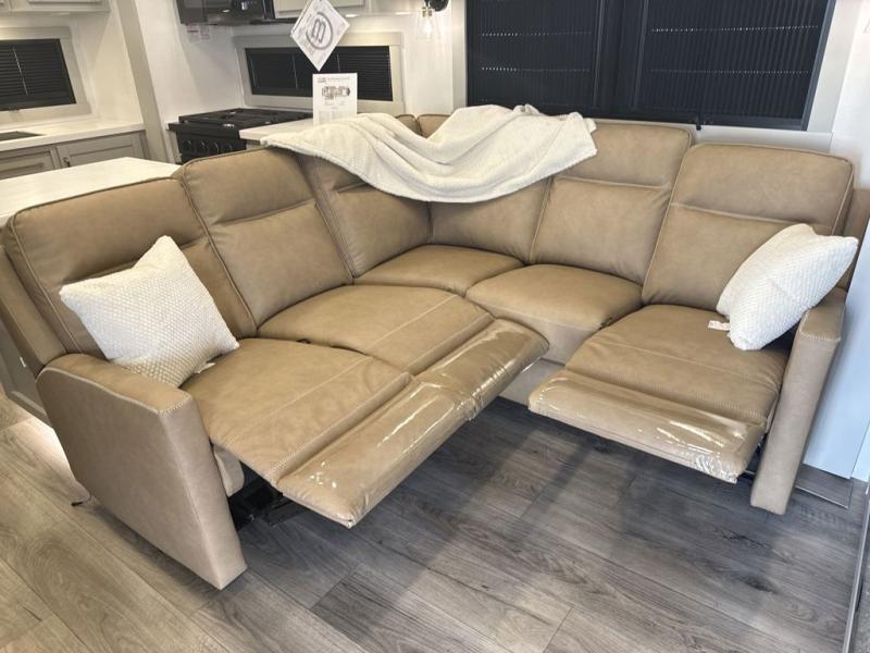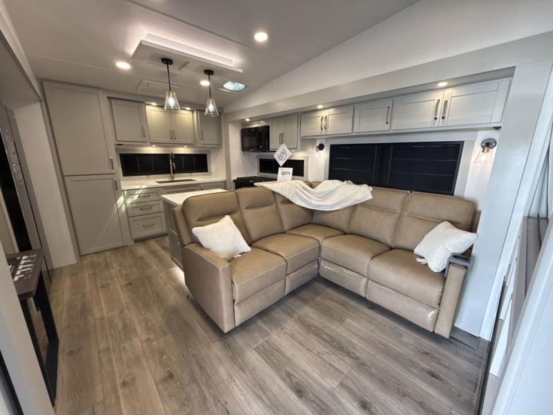 Featuring a spacious L-sofa with four recliners and a 65” articulating TV for endless entertainment, this fifth wheel is a great option to get on the road! The convertible dining table/L desk seats up to four people, making it perfect for meals, work, or play. You can cozy up by the fireplace and enjoy quality time with loved ones. Plus, ample shoe storage keeps your gear organized. The kitchen is equipped with solid surface countertops, dishwasher prep, a residential microwave, and a three-burner cooktop. Also, the large pantry with pull-out drawers provides ample storage for your favorite ingredients and cooking essentials. The one-piece fiberglass shower is a highlight of the bathroom, offering a convenient space to get ready, and additional storage is provided by the linen closet. And you will love the front main bedroom featuring a residential queen memory foam mattress with nightstands, outlets, and USB & USB-C ports for convenient charging.