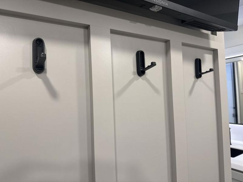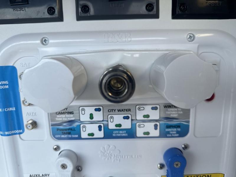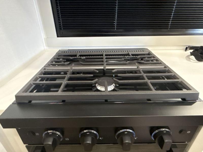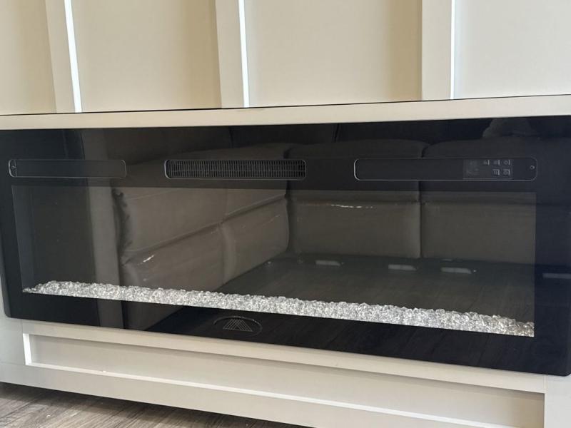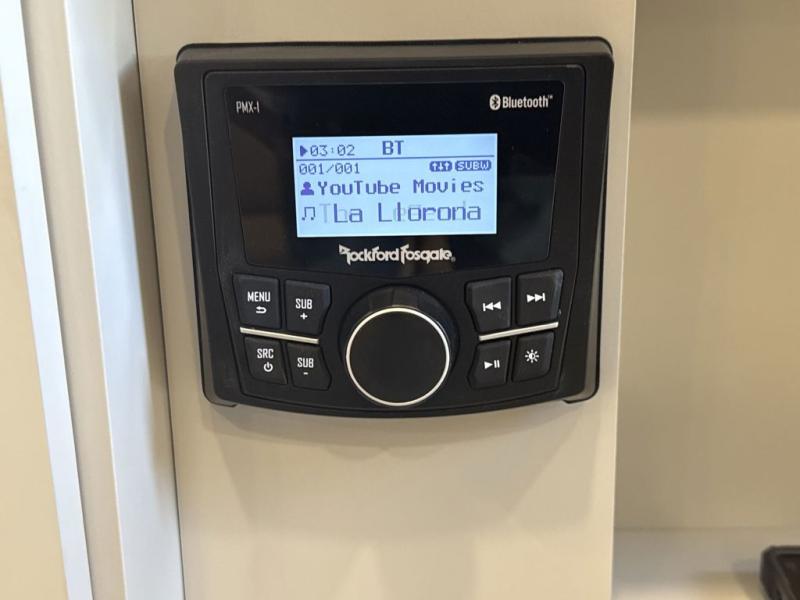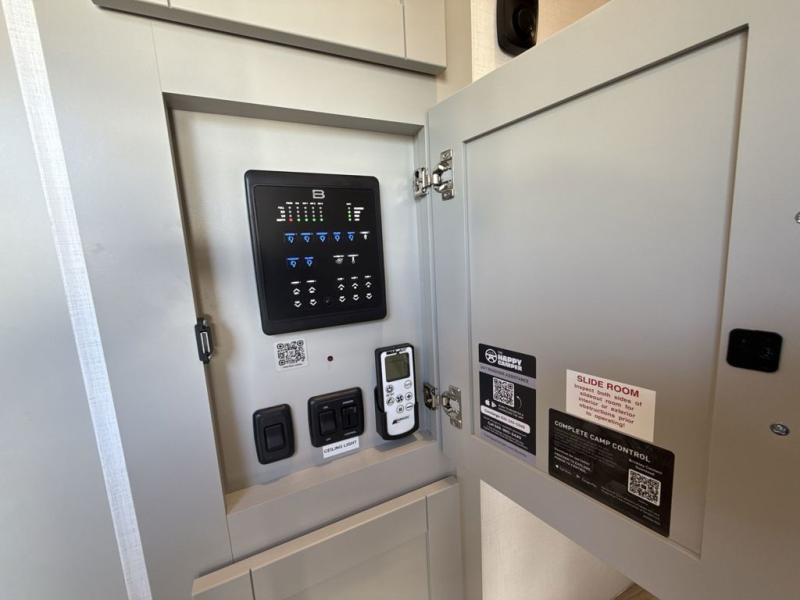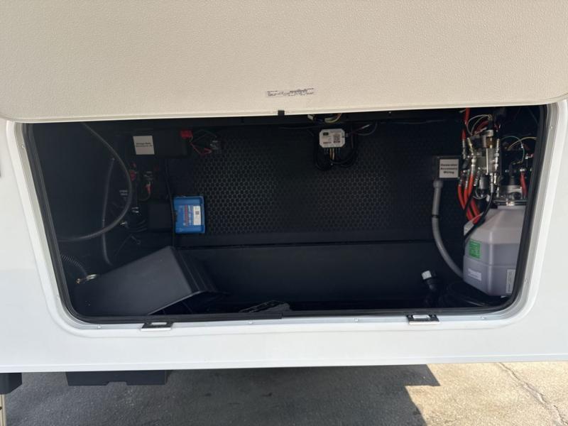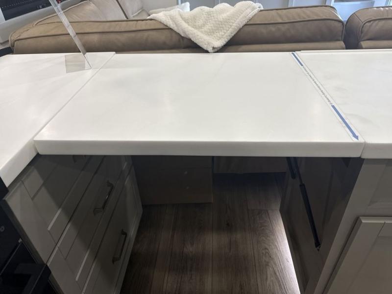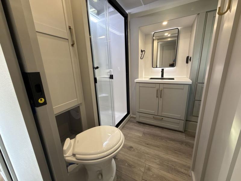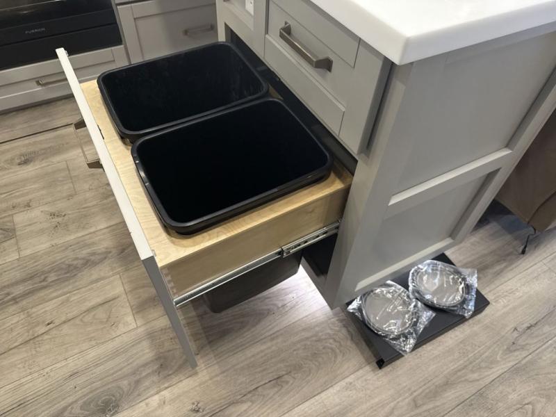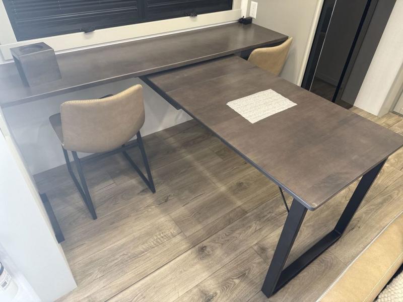 Featuring a spacious L-sofa with four recliners and a 65” articulating TV for endless entertainment, this fifth wheel is a great option to get on the road! The convertible dining table/L desk seats up to four people, making it perfect for meals, work, or play. You can cozy up by the fireplace and enjoy quality time with loved ones. Plus, ample shoe storage keeps your gear organized. The kitchen is equipped with solid surface countertops, dishwasher prep, a residential microwave, and a three-burner cooktop. Also, the large pantry with pull-out drawers provides ample storage for your favorite ingredients and cooking essentials. The one-piece fiberglass shower is a highlight of the bathroom, offering a convenient space to get ready, and additional storage is provided by the linen closet. And you will love the front main bedroom featuring a residential queen memory foam mattress with nightstands, outlets, and USB & USB-C ports for convenient charging.