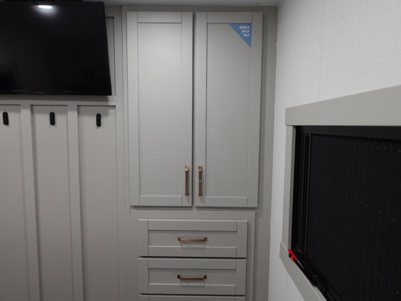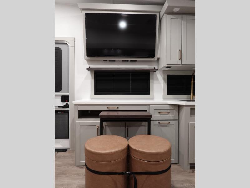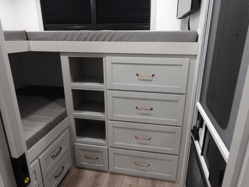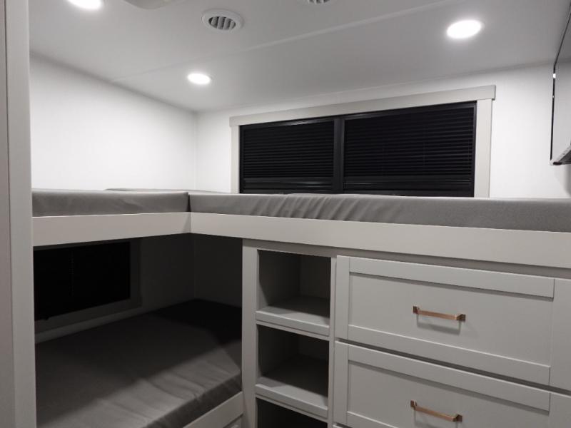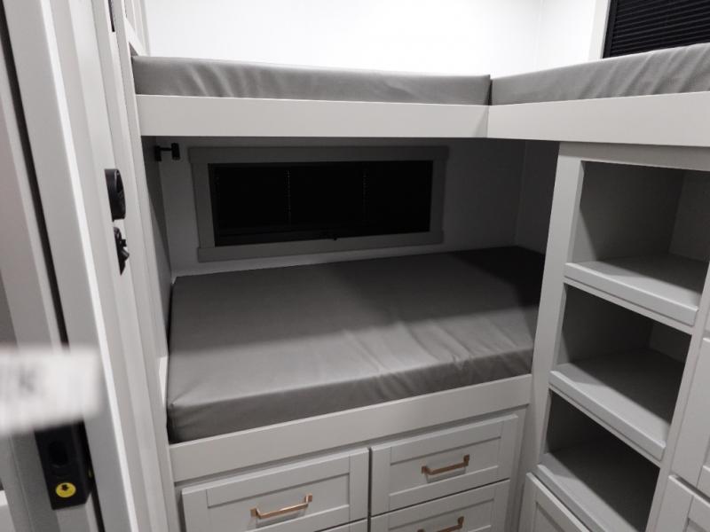 Start living your best camping life in this fifth wheel! The rear bunkhouse has an L shaped 72" x 92" x 32" top bunk above cubbies and a 44" x 72" bottom bunk, plus its very own private entrance/exit door to the unit. Just outside the bunkhouse is the kitchen which has everything you need to prepare your best home cooked meals including a flip-up countertop extension, a trash bin with Stow N' Go paper towel, and an area prepped for a dishwasher. Enjoy your delicious home cooked meals at the sliding dining/desk table then relax on either the 62" theater seating or 64" tri-fold sofa that extends into a 54" x 70" bed for more guests. As you step up the stairs to head up to the full bathroom and front private bedroom, you will notice that they have shoe storage to keep things tidy. Crank up the tunes with the exterior speakers and grab a cold beverage from the exterior refrigerator with storage drawers near it too!